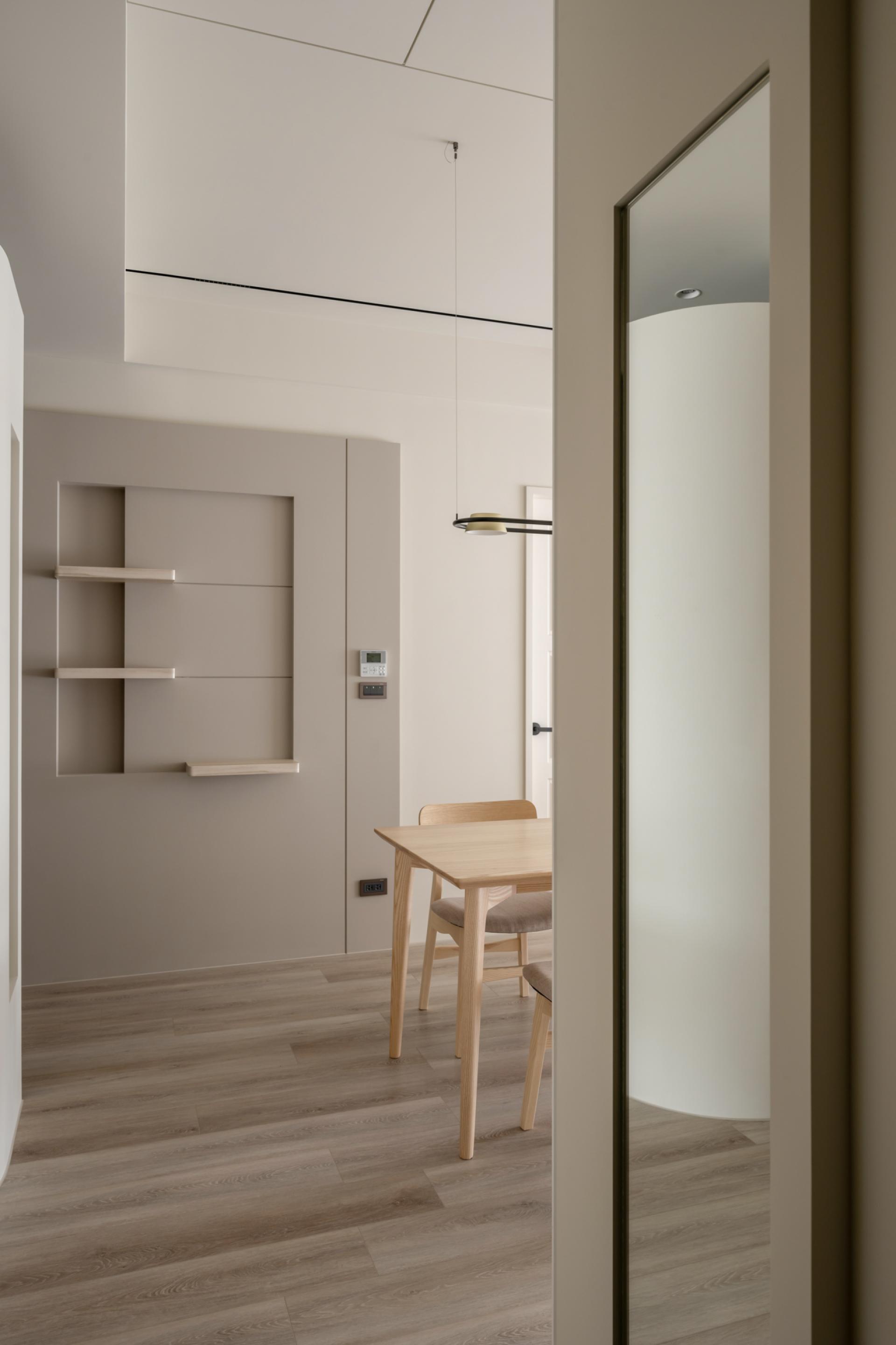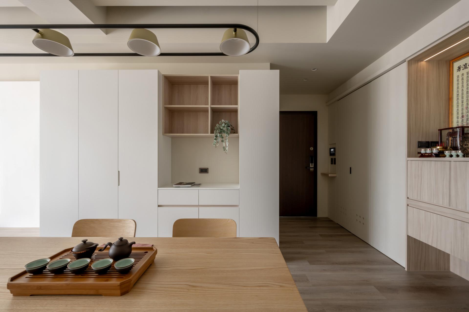 With tea tasting and interaction as the core, the public area creates a highly interactive life field for owners who love to make tea and entertain guests. The open living and dining room is equipped with a large dining table and a comfortable sofa area to ensure the flexible use of the space, which can accommodate a party or tea tasting for a large number of people, but also create a pleasant daily atmosphere when there are just two people, so that the space can freely change between lively and quiet atmosphere.
