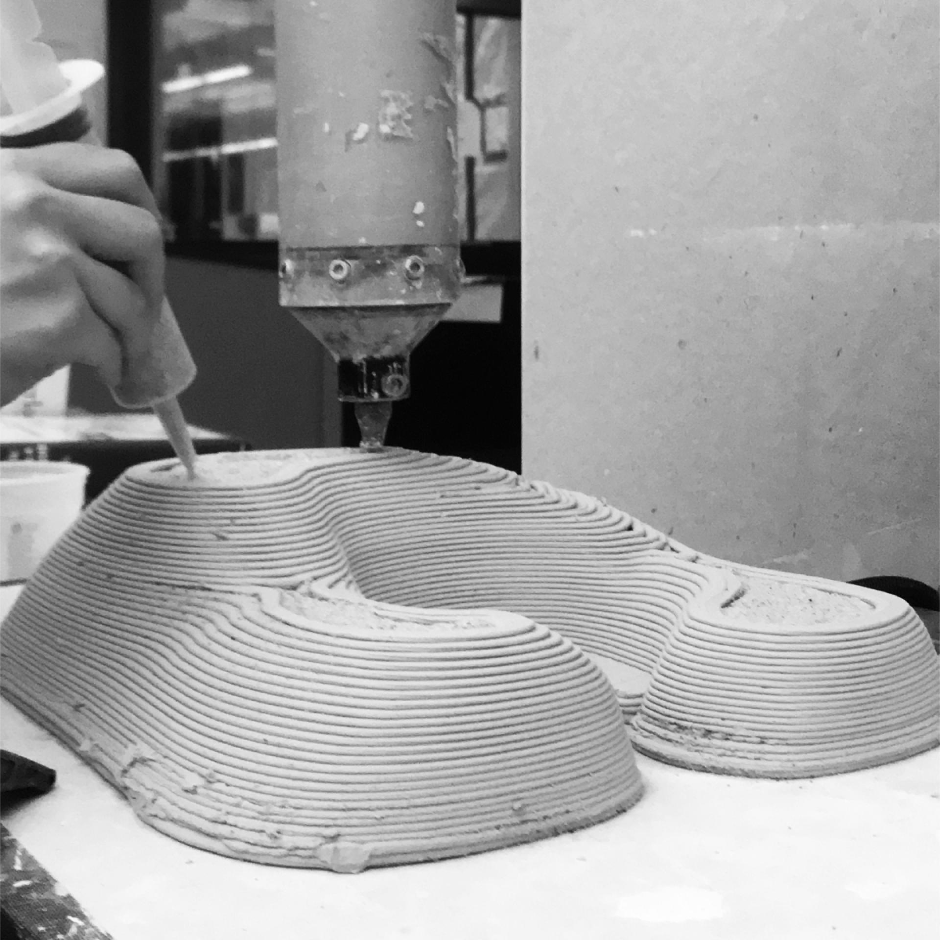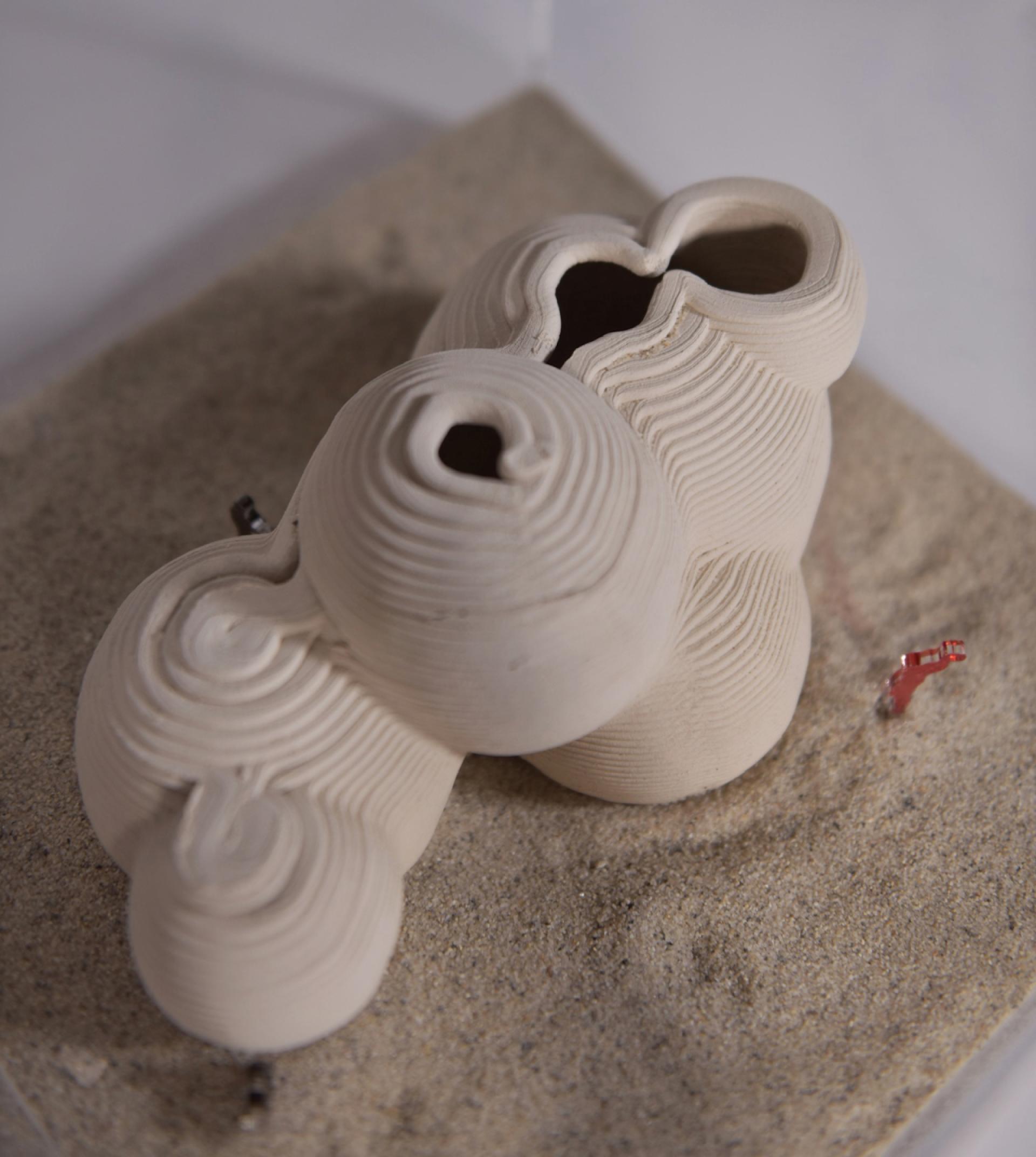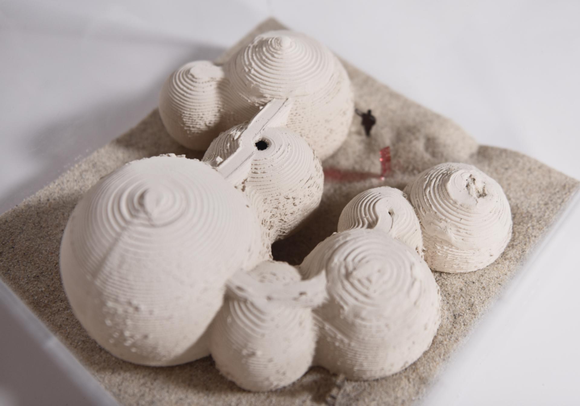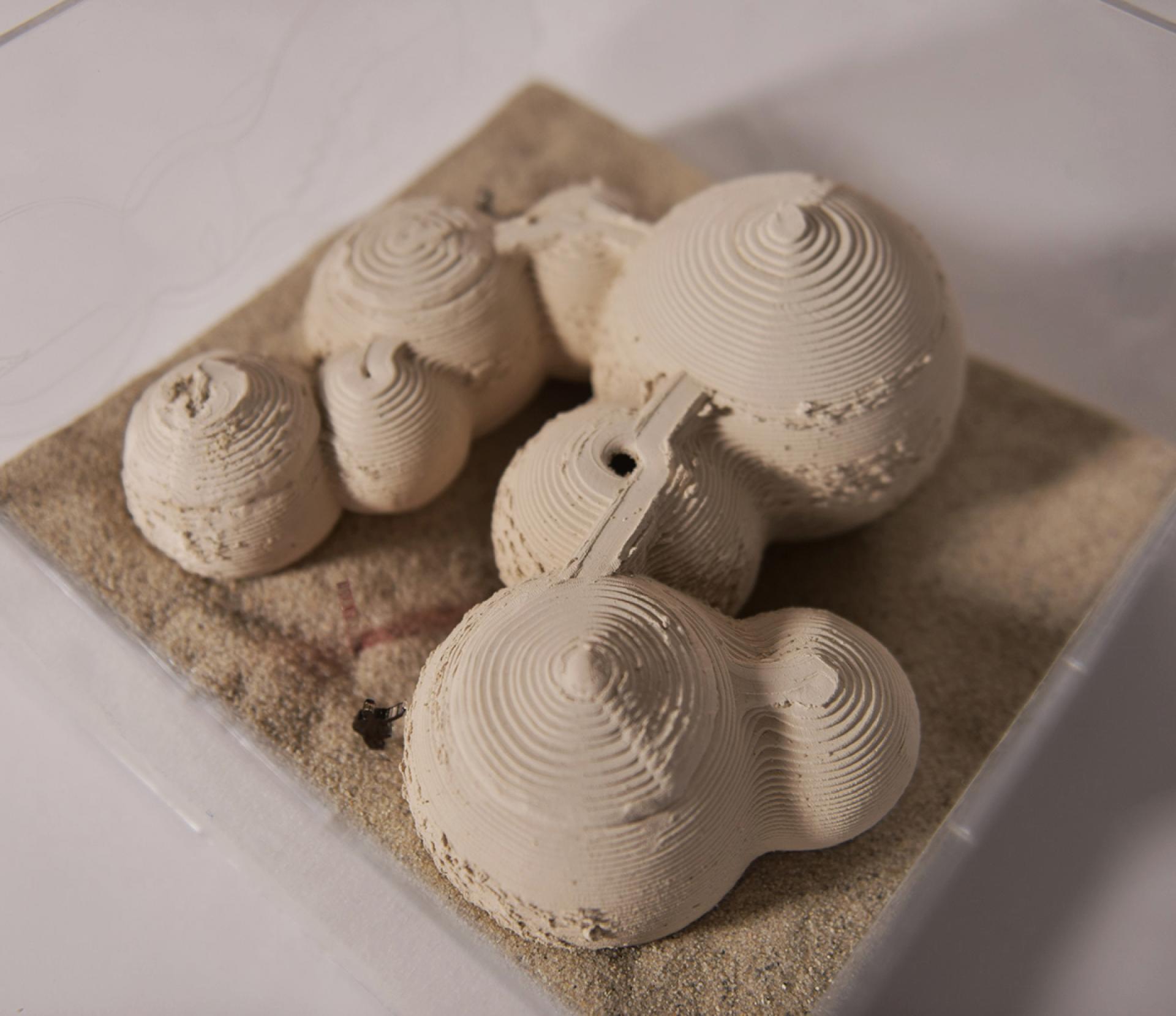 This project explores advanced 3D printing techniques using clay. Through layered deposition and computational toolpath strategies, the research investigates how texture, structure, and spatial logic can be encoded directly into the fabrication process. The printed forms—ranging from woven facades to metaball-inspired domes—demonstrate how material performance and architectural expression can emerge simultaneously. Sand was used not only as a temporary support during printing but as an active participant in shaping form, with its shifting heights influencing the outer contour of the structures. This dynamic between additive technique and responsive form sets the groundwork for new modes of construction.