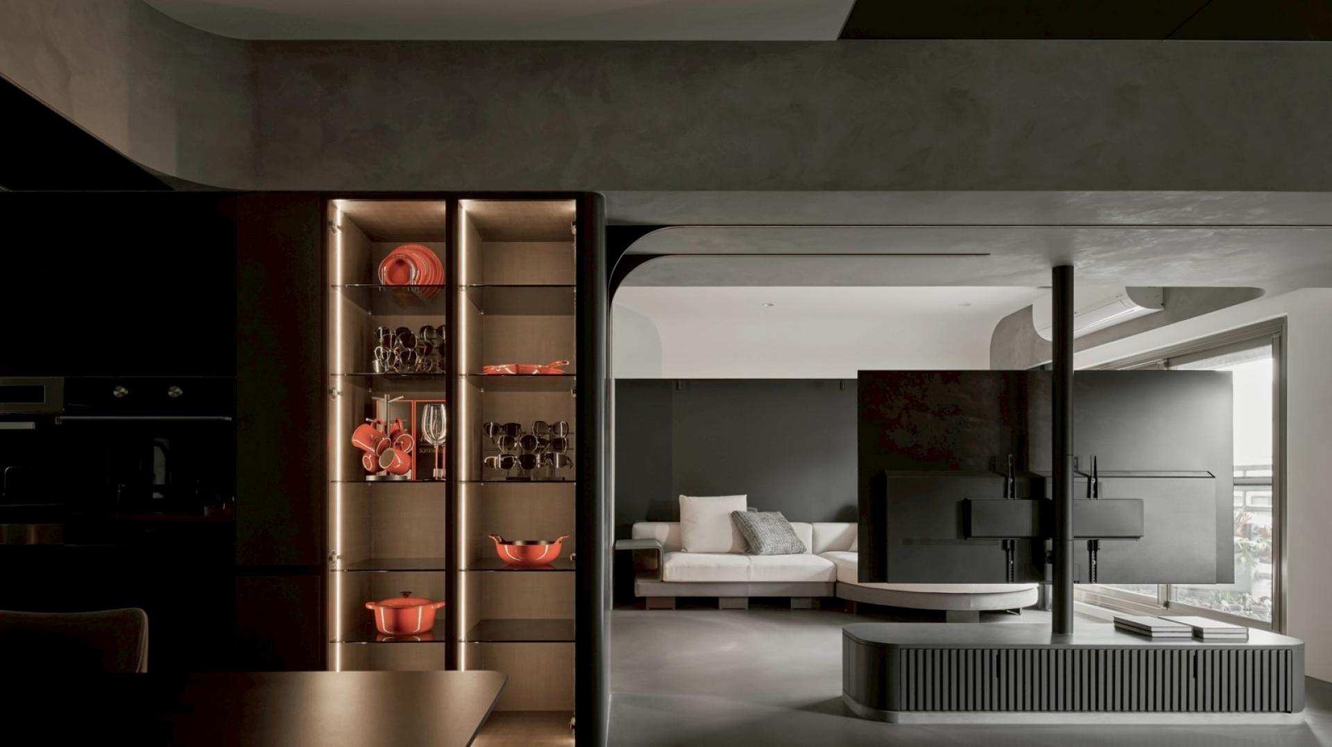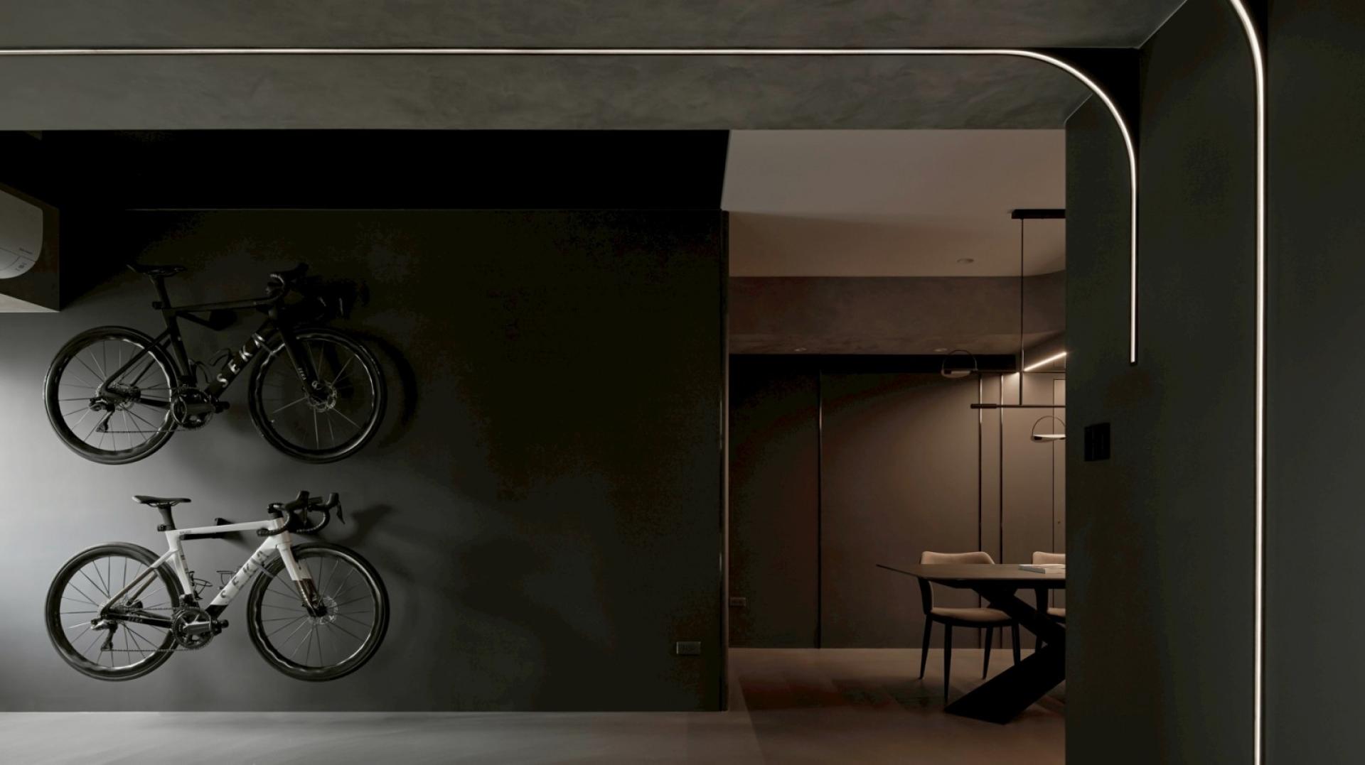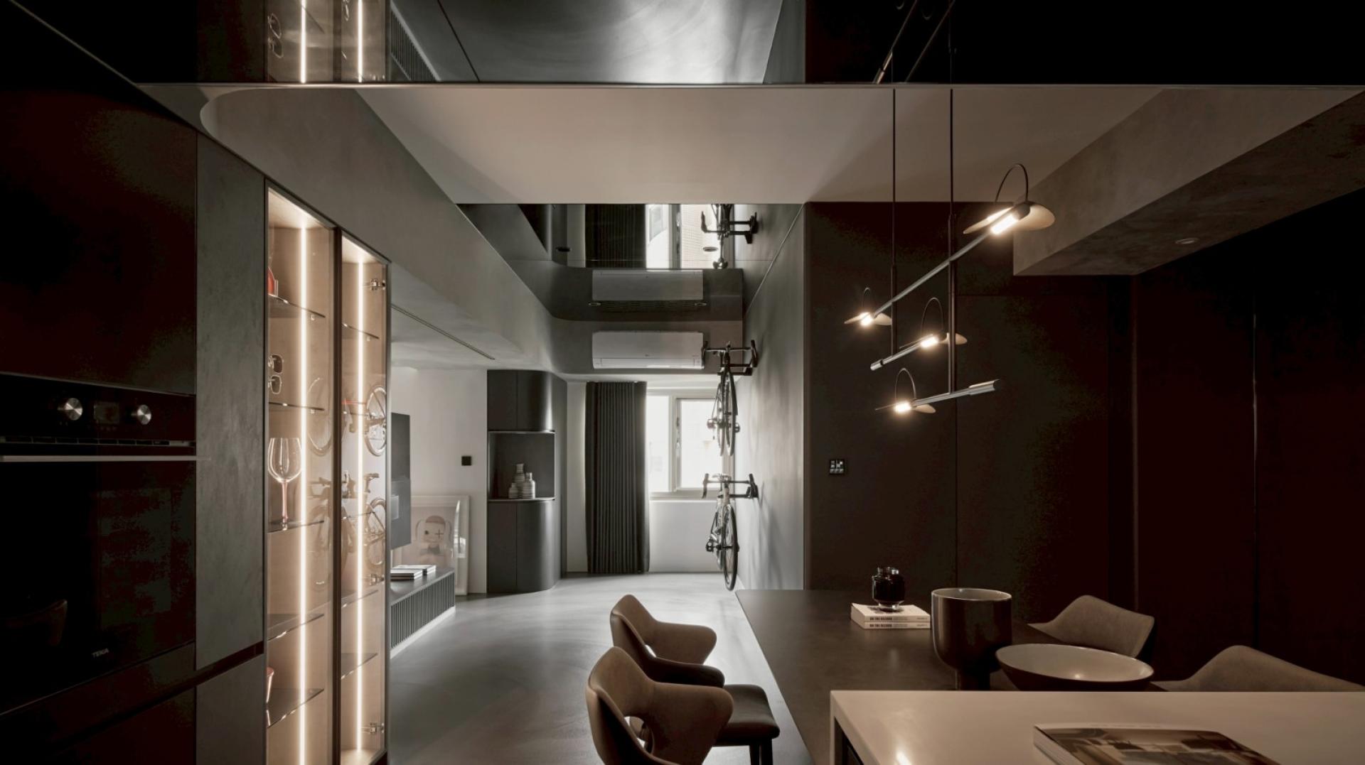 As the TV pivots, a multifunctional area with a charcoal grey backdrop comes into view. A suspended road bike serves as a focal point, anchoring the space with understated visual clarity. The deep textures extend into the dining room and kitchen, where warm amber lighting softens the cool tones, cultivating a cozy and calming dining atmosphere. Within the interplay of dark materials and shifting light, the space embodies a harmonious balance of strength and softness. Materials, tones, and lighting are intricately woven together — not only fulfilling functional and aesthetic needs but also shaping a cozy living environment uniquely tailored to personalities.