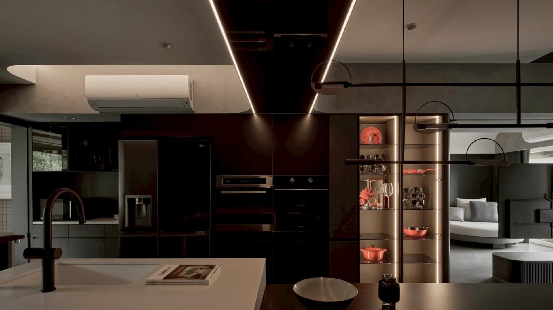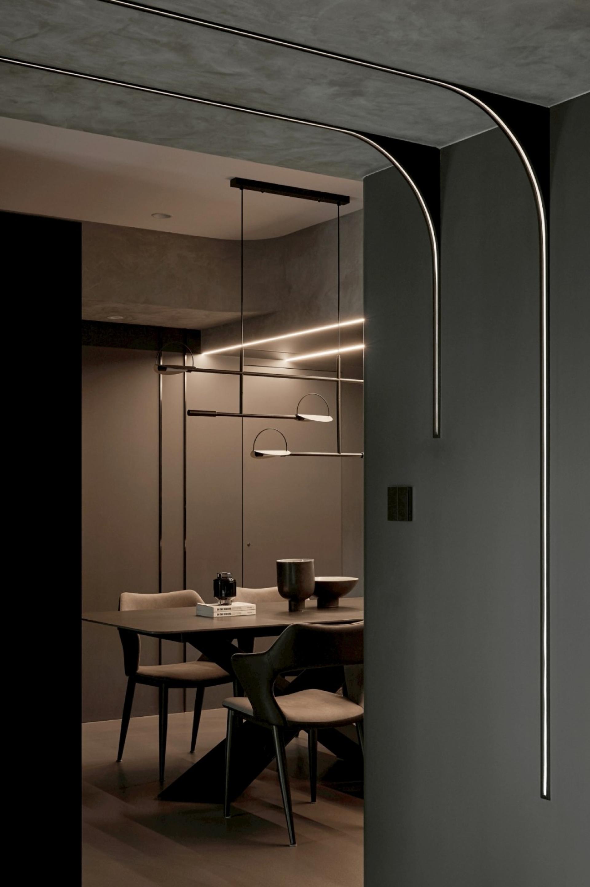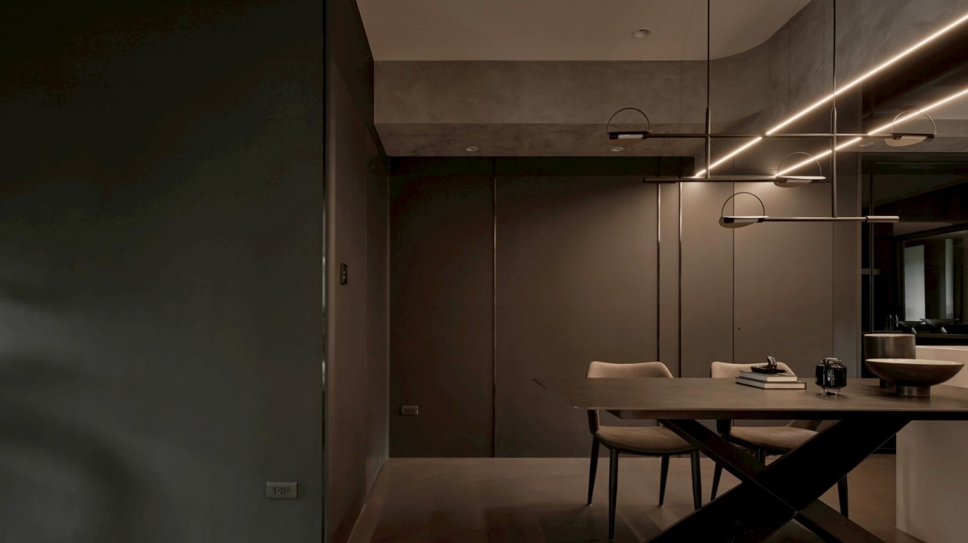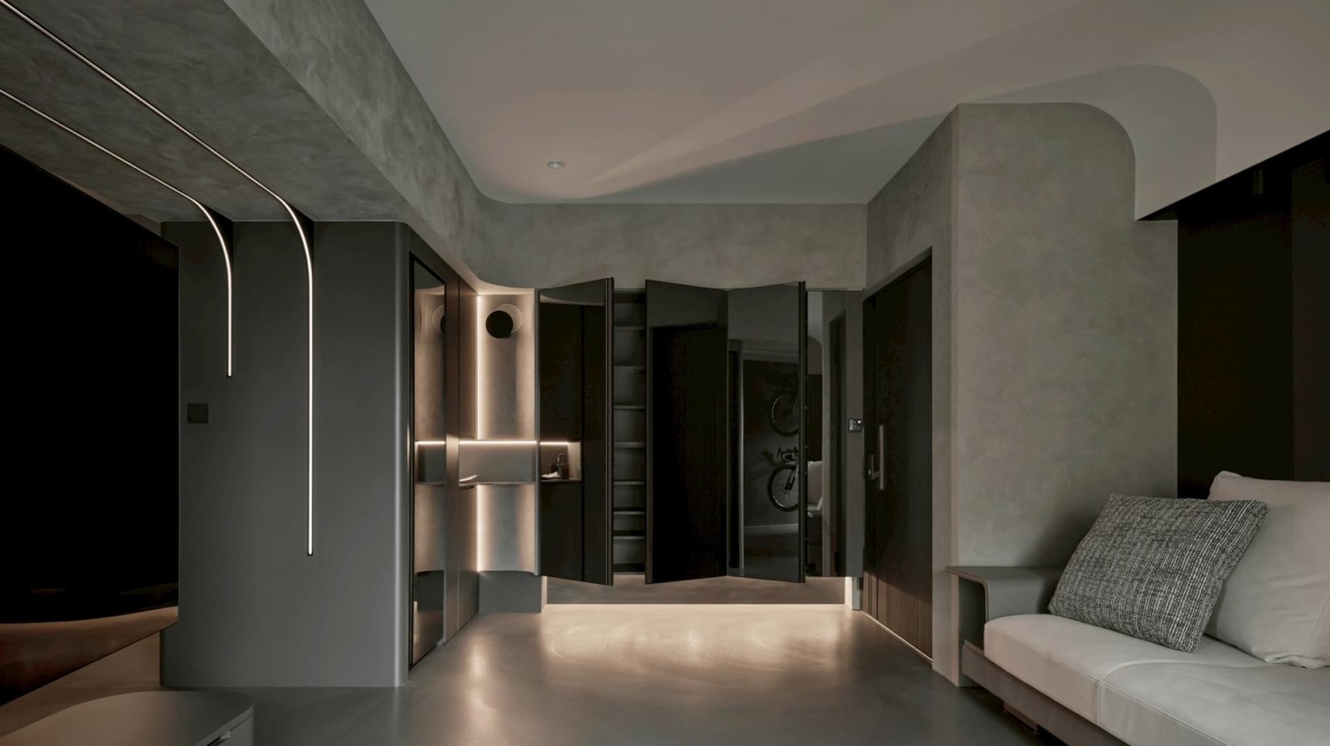 As the TV pivots, a multifunctional area with a charcoal grey backdrop comes into view. A suspended road bike serves as a focal point, anchoring the space with understated visual clarity. The deep textures extend into the dining room and kitchen, where warm amber lighting softens the cool tones, cultivating a cozy and calming dining atmosphere. Within the interplay of dark materials and shifting light, the space embodies a harmonious balance of strength and softness. Materials, tones, and lighting are intricately woven together — not only fulfilling functional and aesthetic needs but also shaping a cozy living environment uniquely tailored to personalities.
