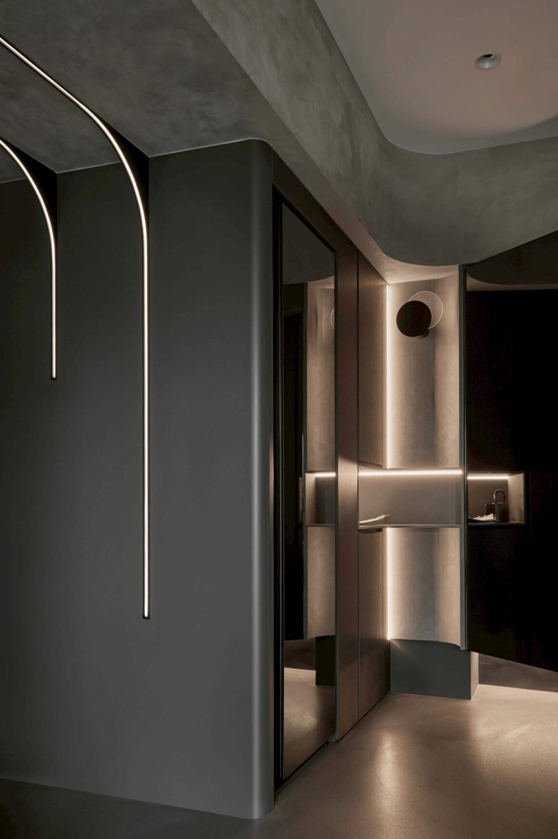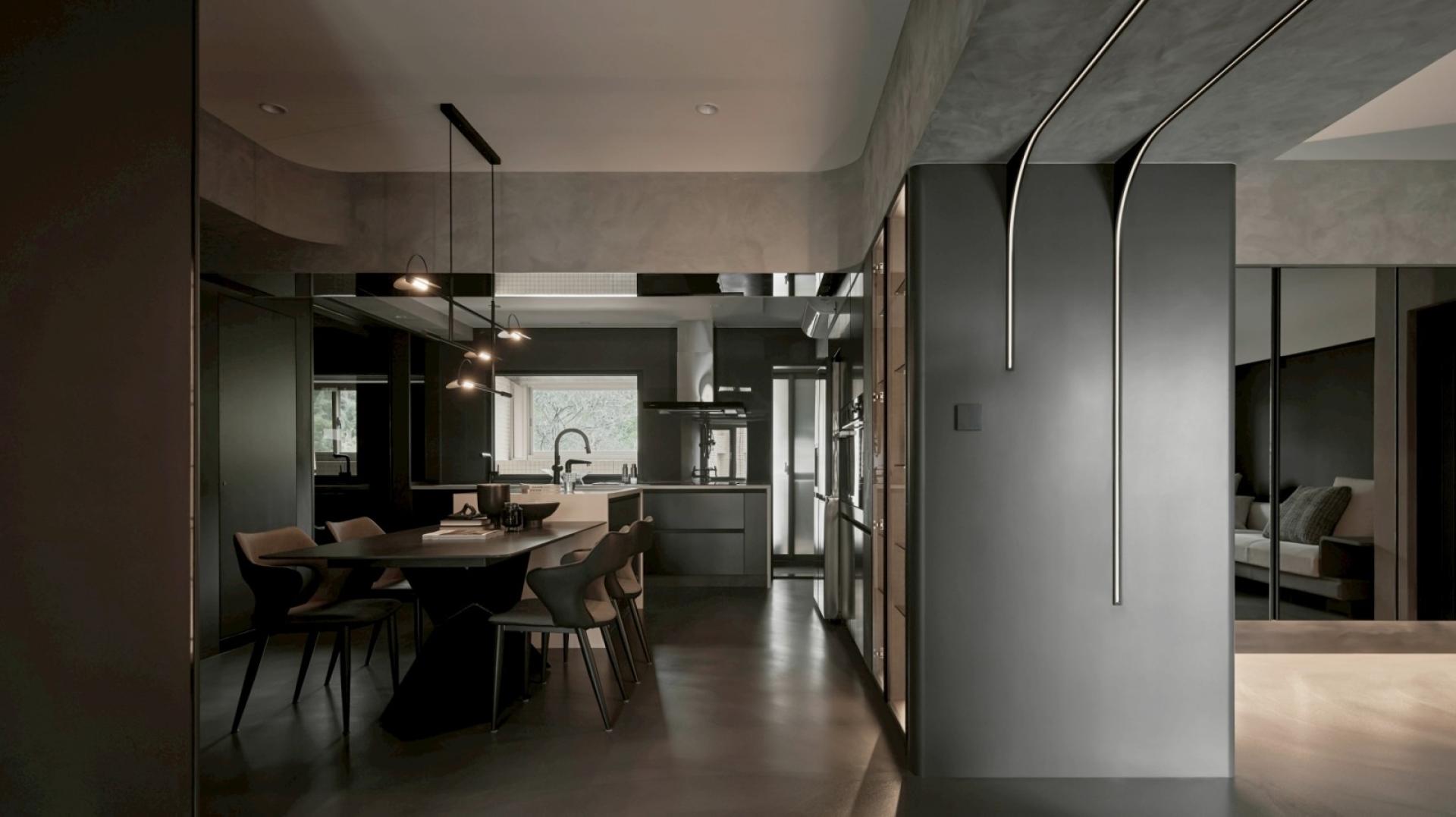 With a dark-toned base, the home reveals a refined modern aesthetic that balances depth with sophistication. Layers of grey tones build a space that exudes warmth and rustic elegance. A streamlined light band cuts through the area, shaping a smooth visual flow and infusing a sense of lightness into the calm ambiance. Glass and mirrors expand the visual depth, blurring boundaries through reflection and transparency, allowing light and shadow to freely flow throughout the space.