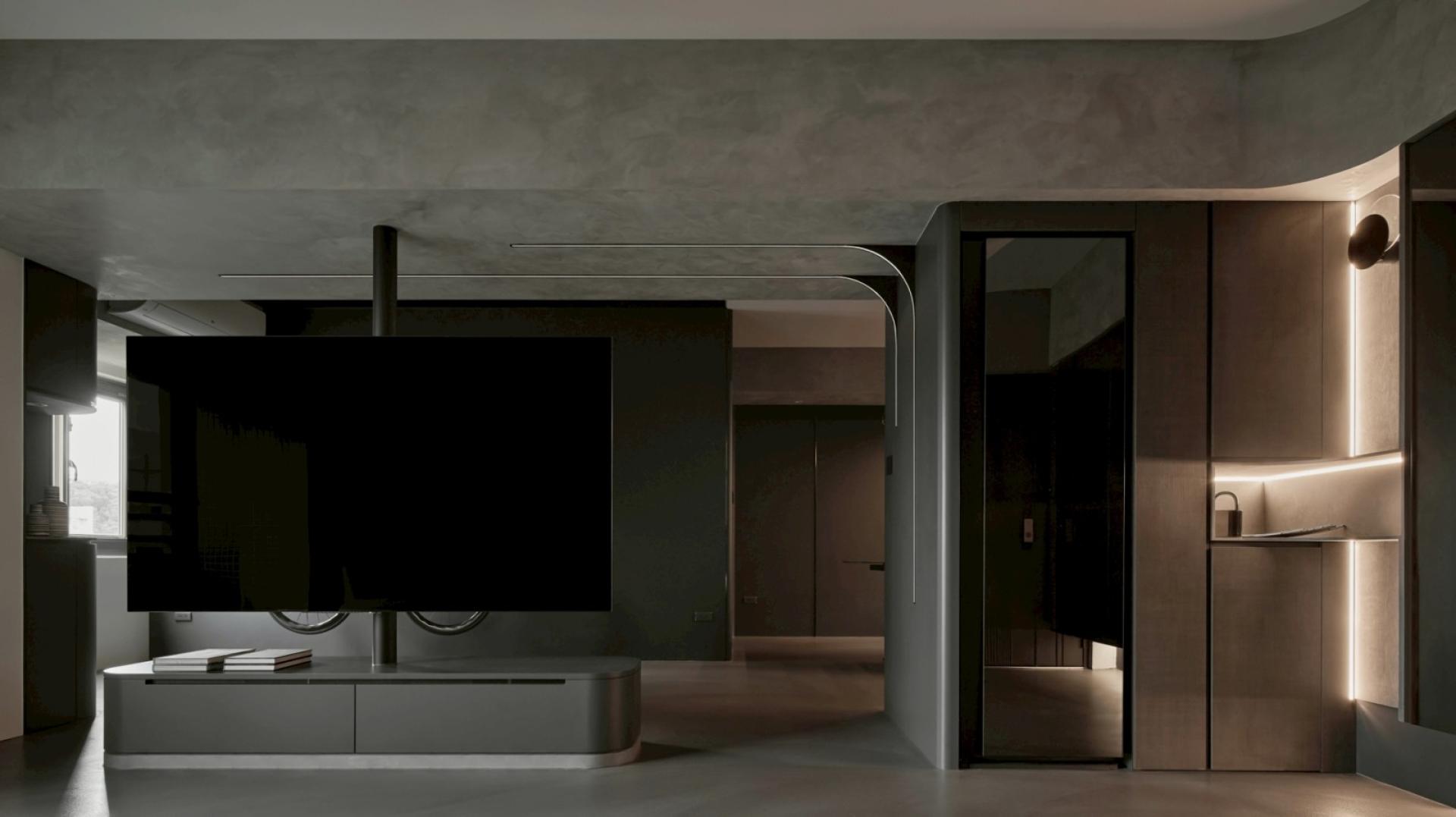 At the entryway, a floating shoe cabinet is placed beneath the beam, with a grey-tinted mirror softly diffusing the light, infusing the space with a warm glow. Curved transitions gently guide the eye, seamlessly leading to integrated storage and an electronic wardrobe that elevate functionality. Instead of a conventional TV wall, a rotating TV unit is employed to preserve the continuity of light, and sightlines, creating an environment that inspires emotional connection and comfort. A linear light strip elegantly traces the span of the low beam, subtly dissolving its visual weight while infusing the dark-toned interior with a refined sense of dynamic tension.