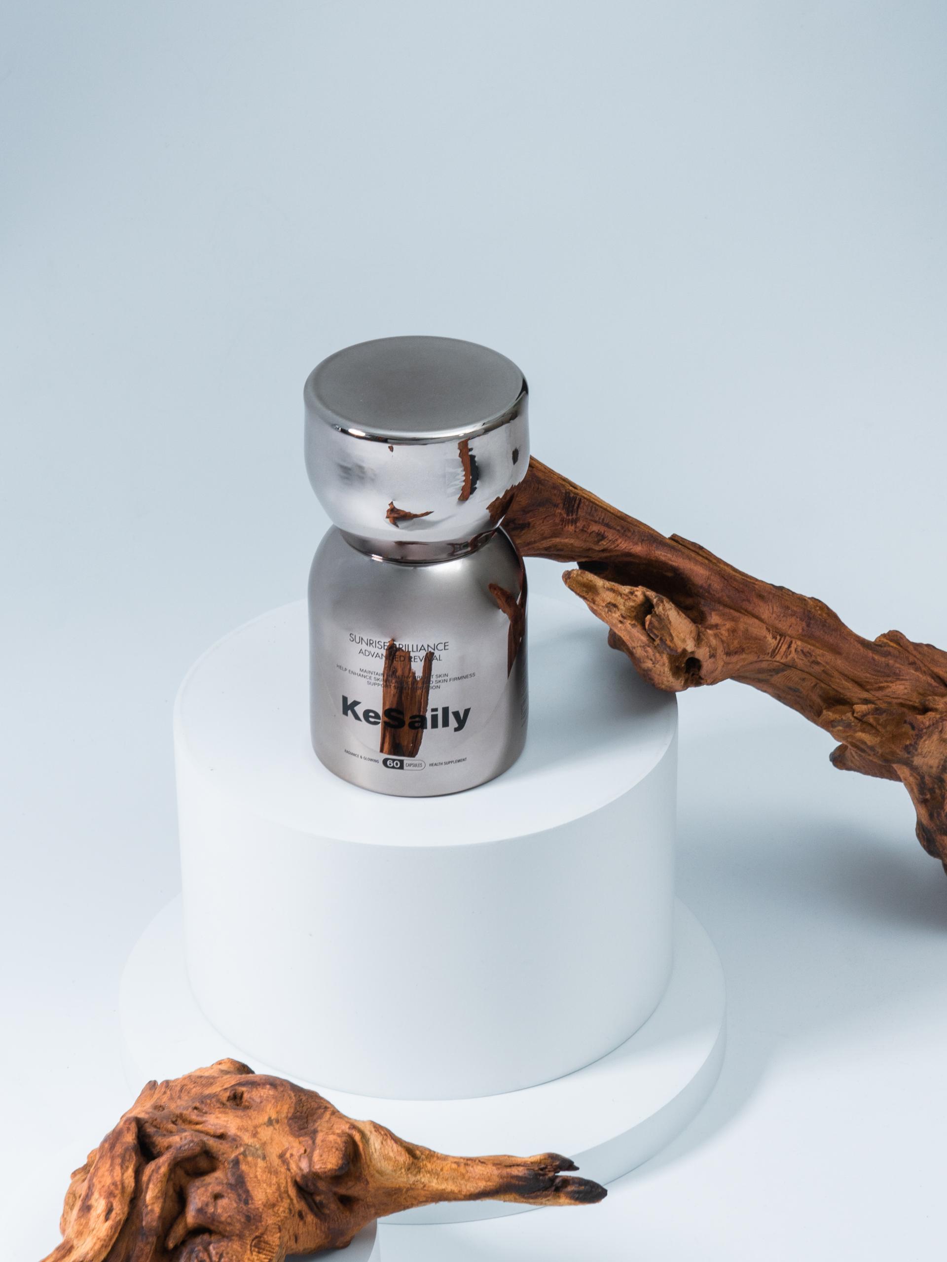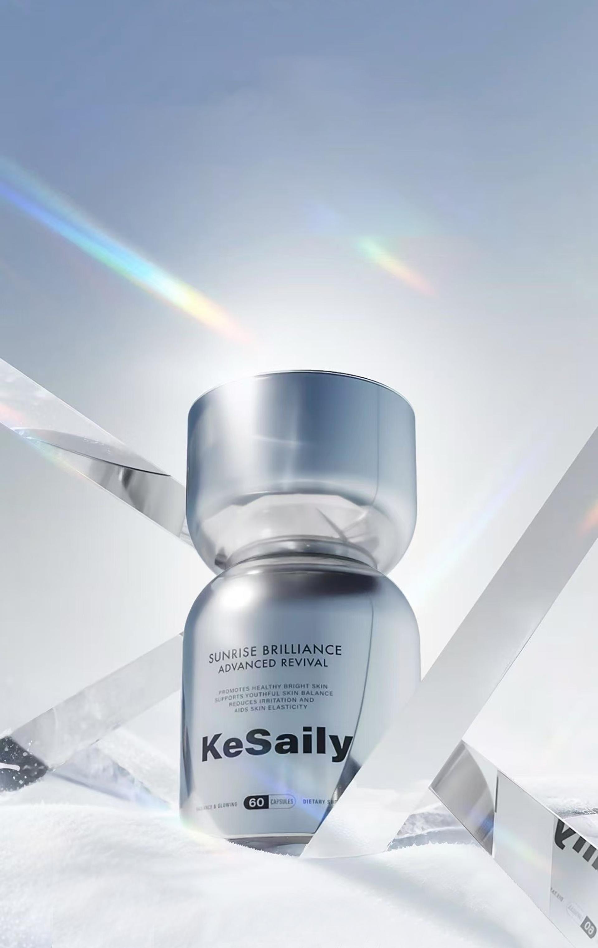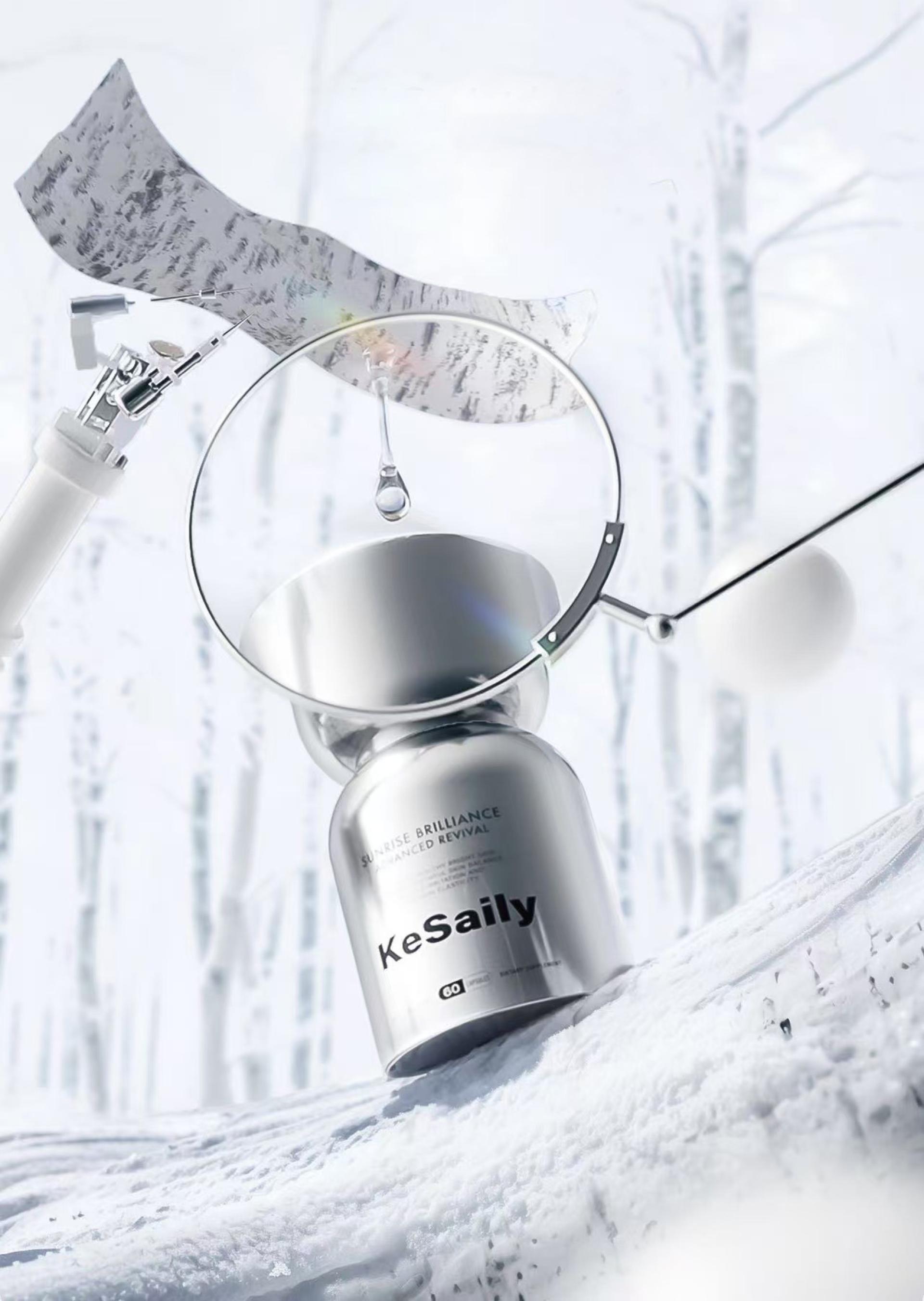 KeSaily features a sandglass-shaped bottle design, symbolizing the struggle against time. The bottle surface is treated with a silver electroplated glossy finish. When light hits this surface, most of it is reflected rather than absorbed. At the same time, its shiny surface also symbolizes the defense against external light damage. This design creates a deep connection between visual expression and the product’s "anti-photoaging" properties, both aesthetically and conceptually.
