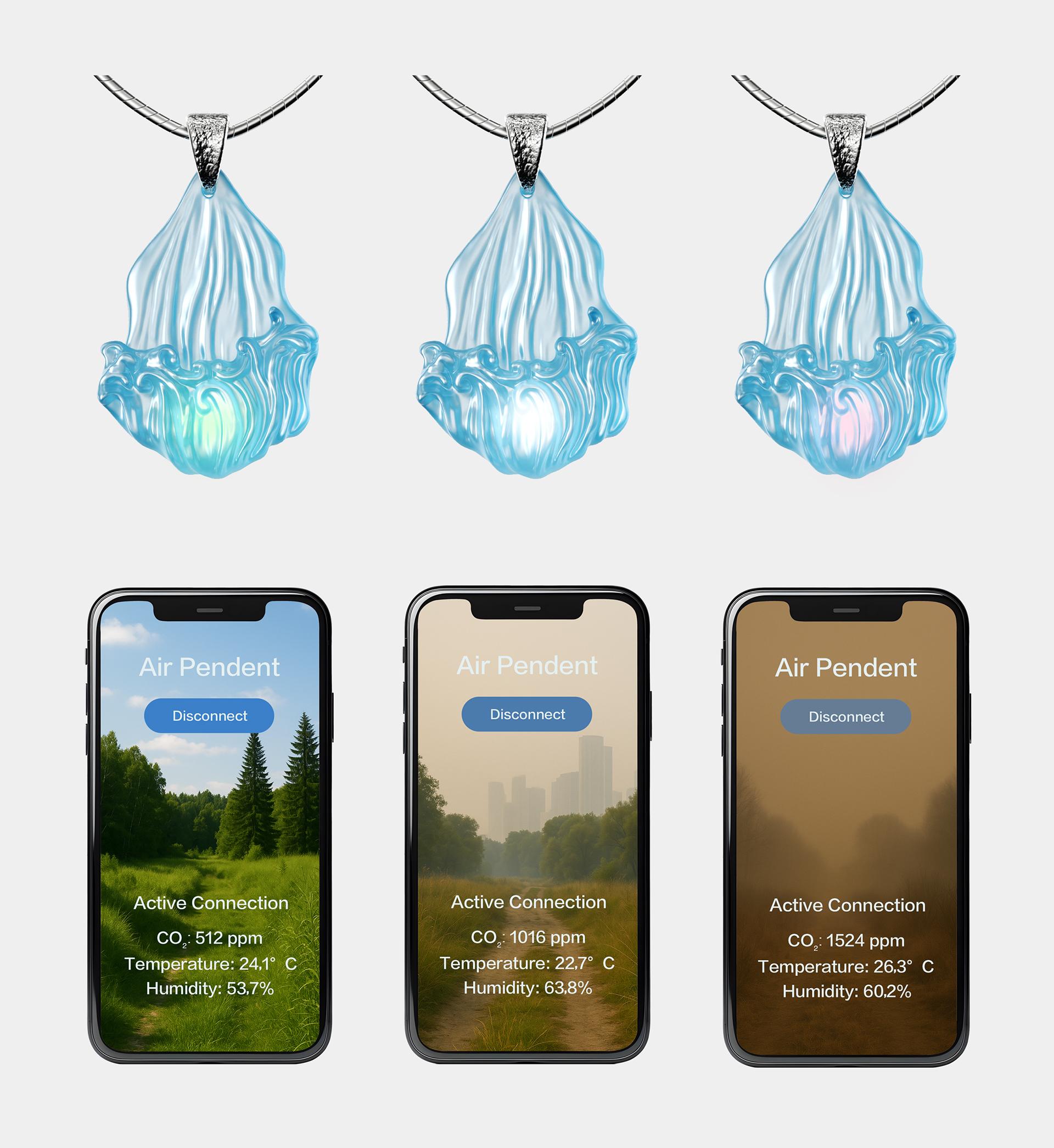 At its core is a real-time CO₂ sensing system that visualizes air quality through dynamic LED colors—shifting from green in clean air to red in high pollution—making invisible threats instantly perceptible. The pendant gently rises and falls with the wearer's breath, turning environmental monitoring into a contemplative, sensory ritual.