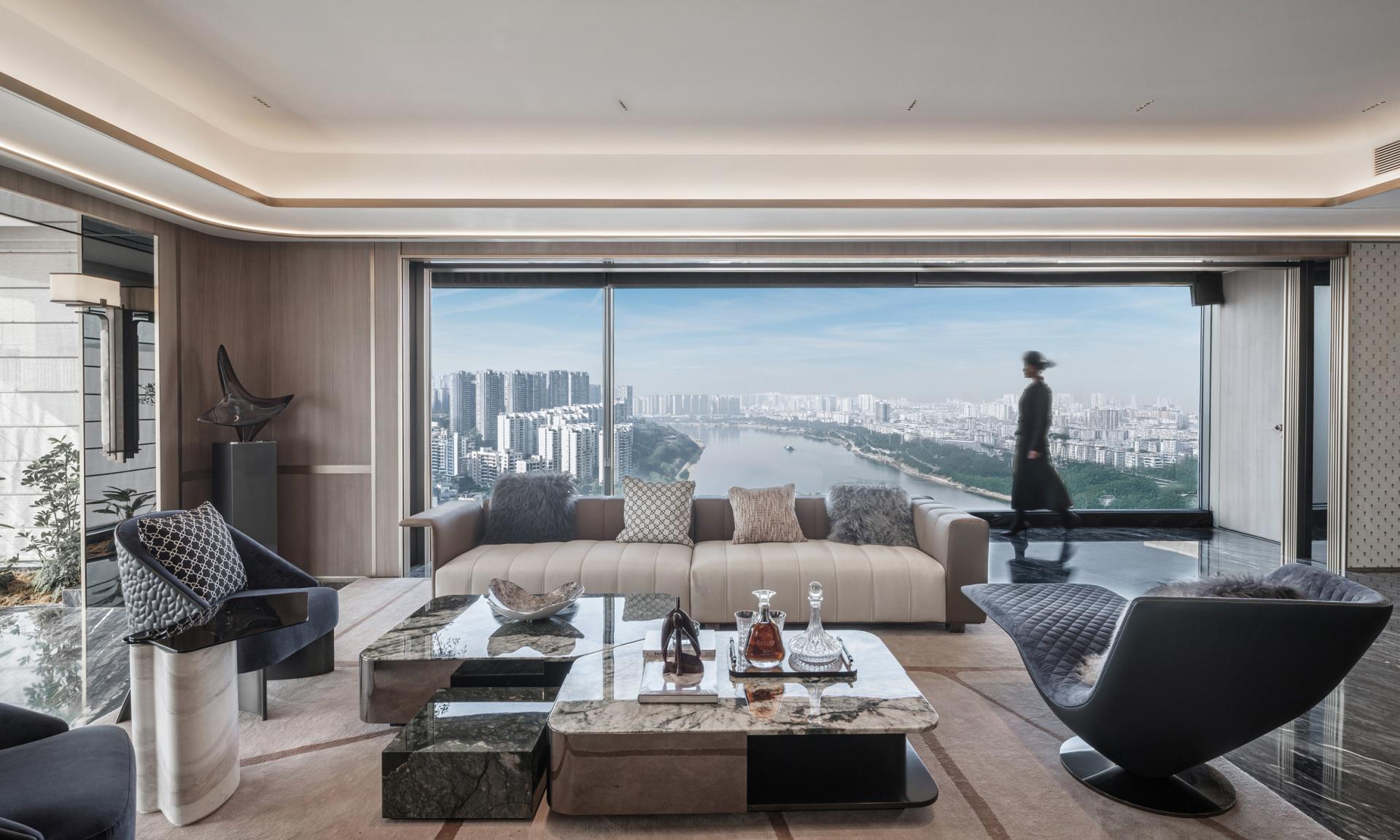Inspired by the fluidity of the river, the design uses flowing lines and a natural color palette to connect indoor and outdoor spaces. Expansive minimalist windows frame uninterrupted views, allowing the landscape to become part of the interior experience.