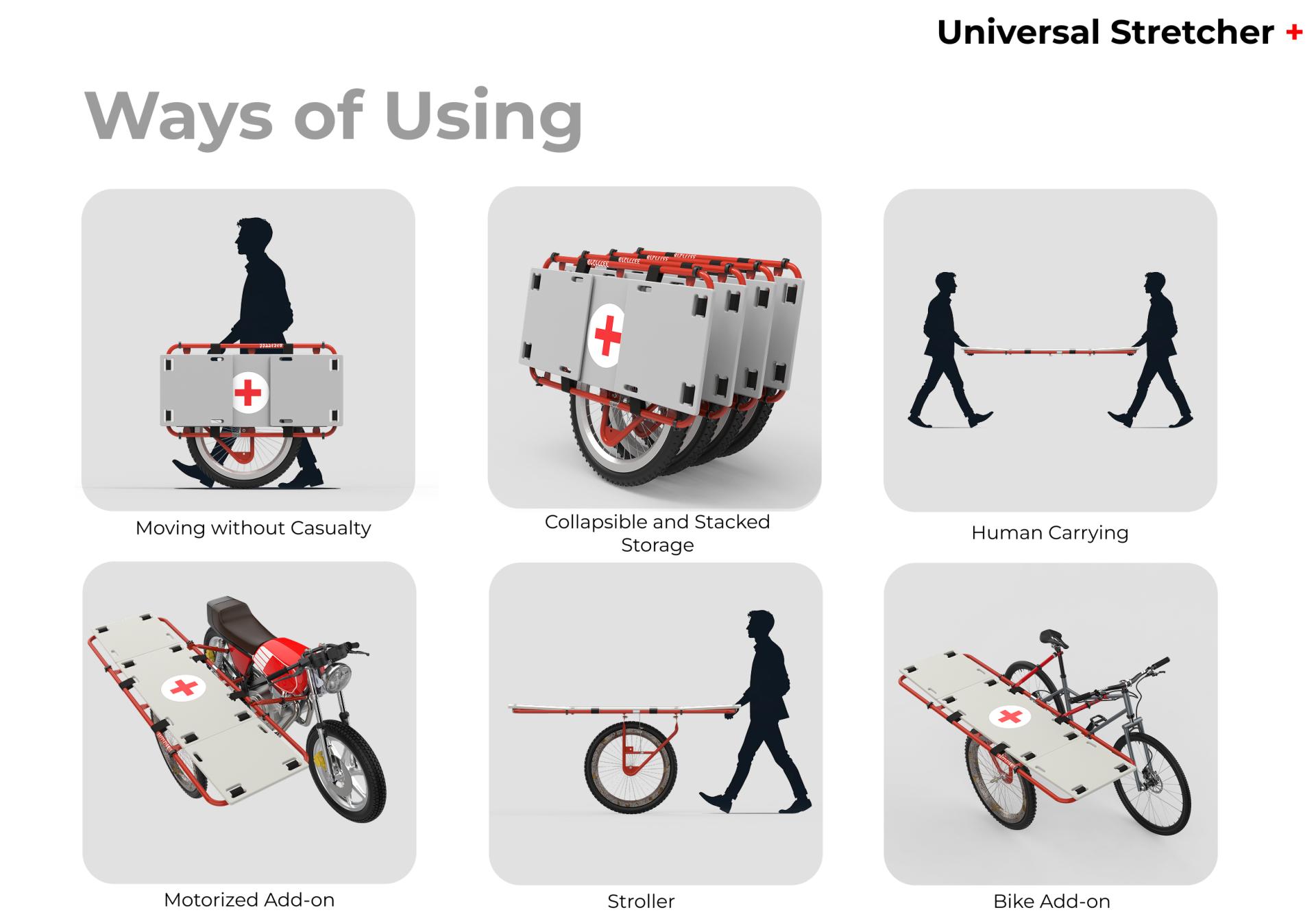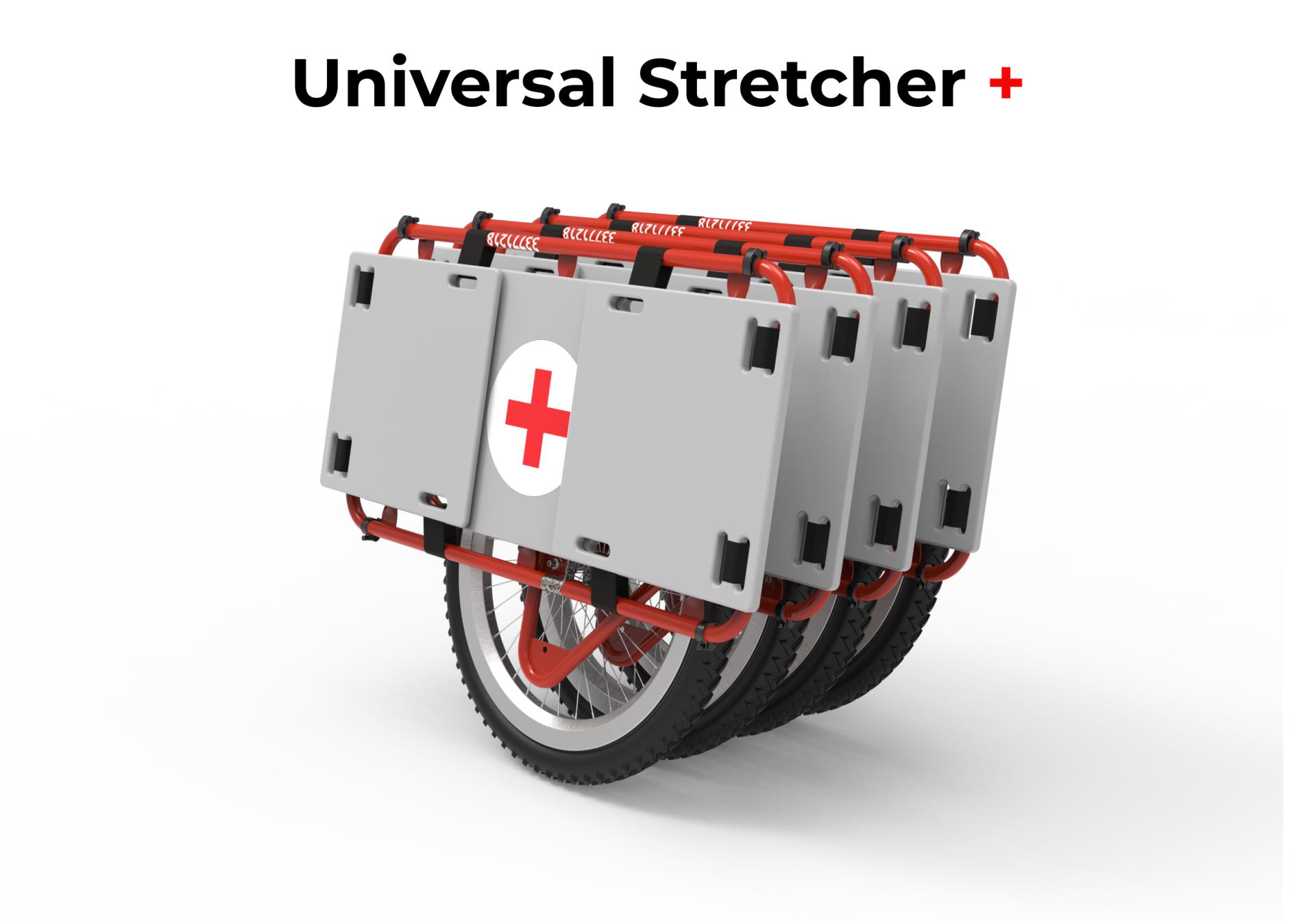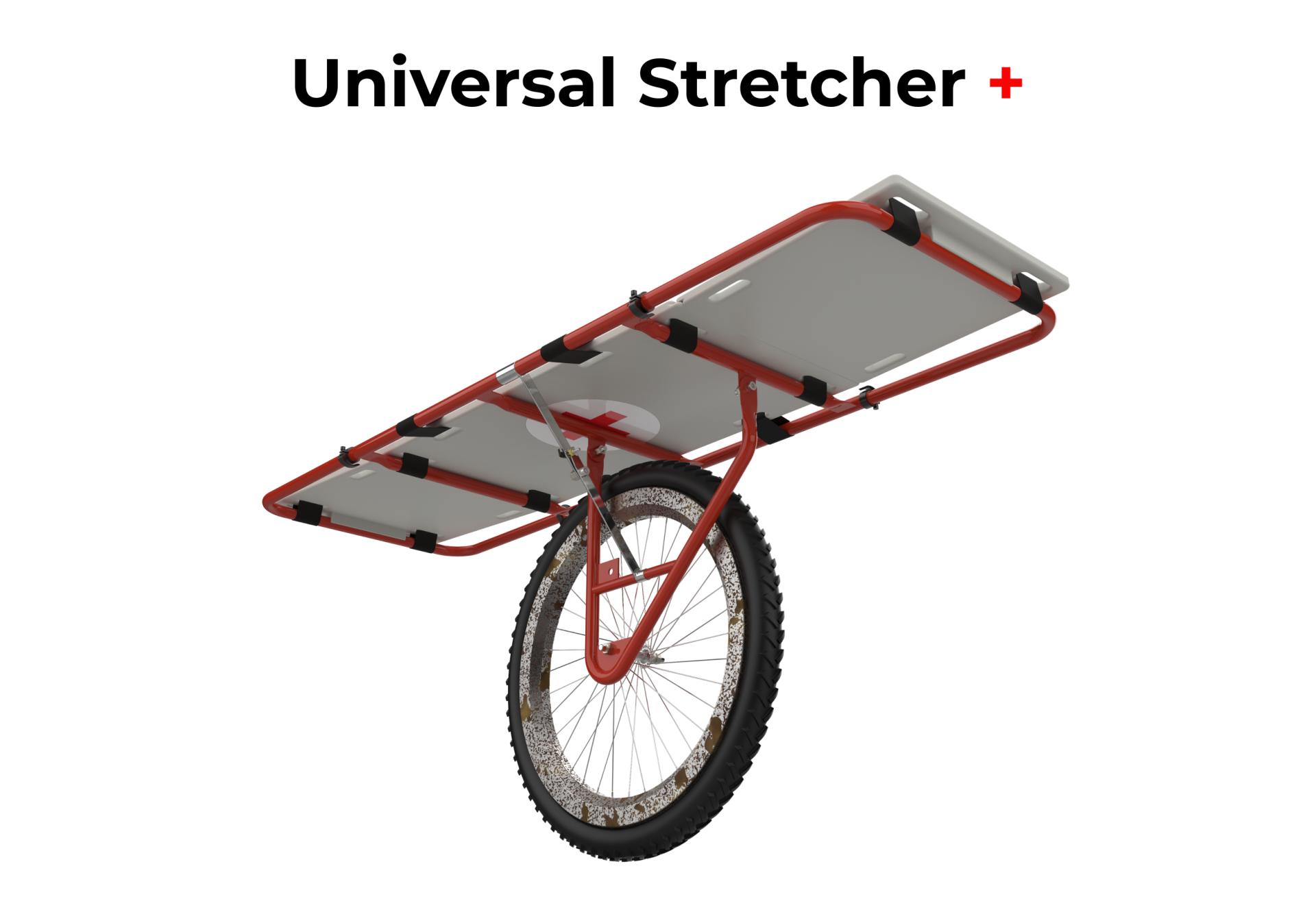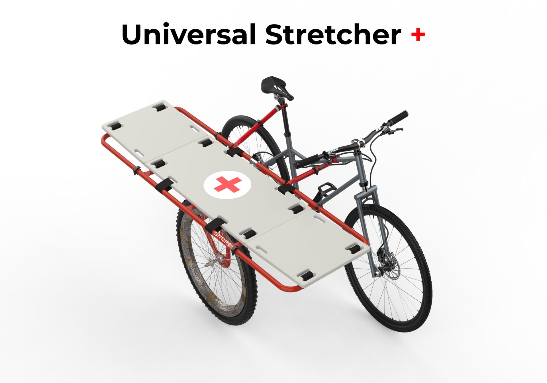 Unlike traditional stretchers that require trained teams and full-size vehicles, Universal Stretcher mounts directly onto bicycles and motorcycles using simple clamp attachments. It can also be folded out for manual carrying by two people or used as a wheeled trolley. The design enables a single rescuer to deploy it in seconds—even without formal training.