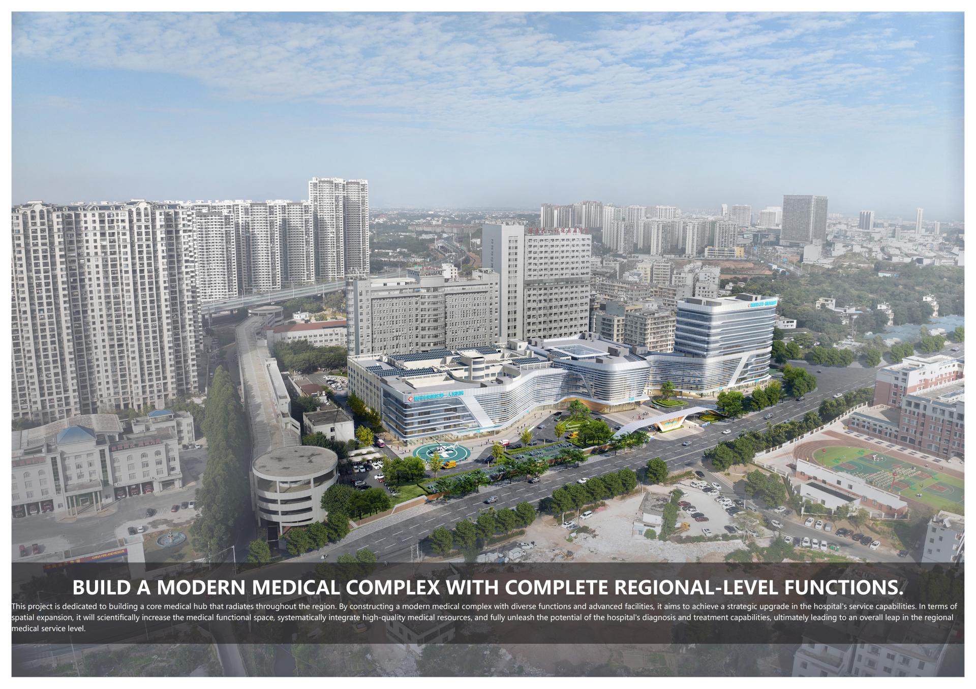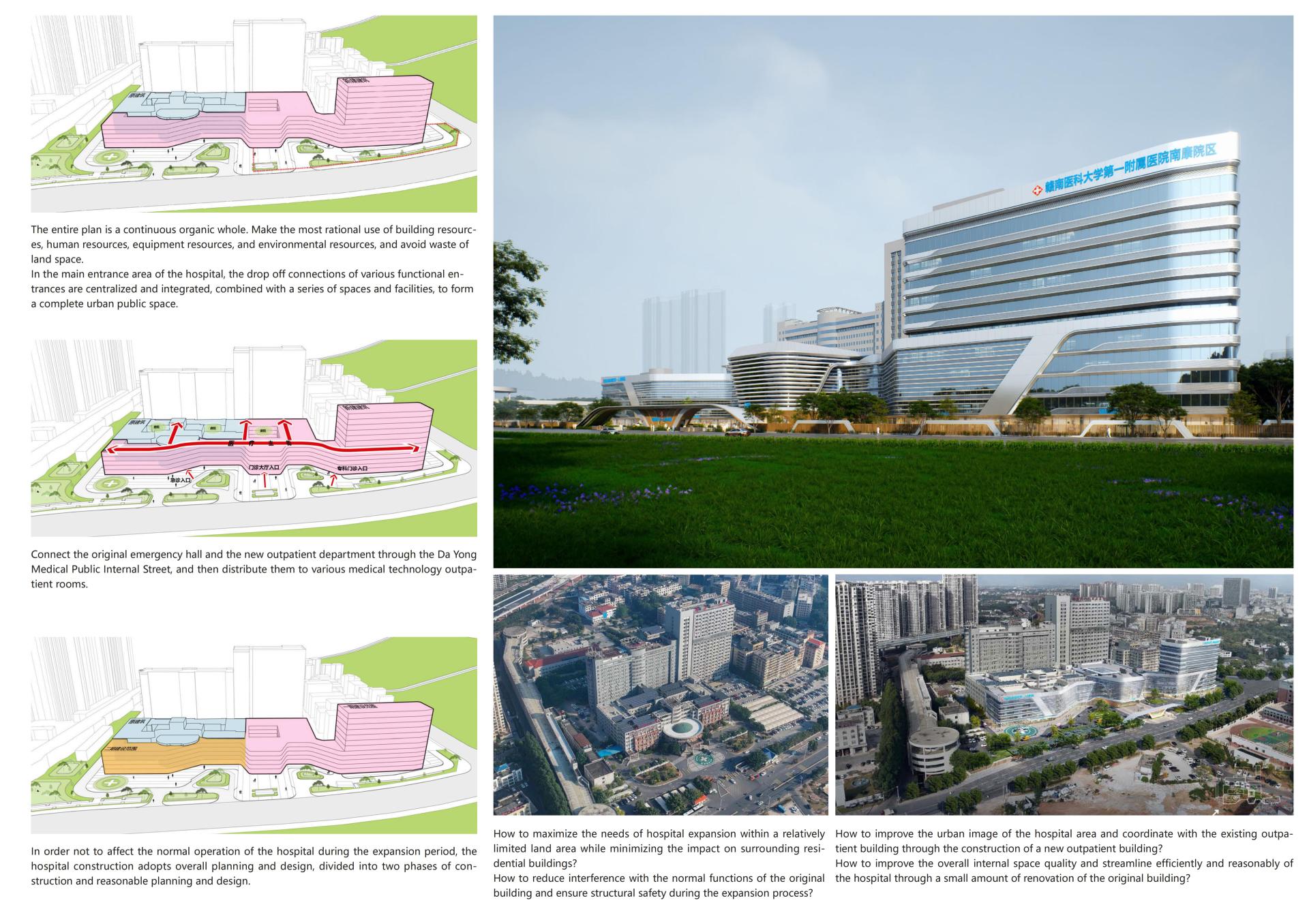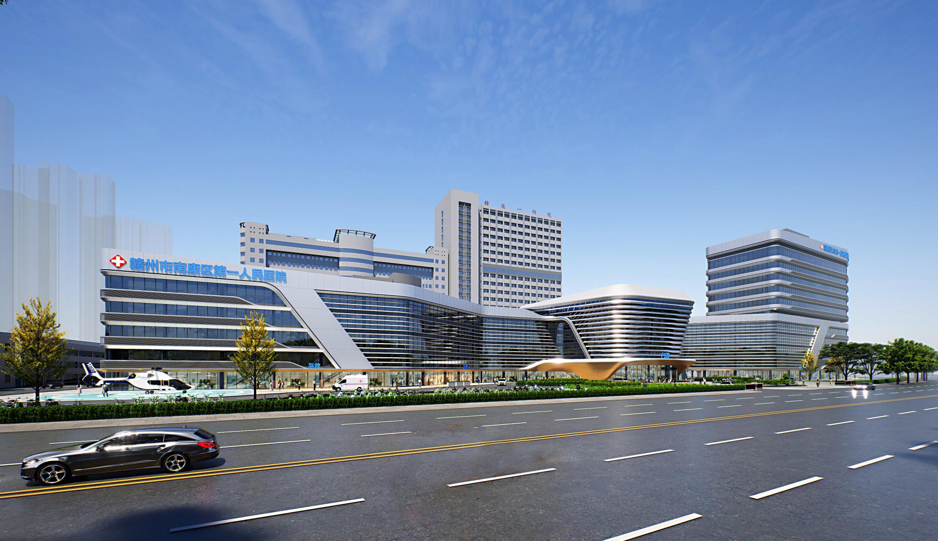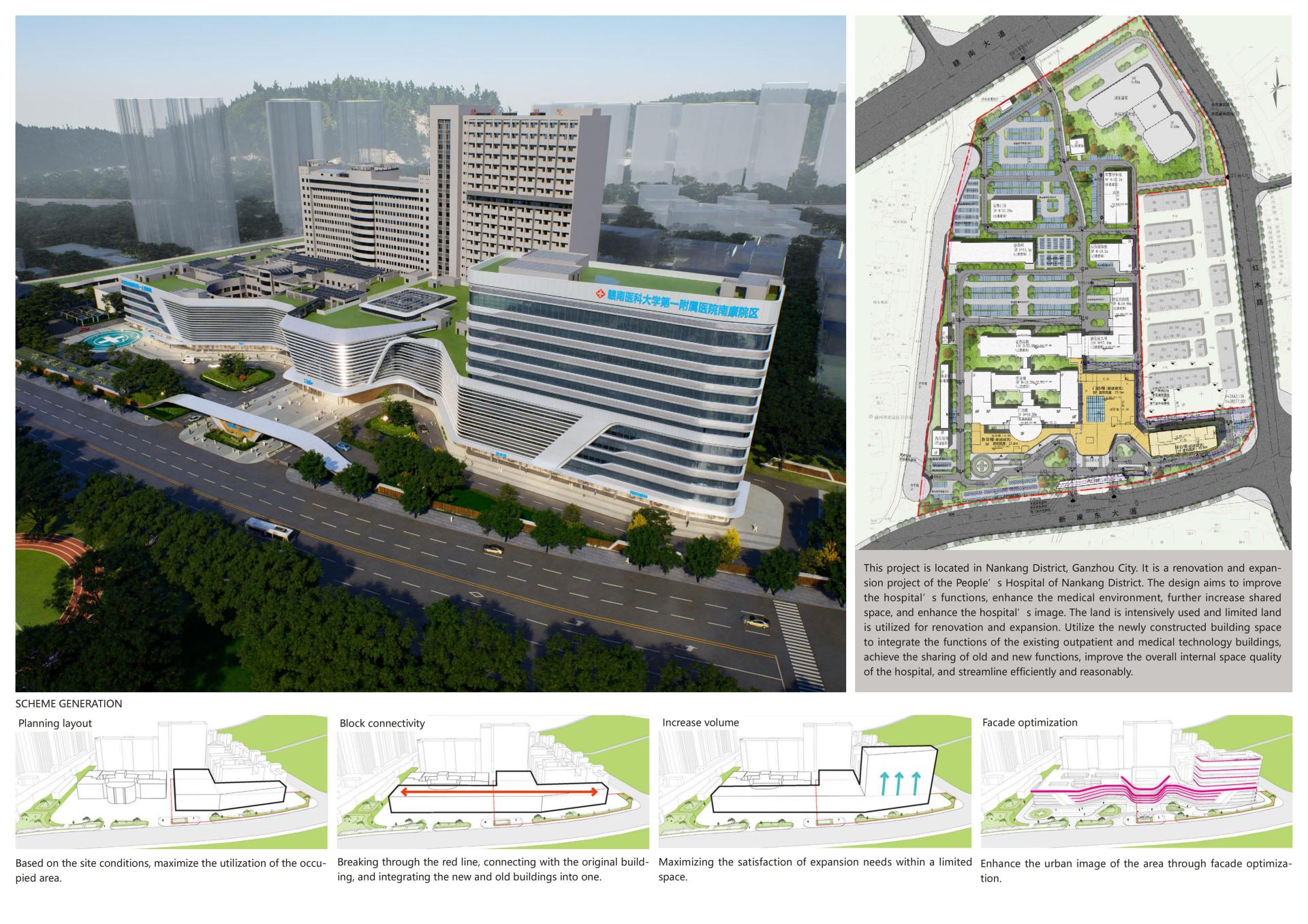 The Outpatient Comprehensive Building of the First People's Hospital of Nankang District, Ganzhou,This project is located in Nankang District, Ganzhou City, and is an expansion and renovation project for Nankang District People's Hospital. The design aims to improve hospital functions, enhance the medical environment, further increase shared spaces, and elevate the hospital's image, while adopting intensive land use to carry out the expansion and renovation within the limited land area. By utilizing the space of the new construction, it integrates the functions of the existing outpatient and medical technology buildings, achieving shared functions between old and new facilities, enhancing the overall internal spatial quality of the hospital, and ensuring efficient and rational flow lines.