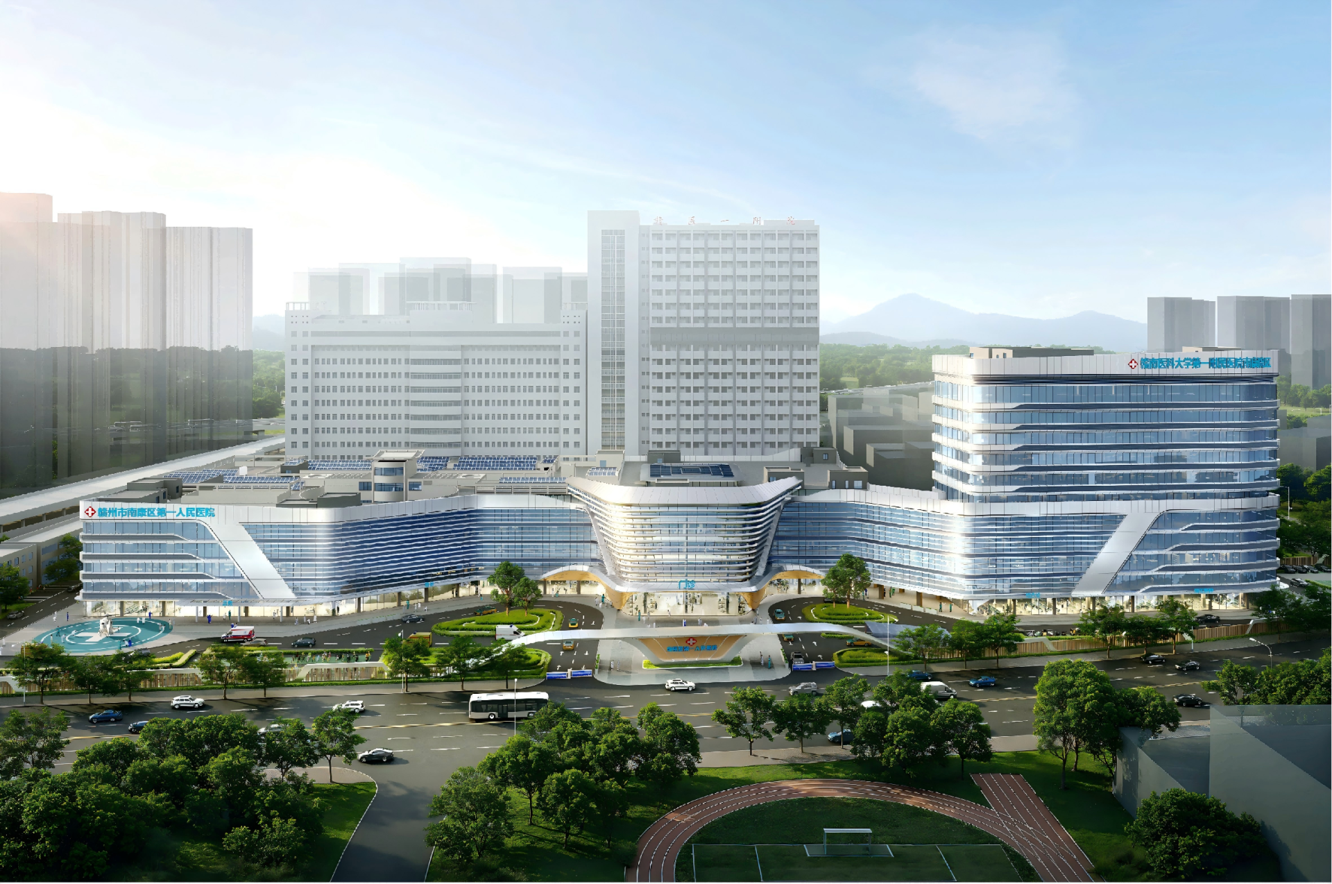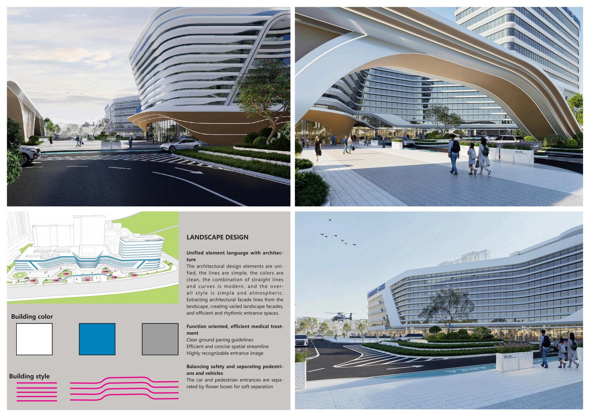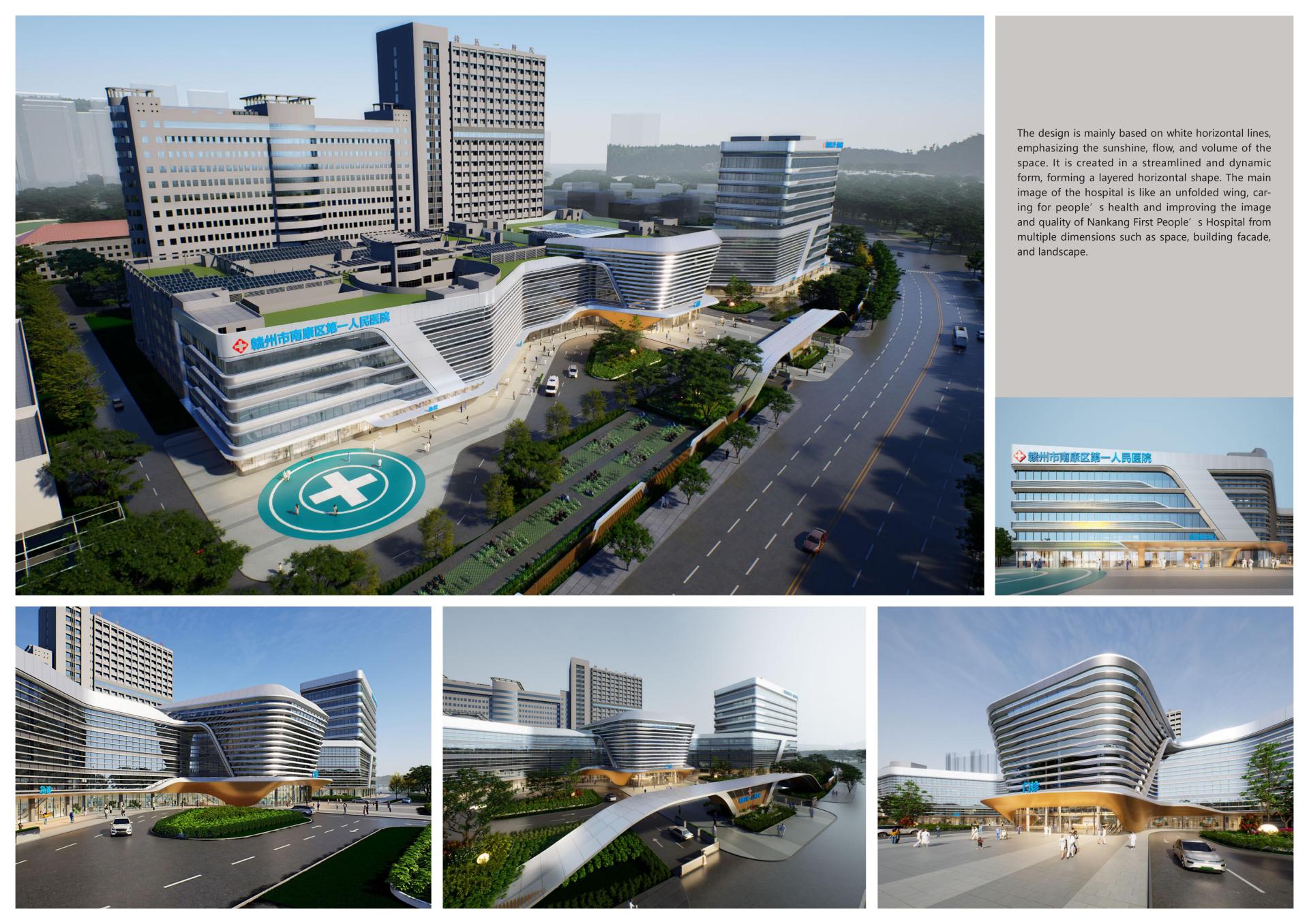 The architectural form features white horizontal lines as the primary design element, emphasizing sunlight perception, a sense of flow, and a substantial visual presence. With a dynamically curvilinear form, it creates a horizontally layered and overlapping structure. The main facade of the hospital, resembling spread wings, symbolizes care for people's health, comprehensively elevating the image and quality of Nankang First People's Hospital through multi-dimensional enhancements in space, architectural facades, and landscapes.