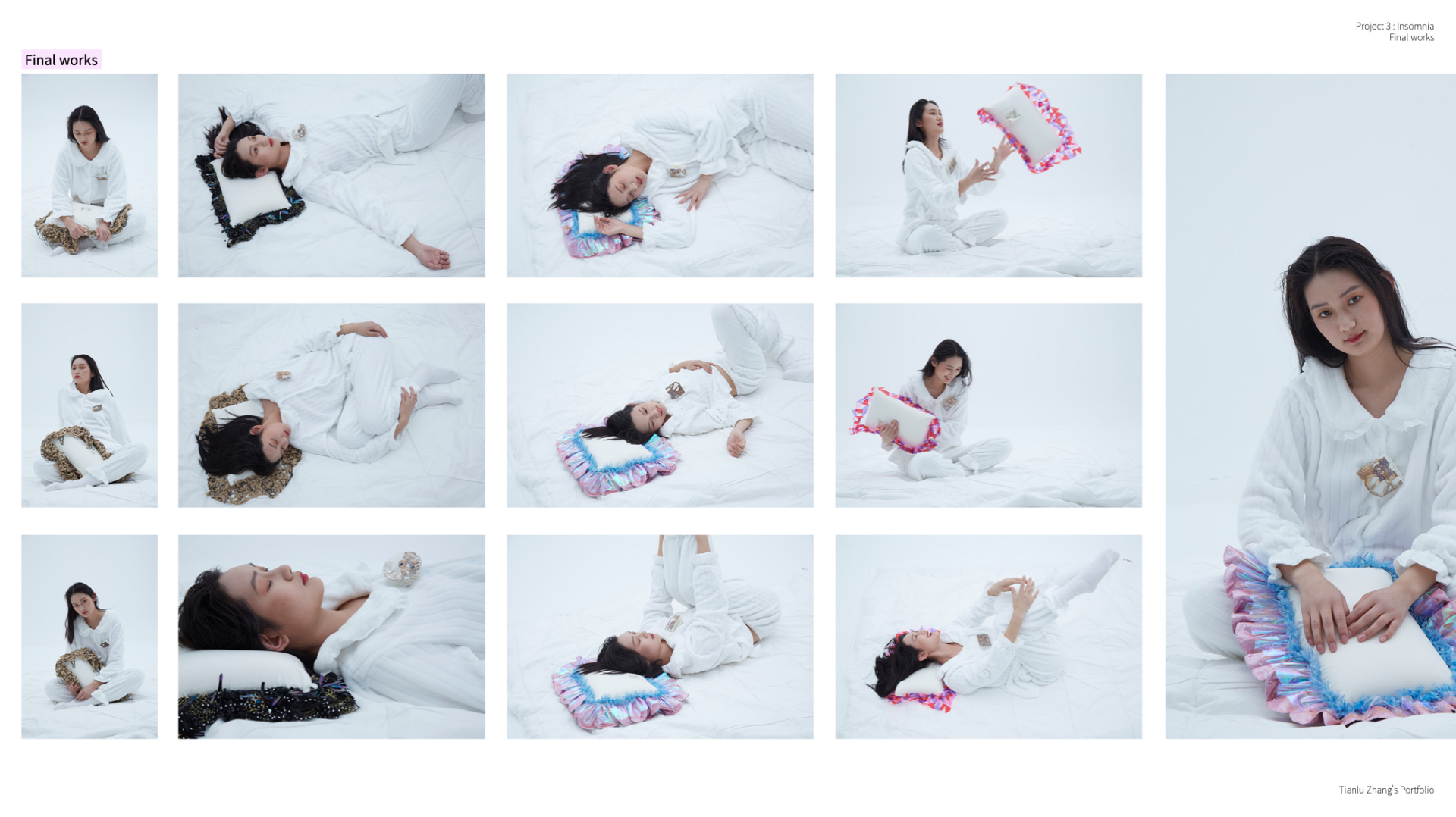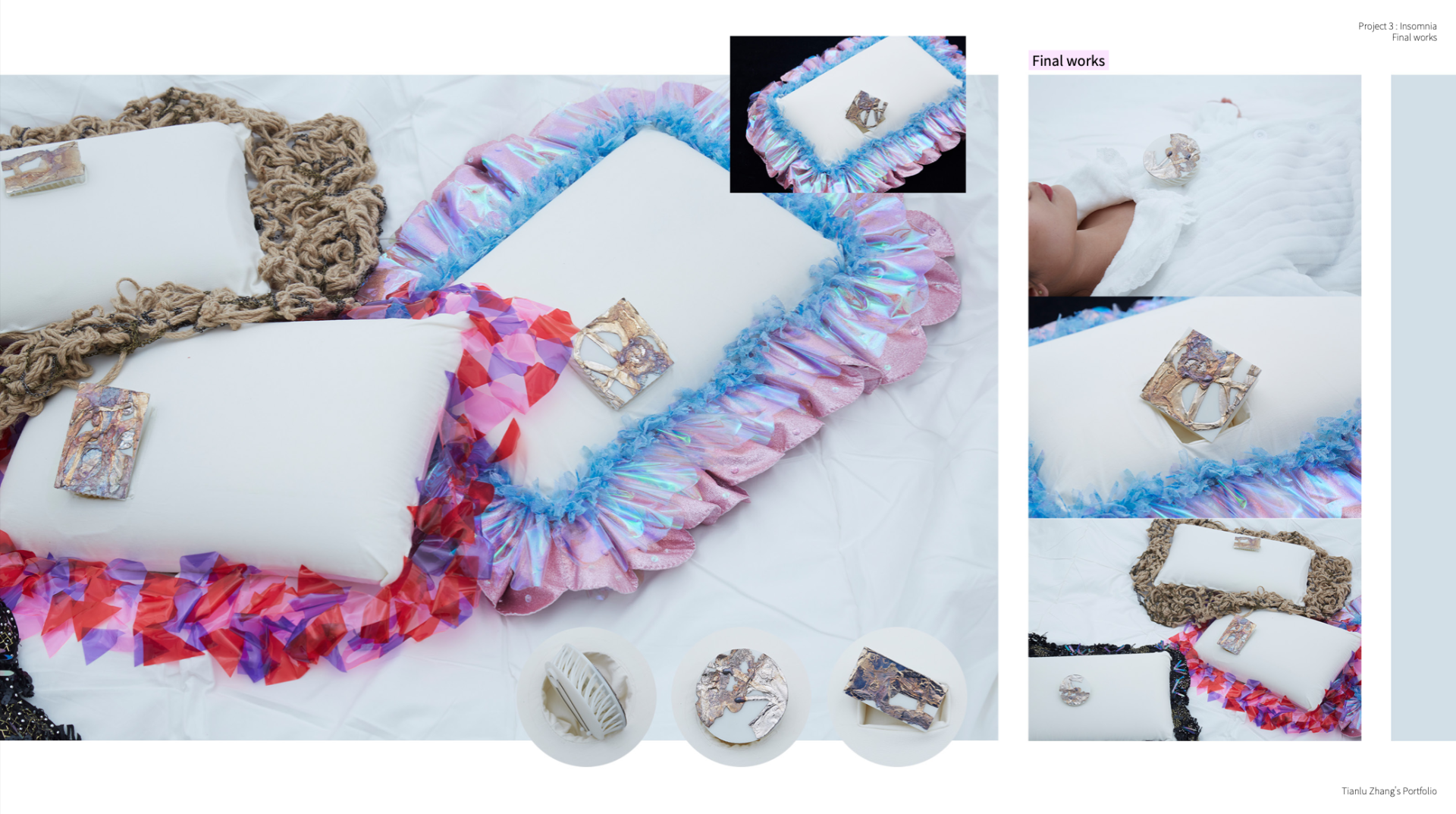 Insomnia can cause you not to fall asleep even if you lie on bed deliberately, count sheep, toss and turn on the bed or play mobile phone. Getting up due to insomnia, you will feel boring since you can only see the shining moon and stars, but nothing in the pitch black room. There are only starry sky left. According to a research, people can sleep well in what kind of room and bed position. I design a series of pillows with different small squares. The small squares are designed like starry sky on the pillow and they are just like the coordinate of the bed. When you take a small square off from the pillow, it is a brooch. 4 different kinds of pillows are designed for people who have nightmares, girls, adults and the elderly.