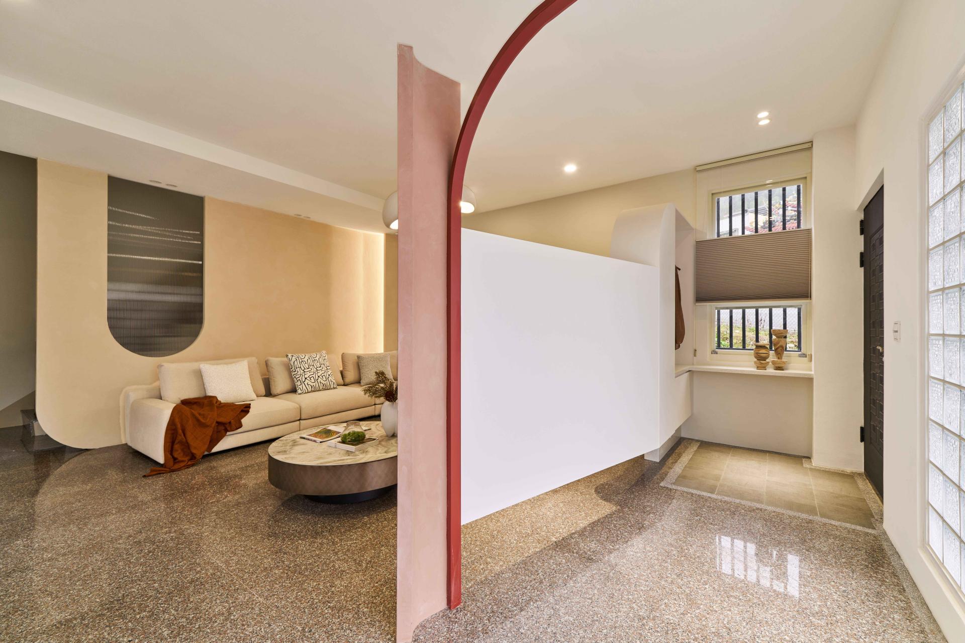 The design explores light, stillness, and spatial clarity. Original layouts were dismantled and softened through the use of glass bricks, curved transitions, and natural ventilation. A red-brick arced beam at the entrance gently defines the threshold between outer and inner realms, symbolizing the dual nature of the space: a house that welcomes, reflects, and exhibits.
