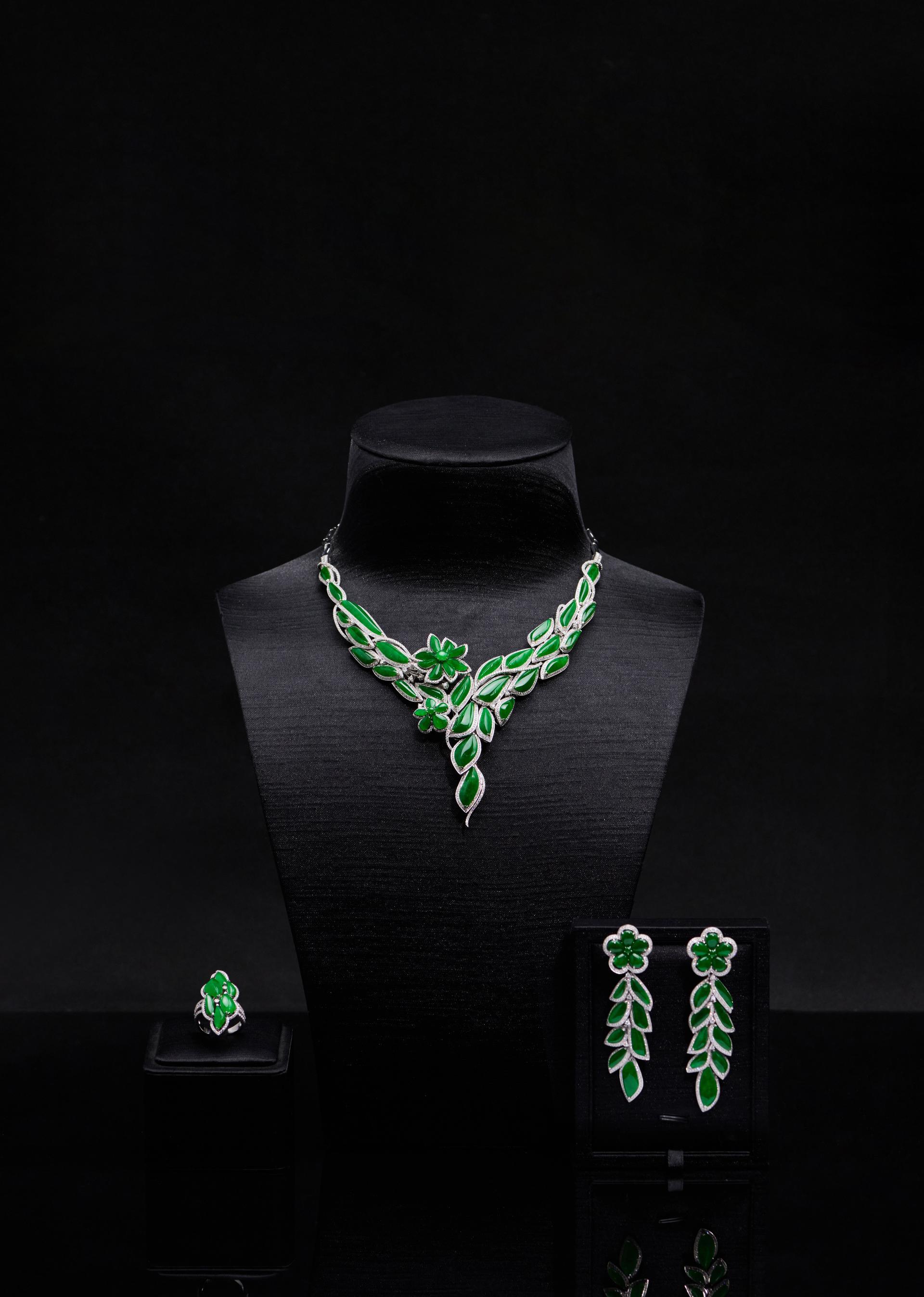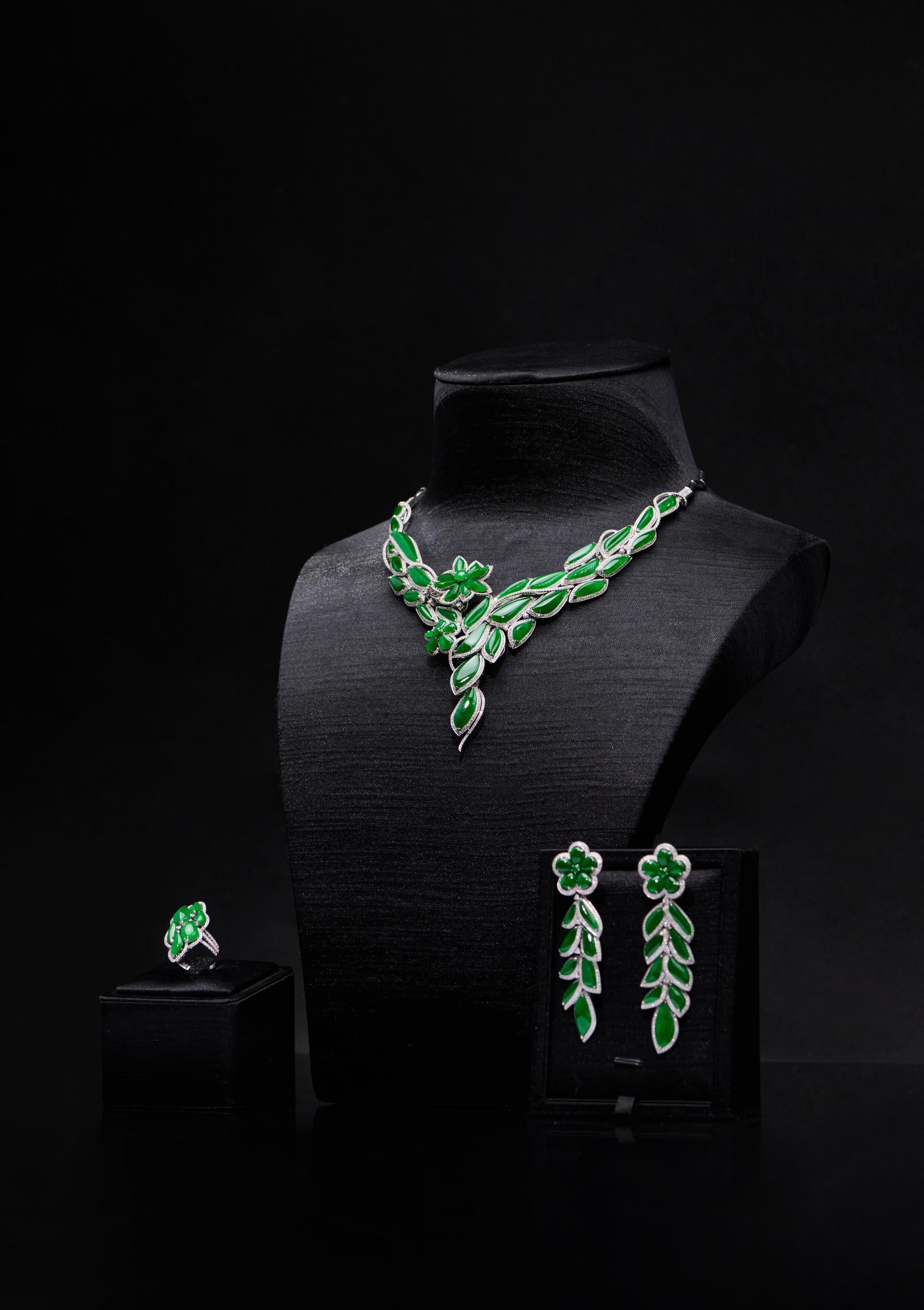 The necklace design traces the organic spread of branches and leaves, with petal- and leaf-shaped gemstones artfully arranged in flowing, sinuous lines, resembling vines swaying in a spring breeze, naturally encircling the neck. The earrings extend the floral cascade motif, draping delicately from the earlobe in layered tiers, balancing airy grace with structural harmony. The ring, centered on a blooming flower, features jade petals in distinct, lush layers, its full composition evoking a tranquil green blossom, encapsulating the refined beauty of Eastern lyricism.