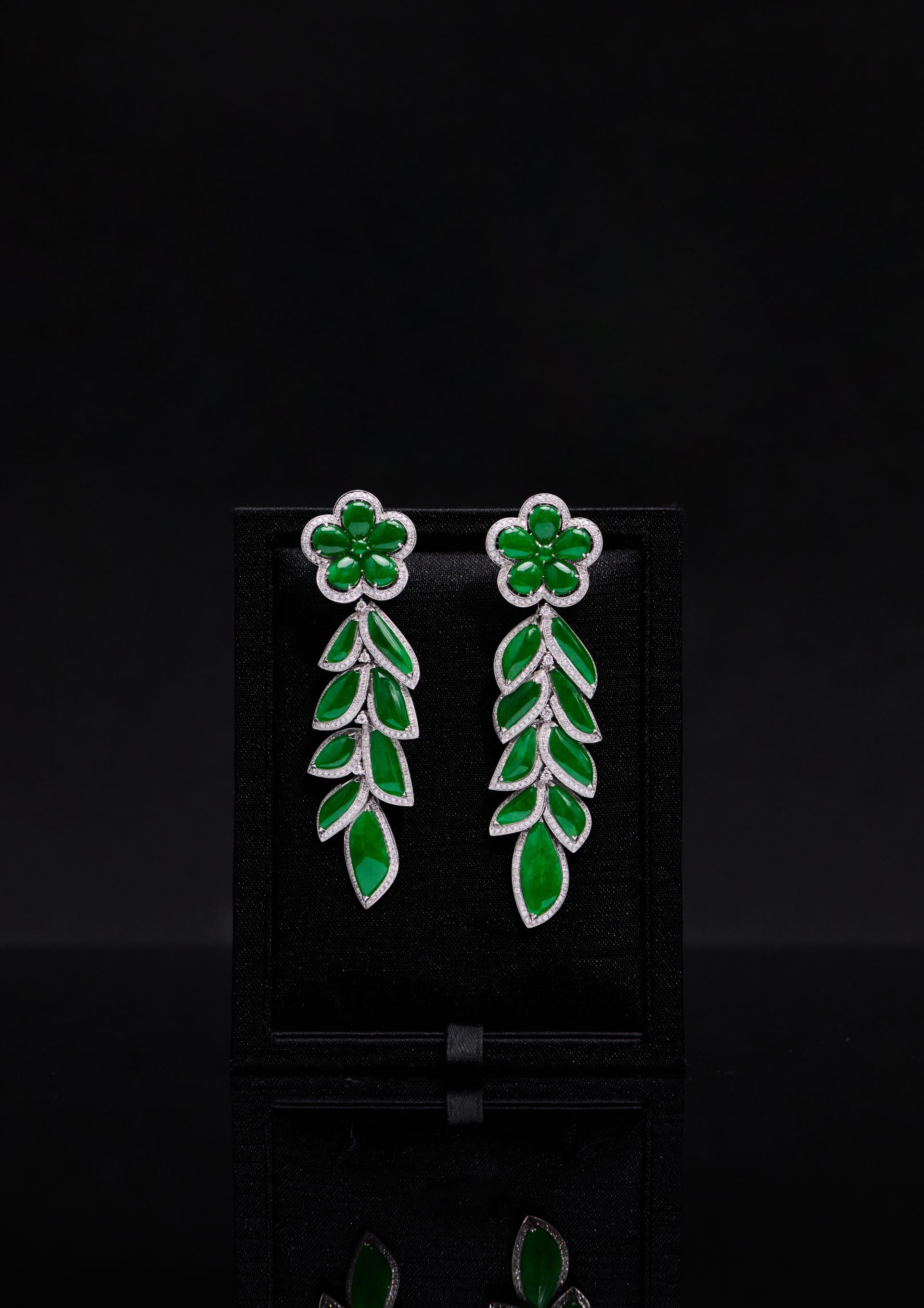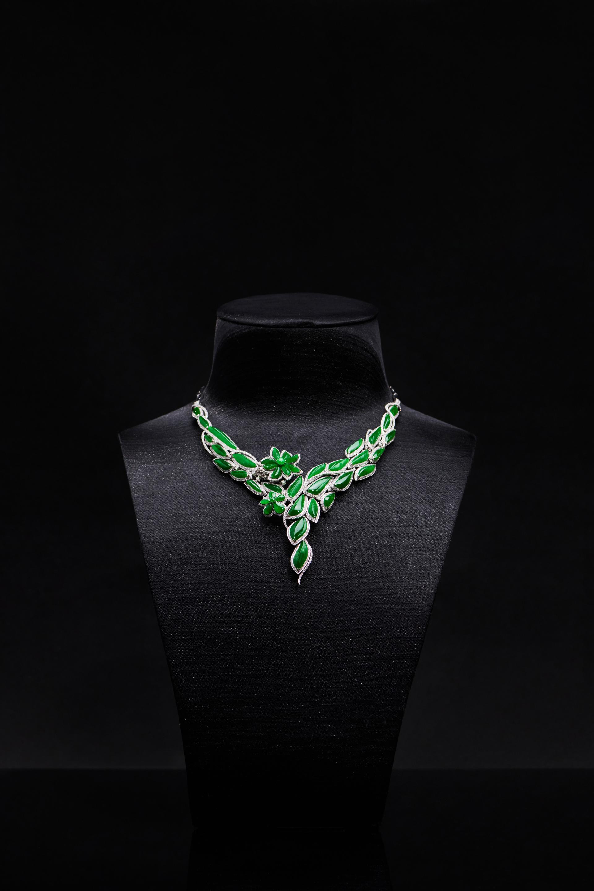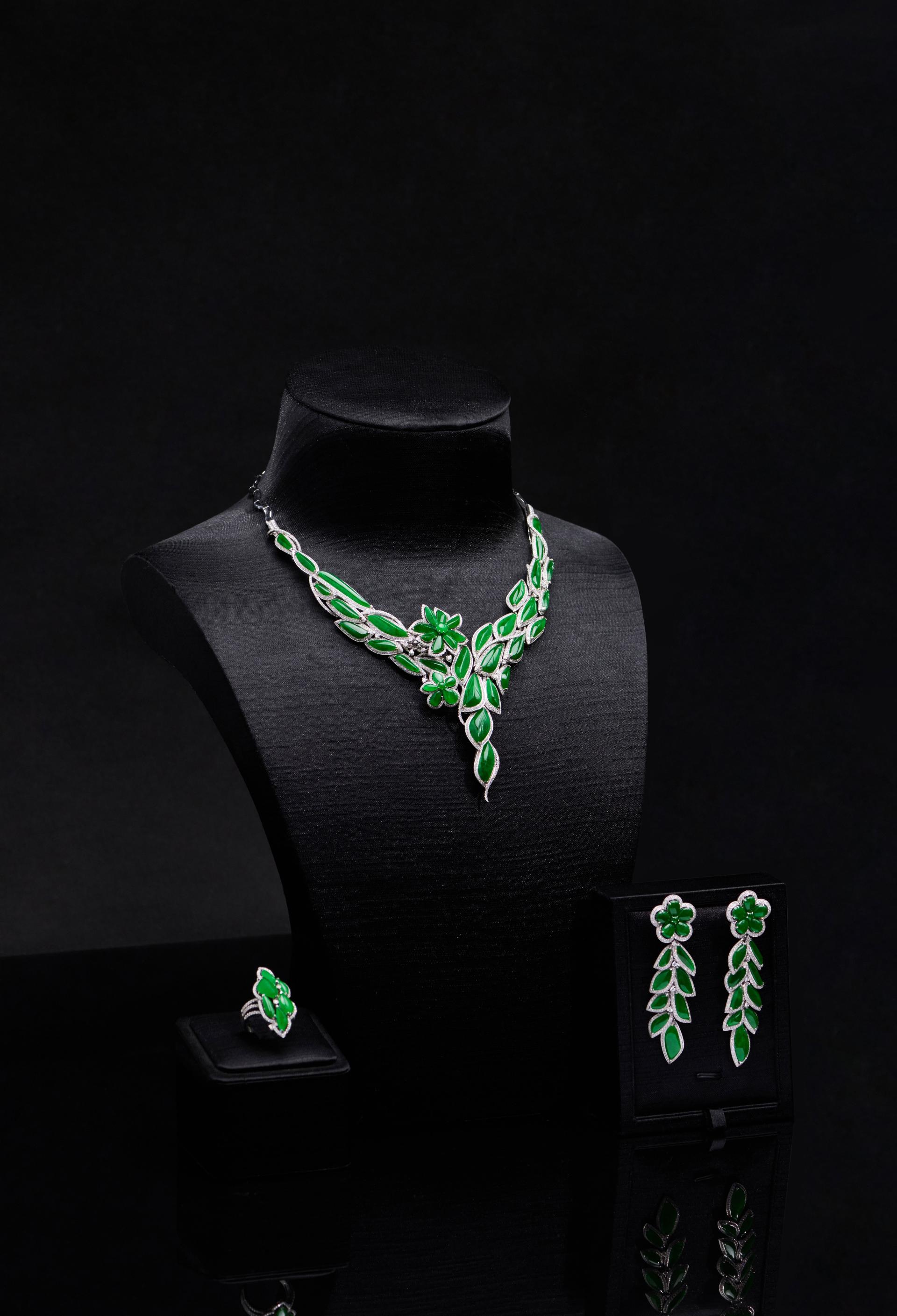 The necklace’s central motif features fluid curves that trace the graceful unfurling of leaves, exuding an air of elegance and confidence for the wearer. The earrings continue this streamlined design, with green gemstones and diamonds artfully interspersed, layered to create a dynamic, three-dimensional visual experience. The ring, centered on a blooming flower, showcases an emerald as the heart of the blossom, fusing natural beauty with masterful craftsmanship at the fingertips, imbuing the collection with profound emotional resonance.