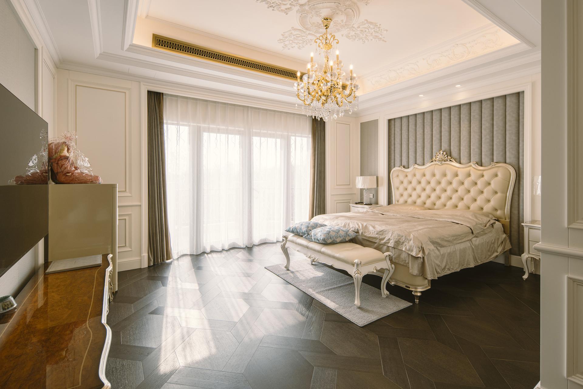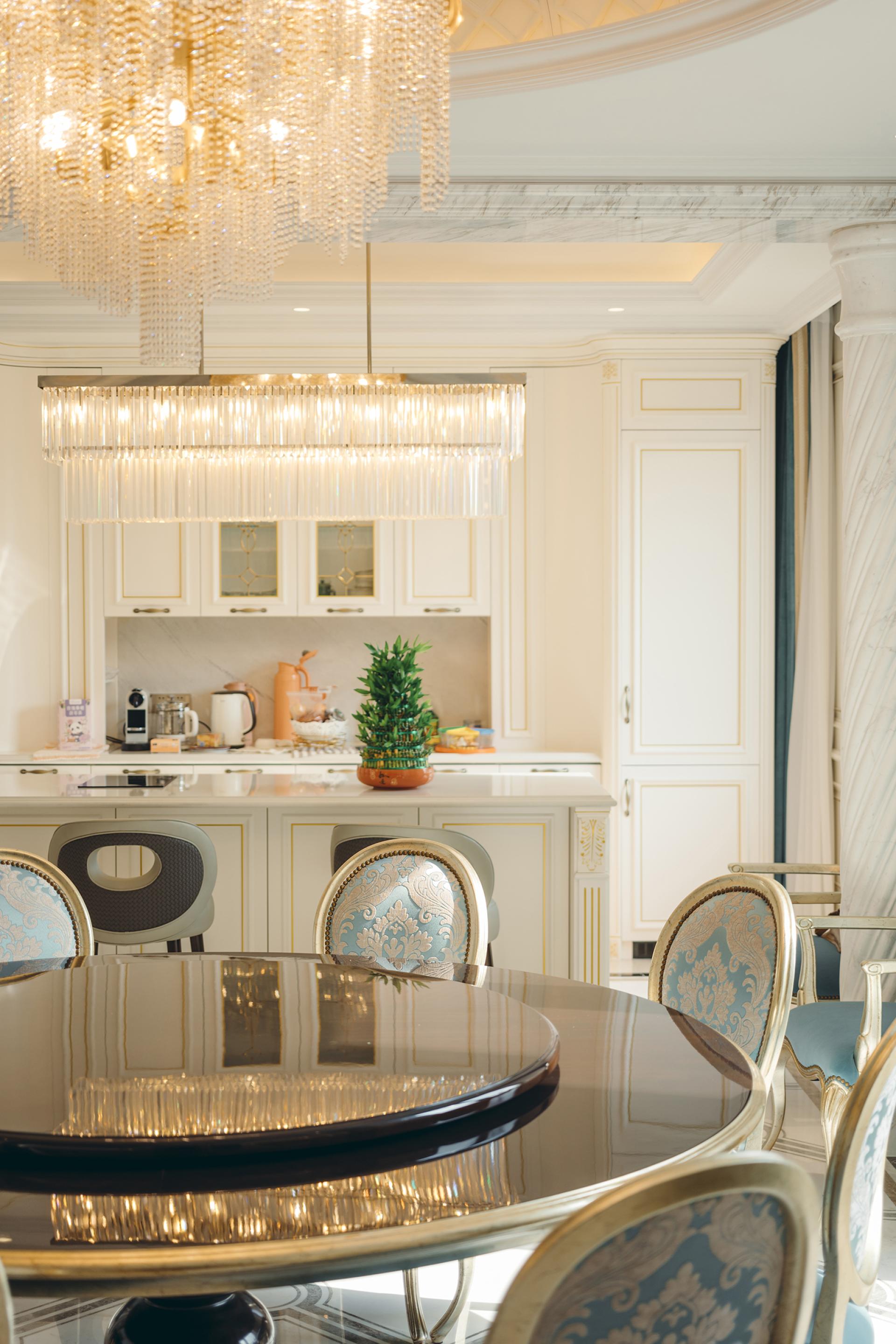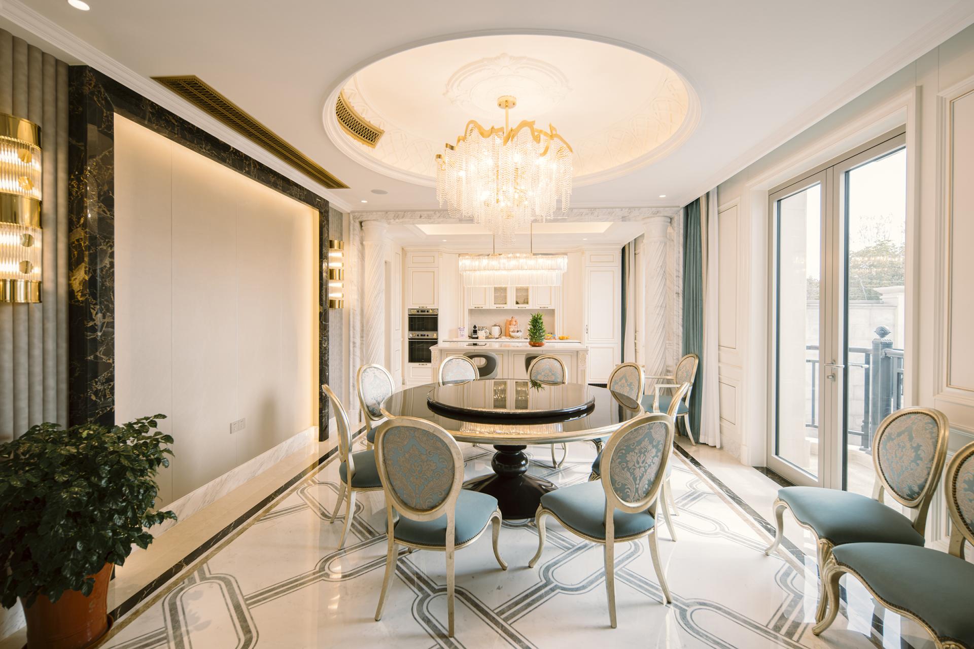 At the entrance, Roman Columns, carved double doors with triangular mountain flowers, romantic and delicate. The luxurious atmosphere of the air through the hall. The white marble wall is elegant and classic, and the giant crystal chandelier hanging in the circular groove at the top is bright and dreamy. As a transition, the entrance elevator snakes and stretches with a soft arc, connecting the inside and outside, and building a warm life link in the smart space. The living room has a pure white background with carved ceiling and crystal chandeliers for a luxurious look. Beige and white sofa lines are soft, with contrasting color pillow, under the backdrop of lake blue curtains and tall green plants, the space is smart and full of vitality. The kitchen is adjacent to the dining room for easy interaction, and the light well allows natural light to integrate into the dining time, and the light and shadow on the ground change with the flow of time, giving the space dynamic vitality. This set of interior stairs can be regarded as a concrete expression of the French aristocratic life aesthetics. The dark wood handrail is warm, and on the column, the smooth lines of gold and the blue-green decorative pieces are set off each other, just like the artistic carving in the mirror hall of Versailles Palace, showing the romance and luxury of French. Aisle floor marble parquet unique, such as art scroll spread, extend the visual depth. The crystal chandelier in the bedroom shines brightly, interweaving with the dim light outside the window into the wings of a dream. The dark wood floor is calm and heavy, carrying the tranquility of the night, allowing people to sleep peacefully in the symbiosis of French romance and space. Study, the view outside the window resonates with the quiet inside. Flexible ceiling lines, circular arc metal wine cabinets complement each other, with geometric chandeliers, very modern beauty. The black marble bar with tan leather chairs creates an elegant casual atmosphere, and the overall space is smooth and layered.