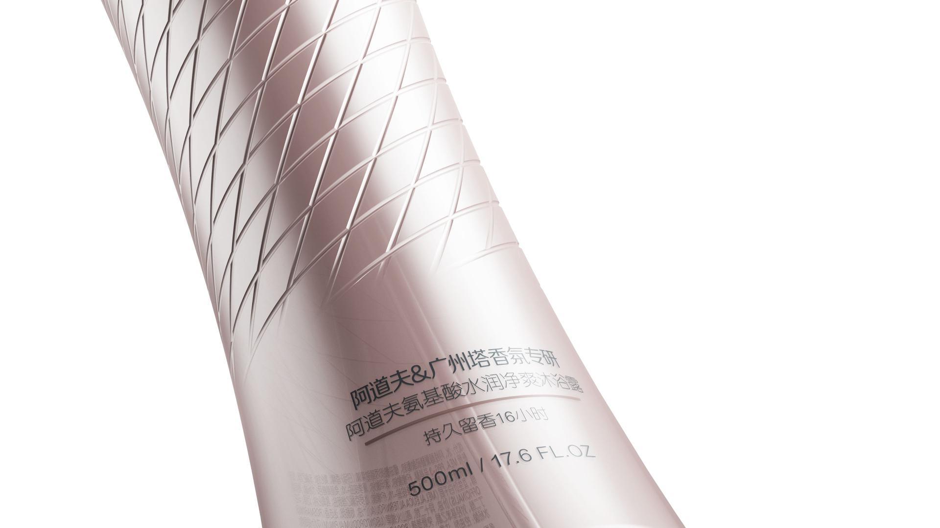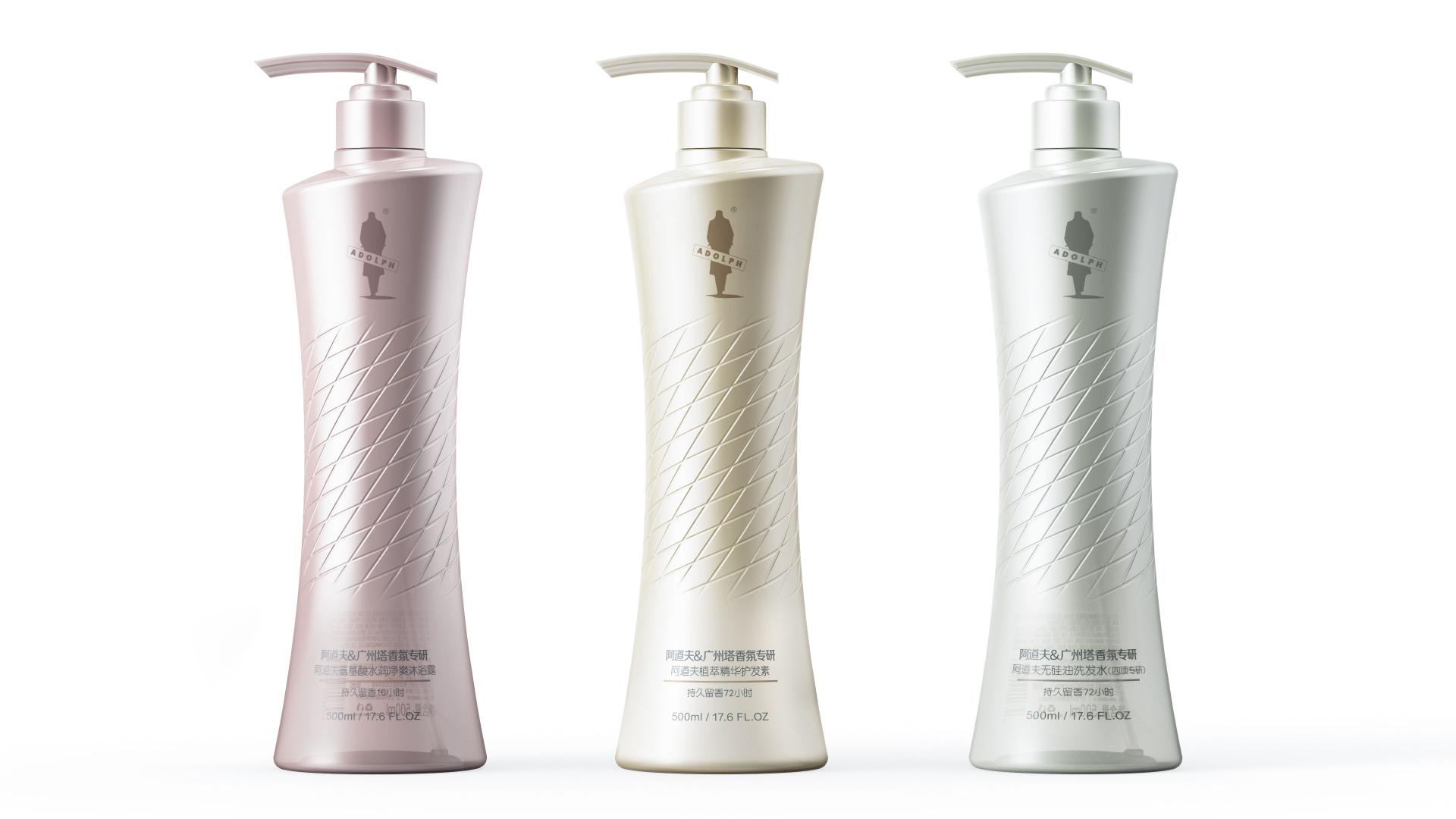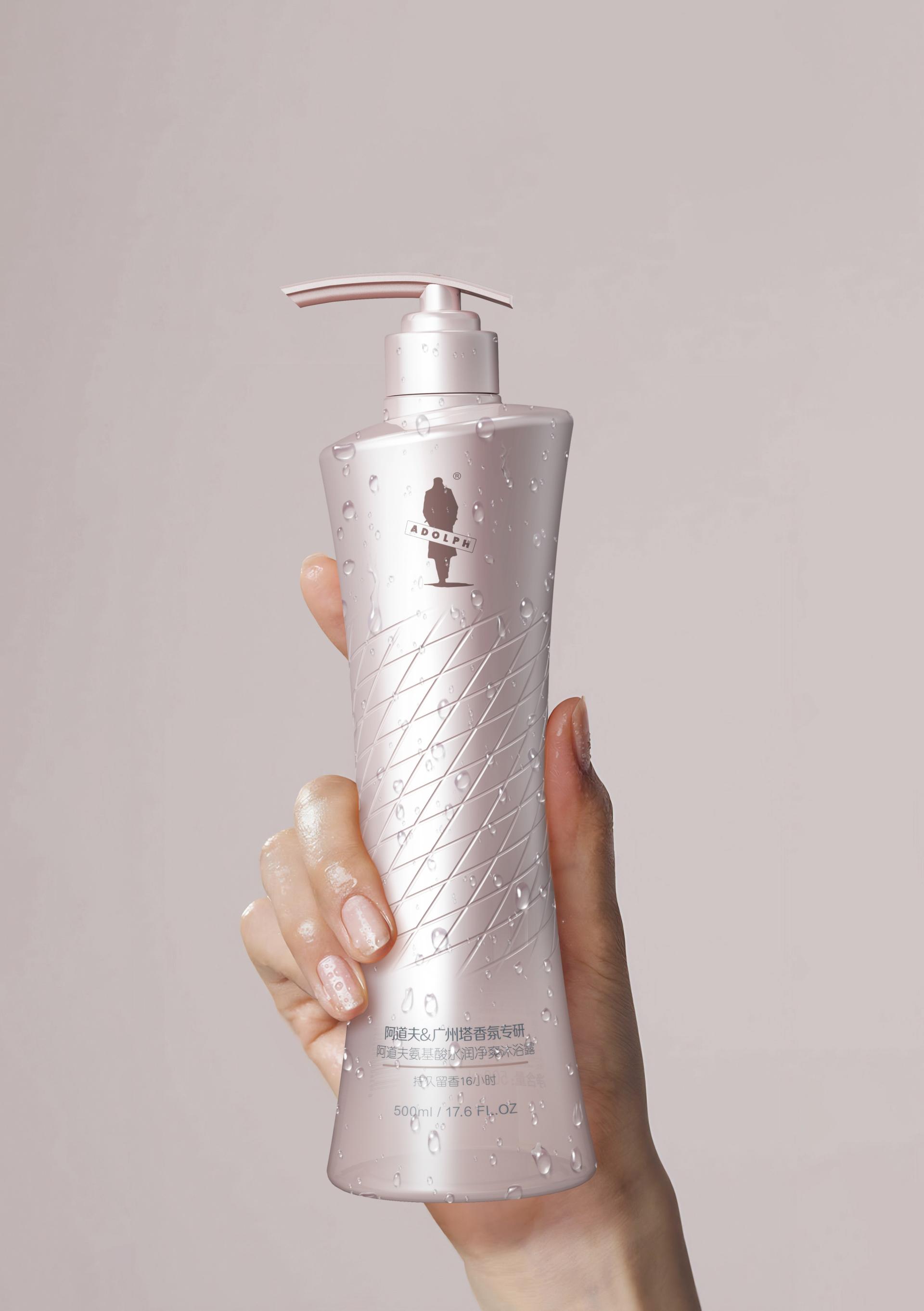Inspired by the architectural aesthetics of the Canton Tower, represented by streamlined curves, diamond patterns, and a metallic finish, Adolph Fluid Curve Series integrates regional cultural symbols with modern packaging. The bottle’s narrowed midsection mimics the tower’s curve, enhancing visual appeal while evoking immediate recognition. The diamond patterns help consumers associate the packaging with the Canton Tower through touch, reinforcing cultural identity. In addition, the metallic coating effectively blocks ultraviolet rays from sunlight, slowing material aging to preserve long-term product quality. Ergonomic considerations are also integral to the design. The narrowed midsection fits comfortably in the space between the thumb and forefinger, while the diamond-patterned texture improves the grip in wet conditions—addressing the common problem of slippage with traditional cylindrical bottles.
