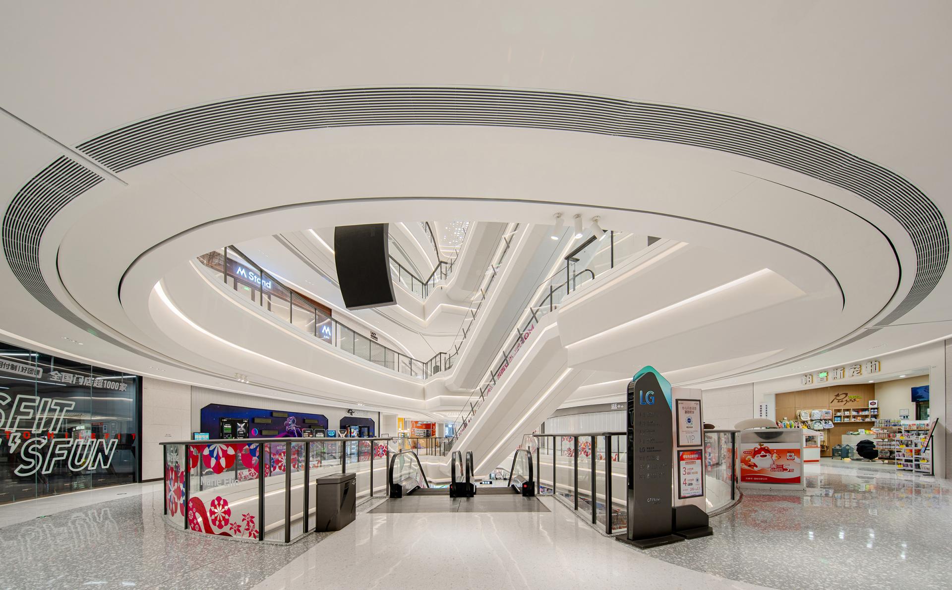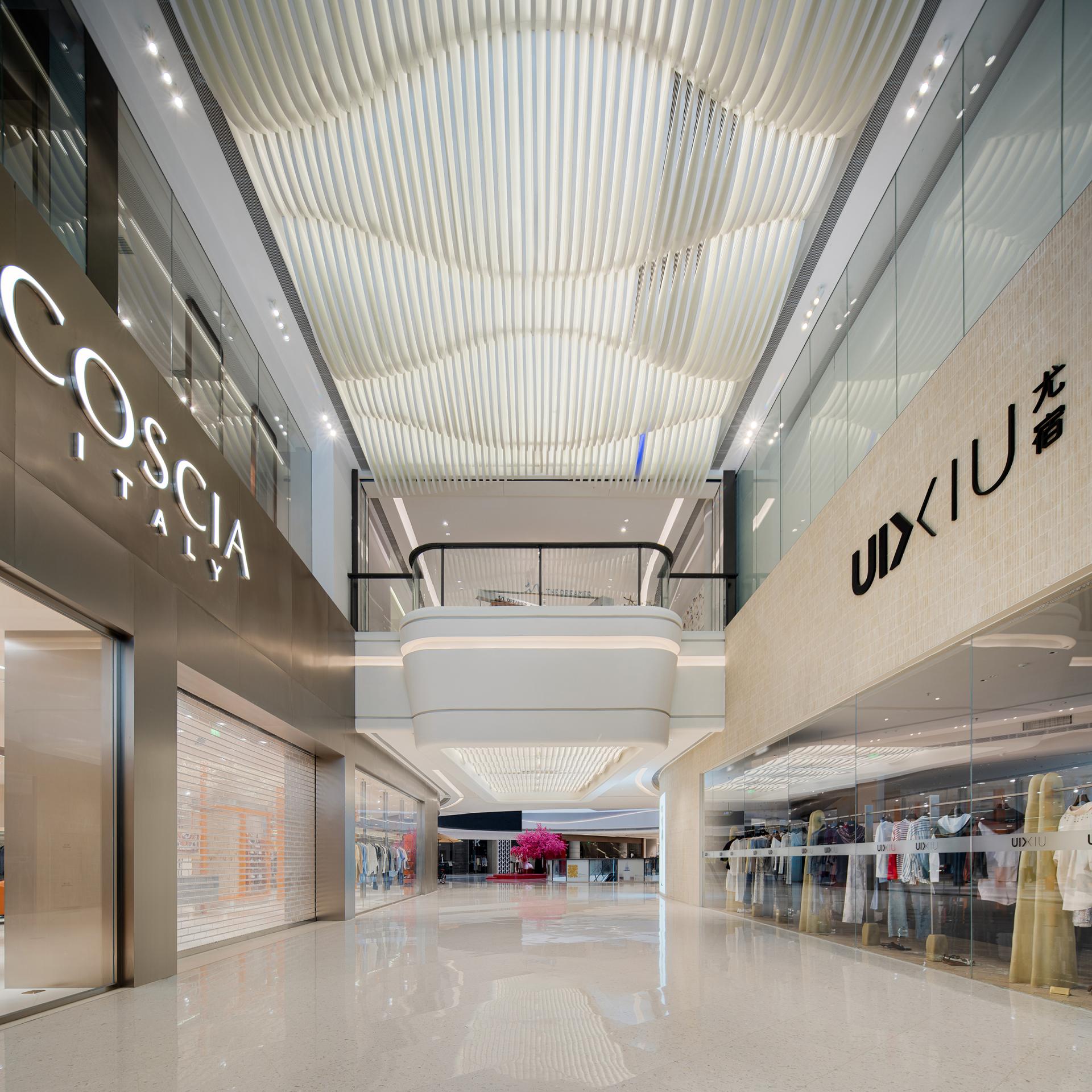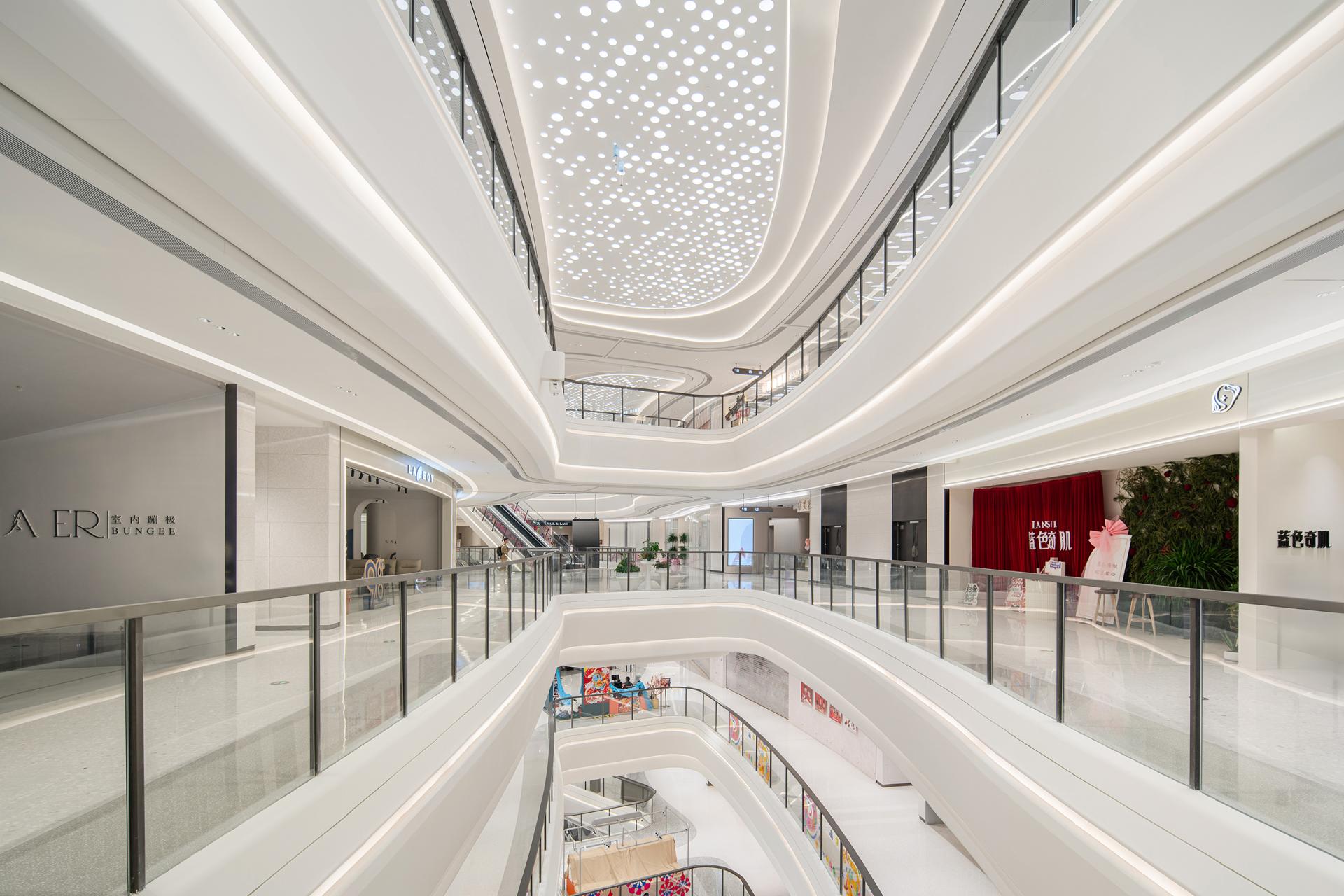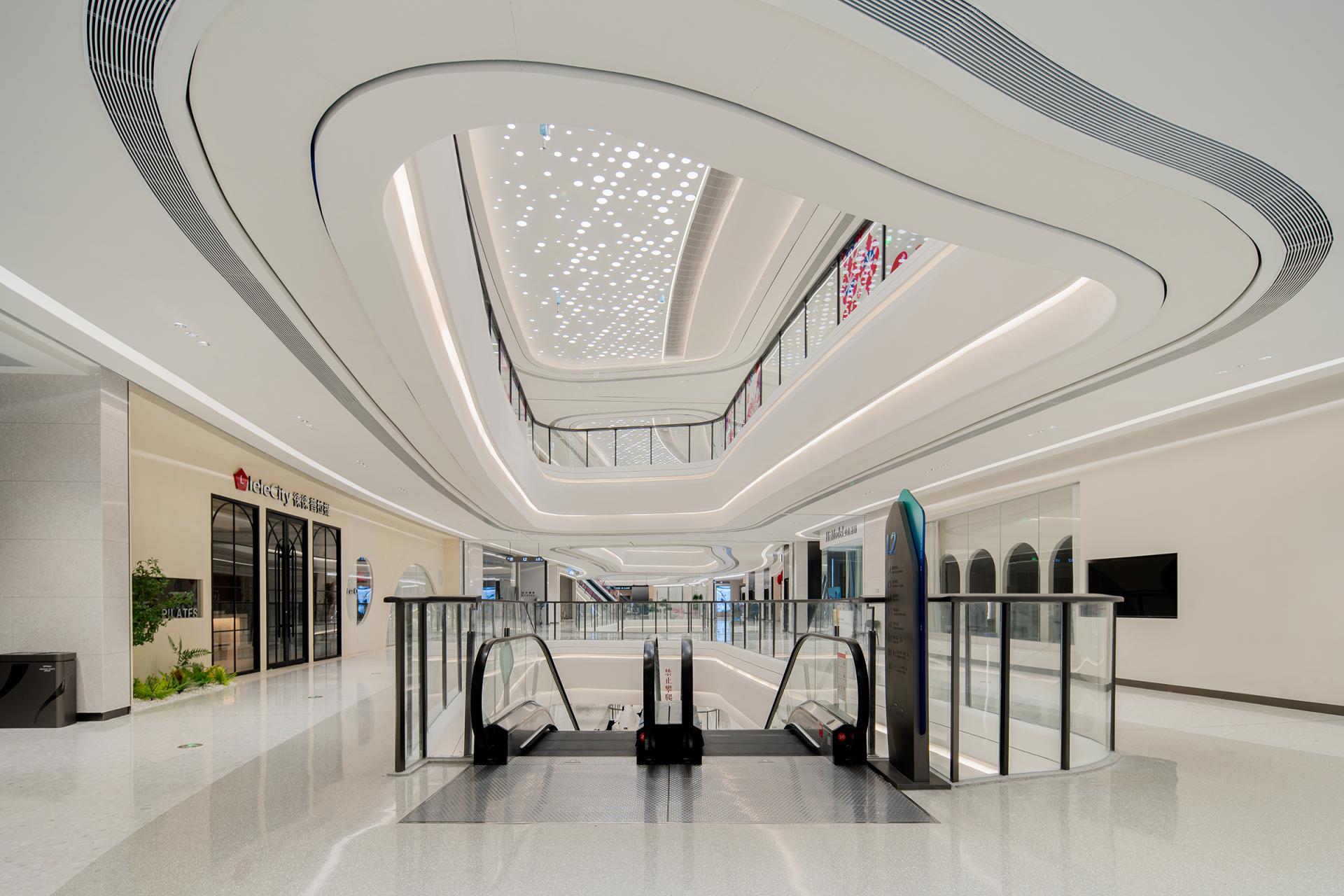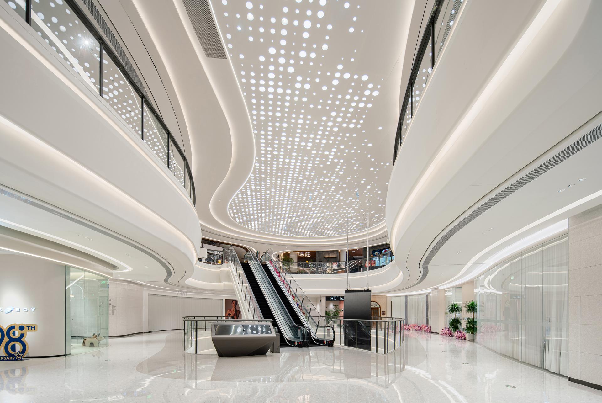The design concept originates from coastal morphology, establishing a nuanced dialogue between the project's geographical context and architectural vernacular. Natural elements including tidal rhythms, surging waves, aqueous reflections, and harbor forms undergo abstract interpretation to curate a sophisticated public realm. Above and below-grade spaces maintain stylistic continuity through chromatic juxtaposition, preserving holistic harmony while introducing stratified dimensionality. Innovative material applications such as textured stainless steel in iron-gray and white engineered stone enhance spatial modernity and opulent sensibility, ultimately forging the project's distinct visual identity through metallurgic artistry and lithic precision. Upon entering the retail complex, an undulating grille ceiling system integrated with recessed lighting arrays achieves dual objectives-providing optimized illumination while instilling spatial dynamism through rhythmic articulation. The atrium, serving as the retail nucleus, features an undulating ceiling with organic curvilinear forms punctuated by strategically positioned luminous nodes, evoking the ethereal quality of a stellar constellation. Meticulous spatial orchestration interconnects multi-level structures via escalators and transparent glass balustrades, achieving seamless vertical circulation that ensures pedestrian safety while instilling spatial fluidity. A monumental LED media wall delivers immersive audiovisuals that foster emotional resonance between patrons and brands, crafting sensorial retail immersion. The ground level bathed in luminosity offers programmatic versatility for curated events or leisure configurations, while terraced commercial zones across upper floors demonstrate strategic tenant curation through precise functional zoning-catering to diverse consumer paradigms via calibrated spatial syntax. The overall design adheres to a philosophy of refined simplicity, anchored by a pristine white palette artfully accented with subtle touches of charcoal and slate gray. This harmonious interplay cultivates a sophisticated contemporary ambiance that resonates with understated elegance. Social engagement and artistic expression are seamlessly woven into the spatial narrative, elevating the environment's cultural resonance while offering patrons immersive aesthetic encounters. Contemporary luxury manifests through meticulous detailing, where material innovation creates striking visual dialogues and multifunctional zoning optimizes spatial fluidity. The deliberate fusion of artistry and architecture transforms the venue into a cultural crucible - not merely a retail destination, but an urban showcase celebrating elevated living.
