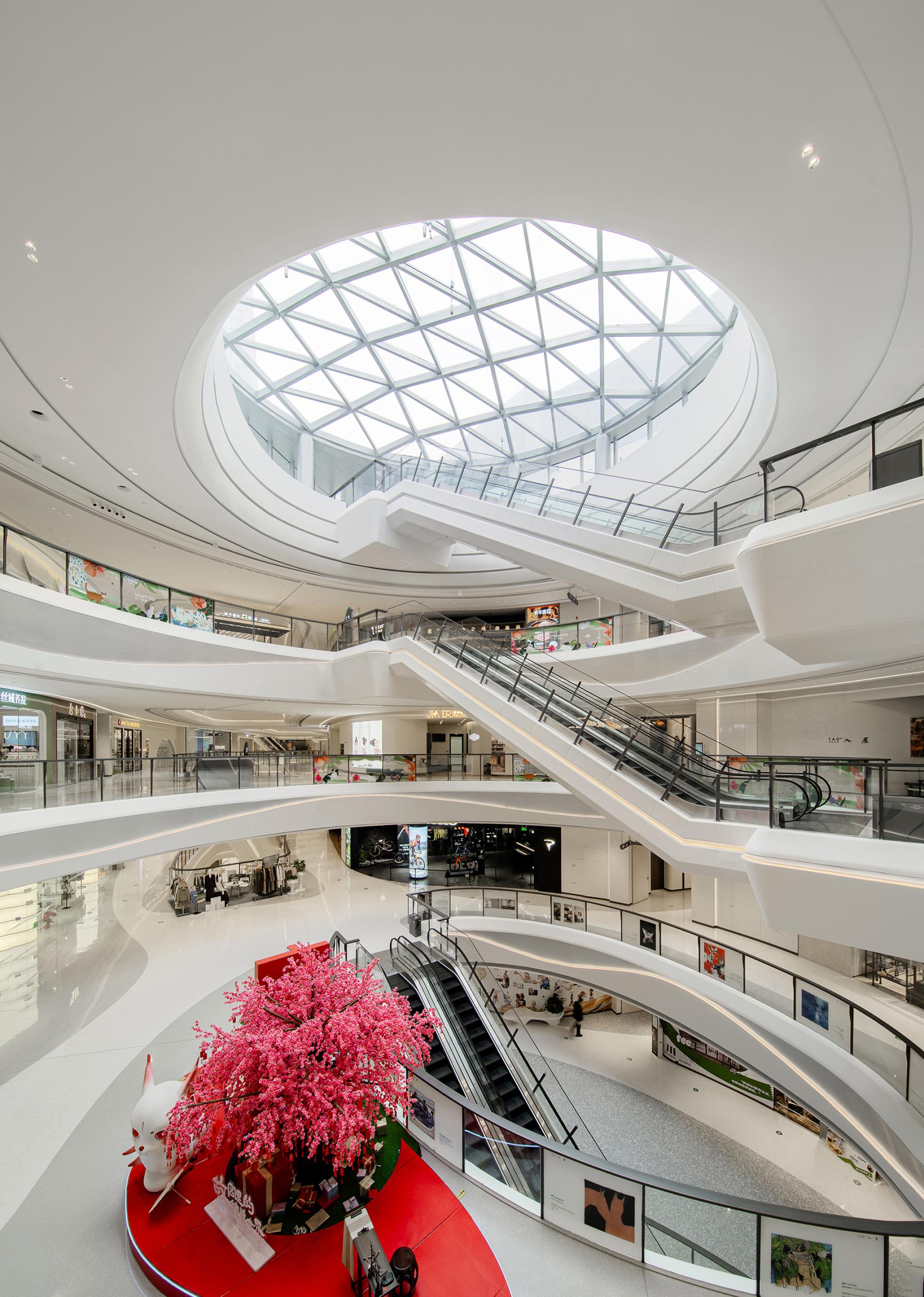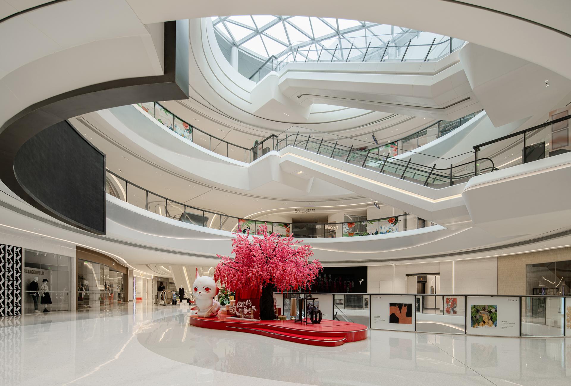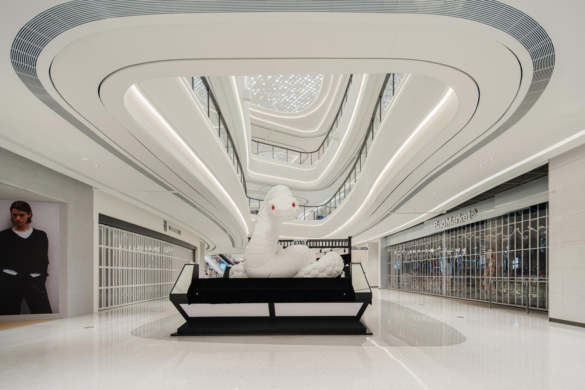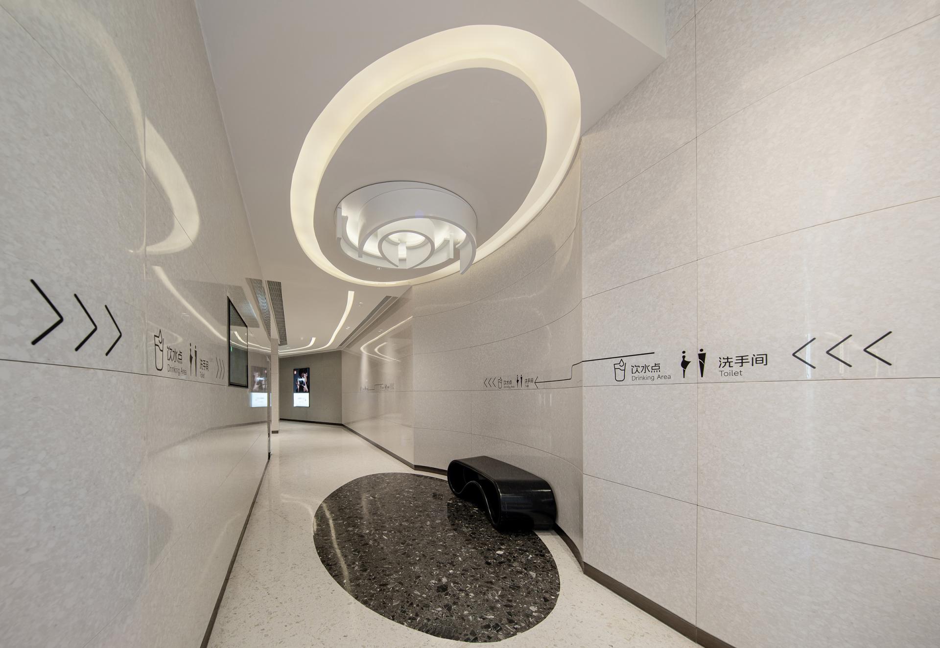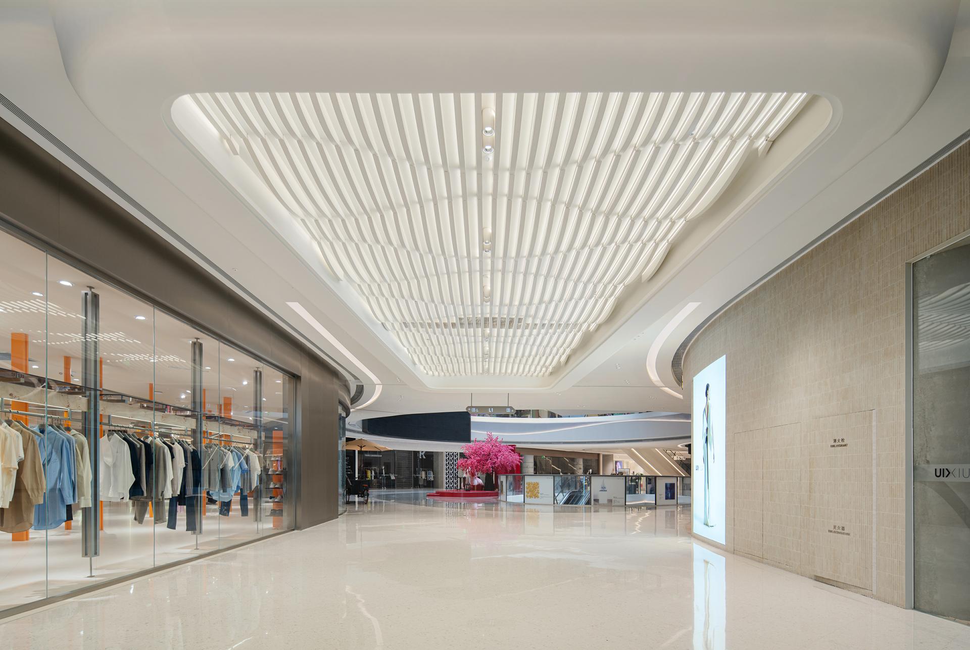 The design concept originates from coastal morphology, establishing a nuanced dialogue between the project's geographical context and architectural vernacular. Natural elements including tidal rhythms, surging waves, aqueous reflections, and harbor forms undergo abstract interpretation to curate a sophisticated public realm. Above and below-grade spaces maintain stylistic continuity through chromatic juxtaposition, preserving holistic harmony while introducing stratified dimensionality. Innovative material applications such as textured stainless steel in iron-gray and white engineered stone enhance spatial modernity and opulent sensibility, ultimately forging the project's distinct visual identity through metallurgic artistry and lithic precision. Upon entering the retail complex, an undulating grille ceiling system integrated with recessed lighting arrays achieves dual objectives-providing optimized illumination while instilling spatial dynamism through rhythmic articulation. The atrium, serving as the retail nucleus, features an undulating ceiling with organic curvilinear forms punctuated by strategically positioned luminous nodes, evoking the ethereal quality of a stellar constellation. Meticulous spatial orchestration interconnects multi-level structures via escalators and transparent glass balustrades, achieving seamless vertical circulation that ensures pedestrian safety while instilling spatial fluidity. A monumental LED media wall delivers immersive audiovisuals that foster emotional resonance between patrons and brands, crafting sensorial retail immersion. The ground level bathed in luminosity offers programmatic versatility for curated events or leisure configurations, while terraced commercial zones across upper floors demonstrate strategic tenant curation through precise functional zoning-catering to diverse consumer paradigms via calibrated spatial syntax. The overall design adheres to a philosophy of refined simplicity, anchored by a pristine white palette artfully accented with subtle touches of charcoal and slate gray. This harmonious interplay cultivates a sophisticated contemporary ambiance that resonates with understated elegance. Social engagement and artistic expression are seamlessly woven into the spatial narrative, elevating the environment's cultural resonance while offering patrons immersive aesthetic encounters. Contemporary luxury manifests through meticulous detailing, where material innovation creates striking visual dialogues and multifunctional zoning optimizes spatial fluidity. The deliberate fusion of artistry and architecture transforms the venue into a cultural crucible - not merely a retail destination, but an urban showcase celebrating elevated living.