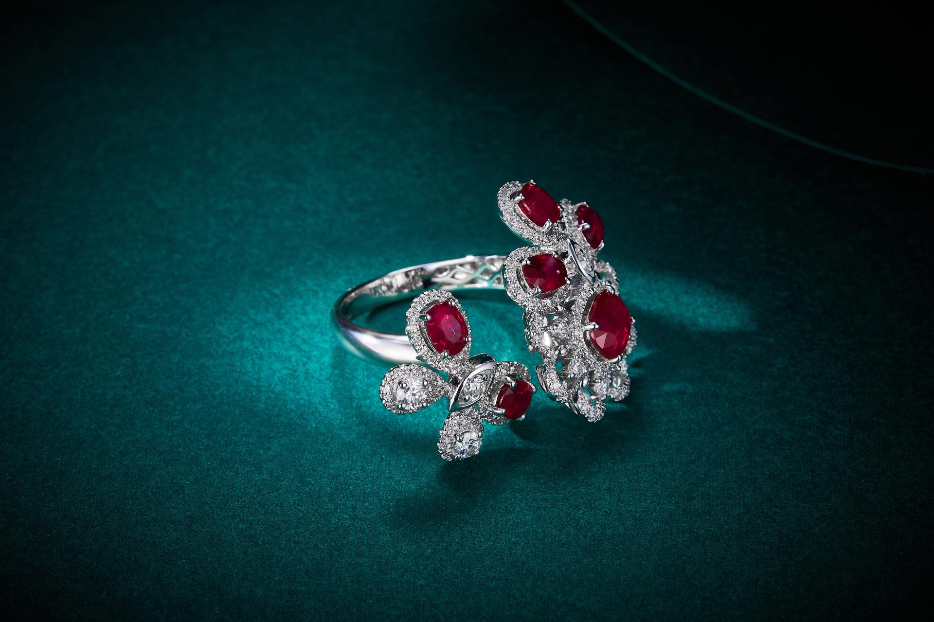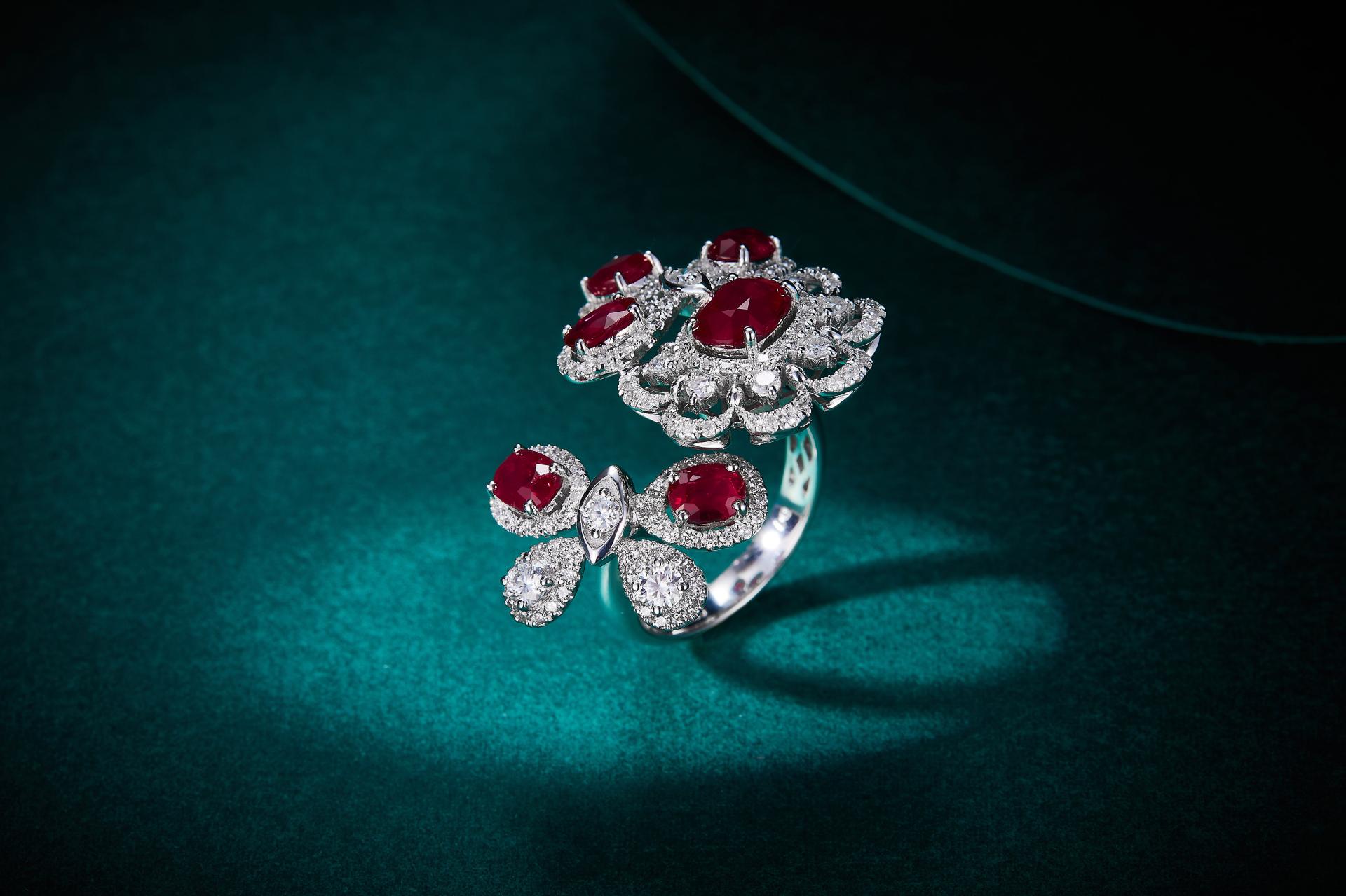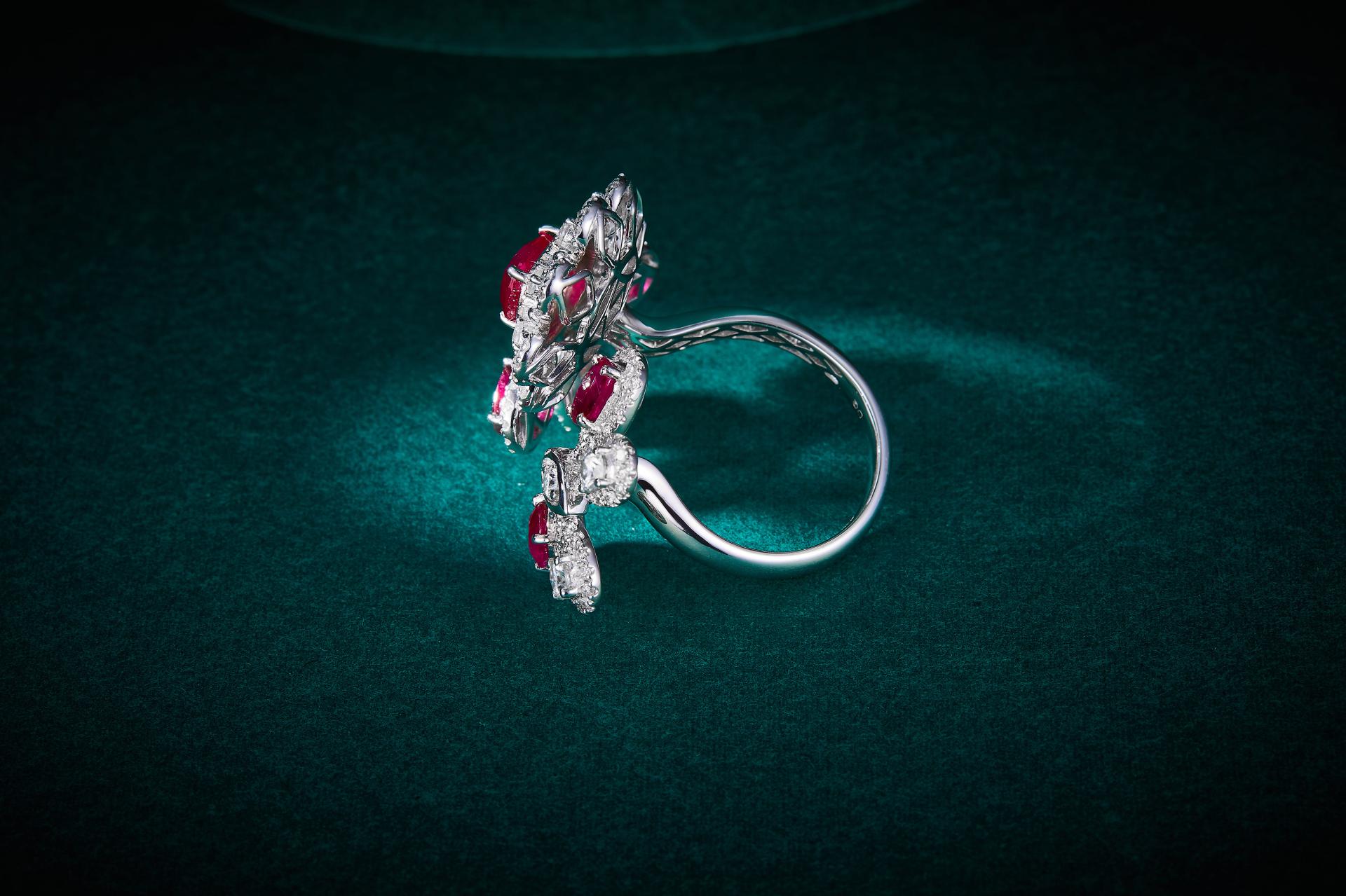 The center stone is an unheated Burmese ruby, whose natural inclusions and rare hue are preserved—celebrating the raw, unfiltered beauty that mirrors the purity of true love. The contrast between the cool-toned platinum setting and the crimson ruby creates a visual balance of warmth and coolness, symbolizing the purity of commitment and the intensity of love. Crafted from 18K gold, the structure supports complex openwork and resists corrosion, ensuring lasting brilliance. The diamond setting technique enhances the ruby’s brilliance and clarity, while both the gold and diamonds are 100% recyclable and reusable—affirming a commitment to sustainability and the circular economy in the jewelry industry.