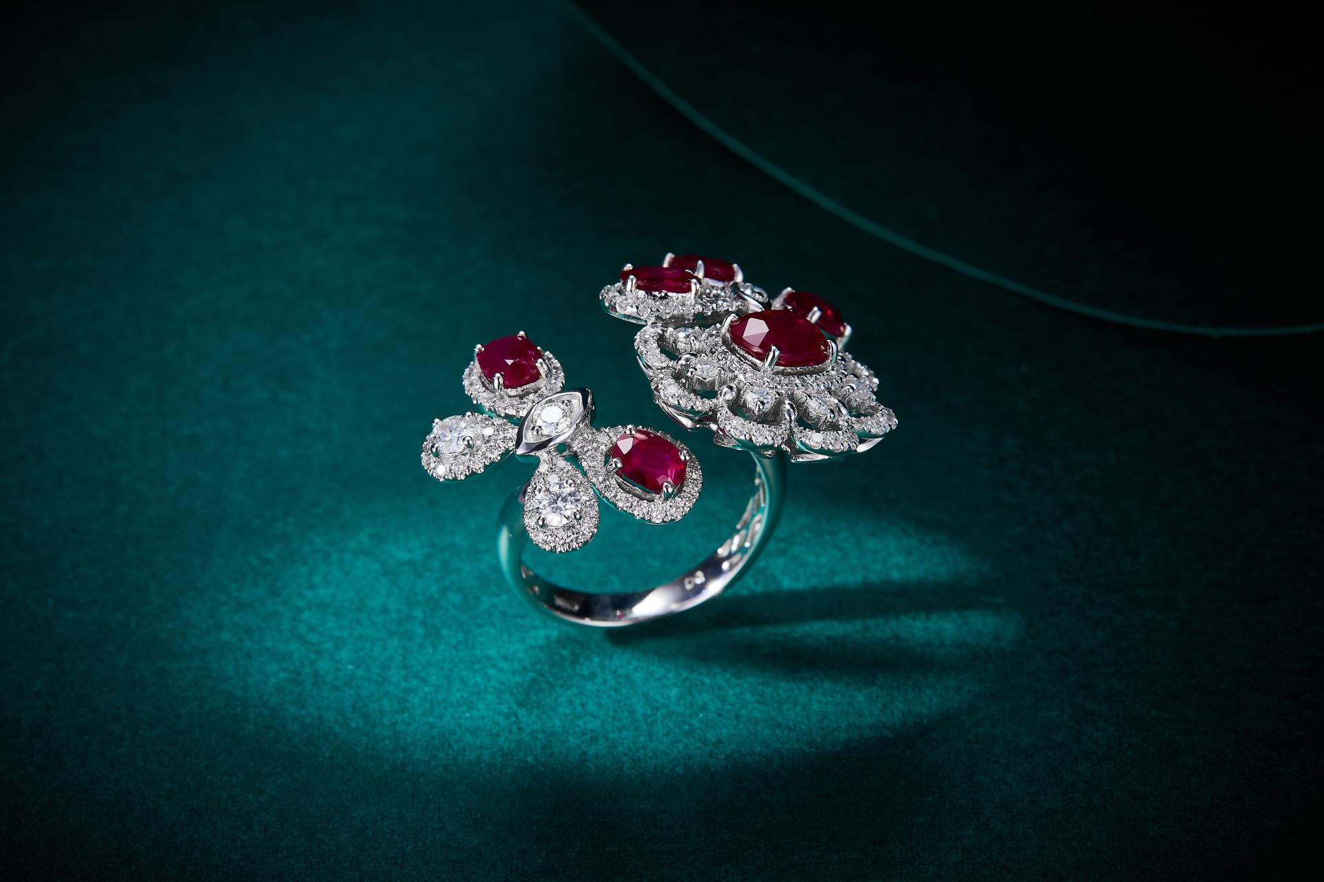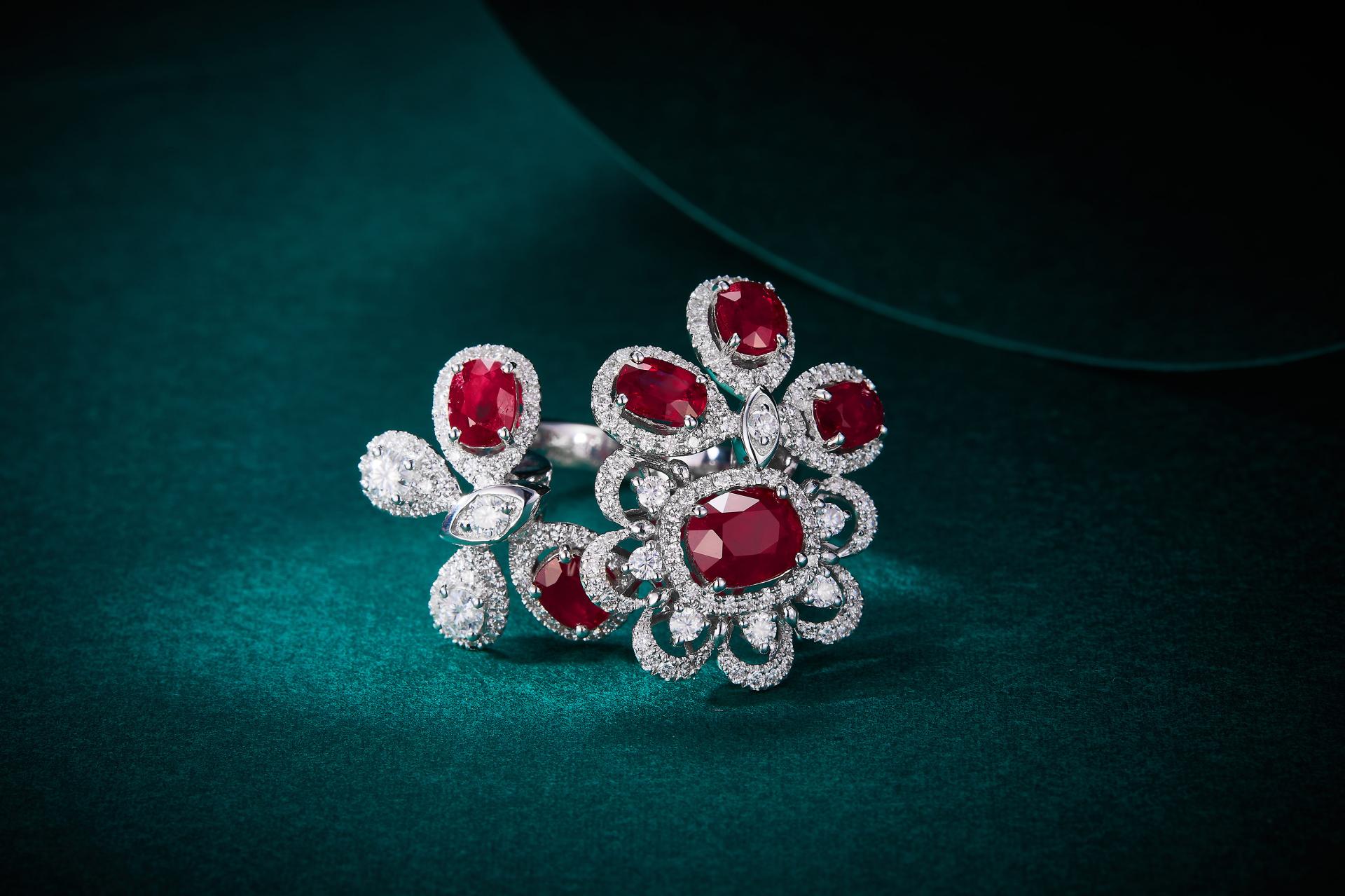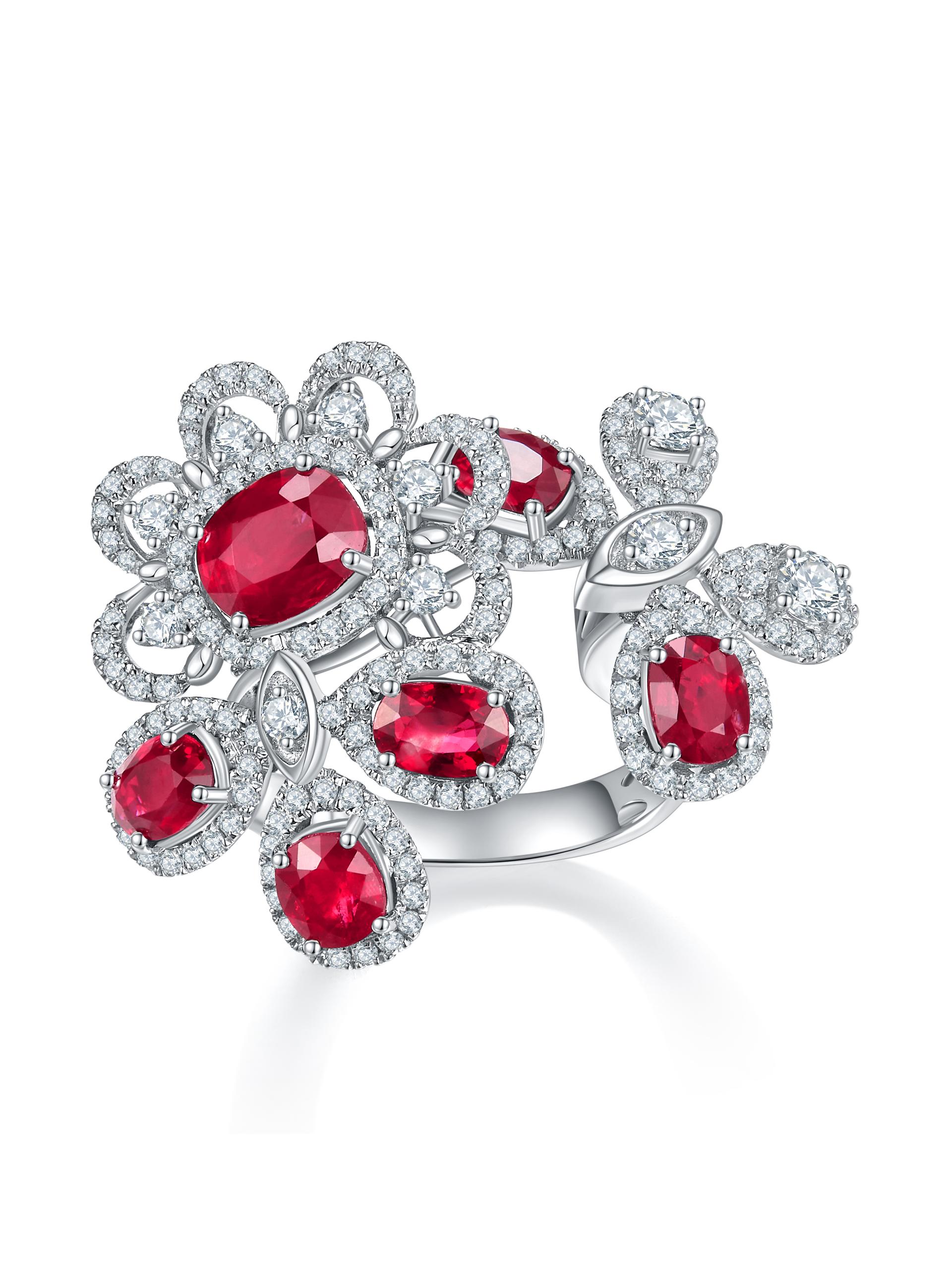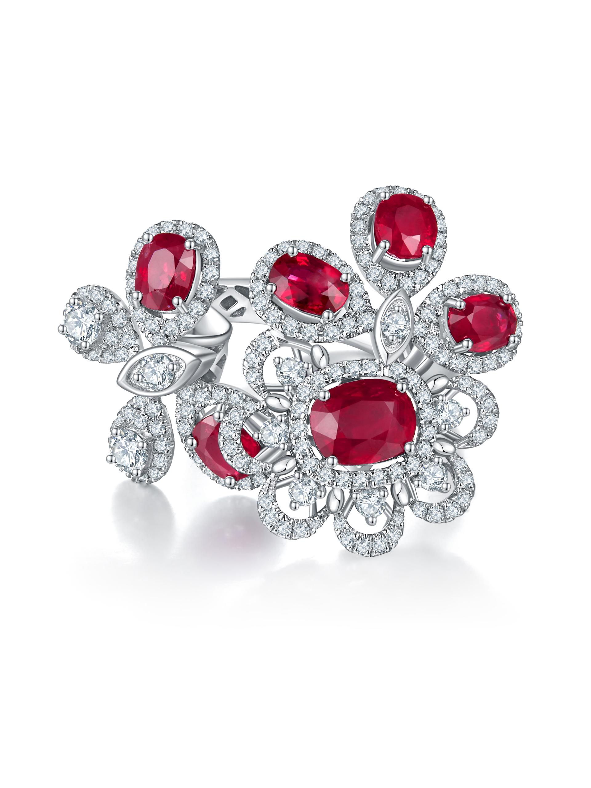 The center stone is an unheated Burmese ruby, whose natural inclusions and rare hue are preserved—celebrating the raw, unfiltered beauty that mirrors the purity of true love. The contrast between the cool-toned platinum setting and the crimson ruby creates a visual balance of warmth and coolness, symbolizing the purity of commitment and the intensity of love. Crafted from 18K gold, the structure supports complex openwork and resists corrosion, ensuring lasting brilliance. The diamond setting technique enhances the ruby’s brilliance and clarity, while both the gold and diamonds are 100% recyclable and reusable—affirming a commitment to sustainability and the circular economy in the jewelry industry.