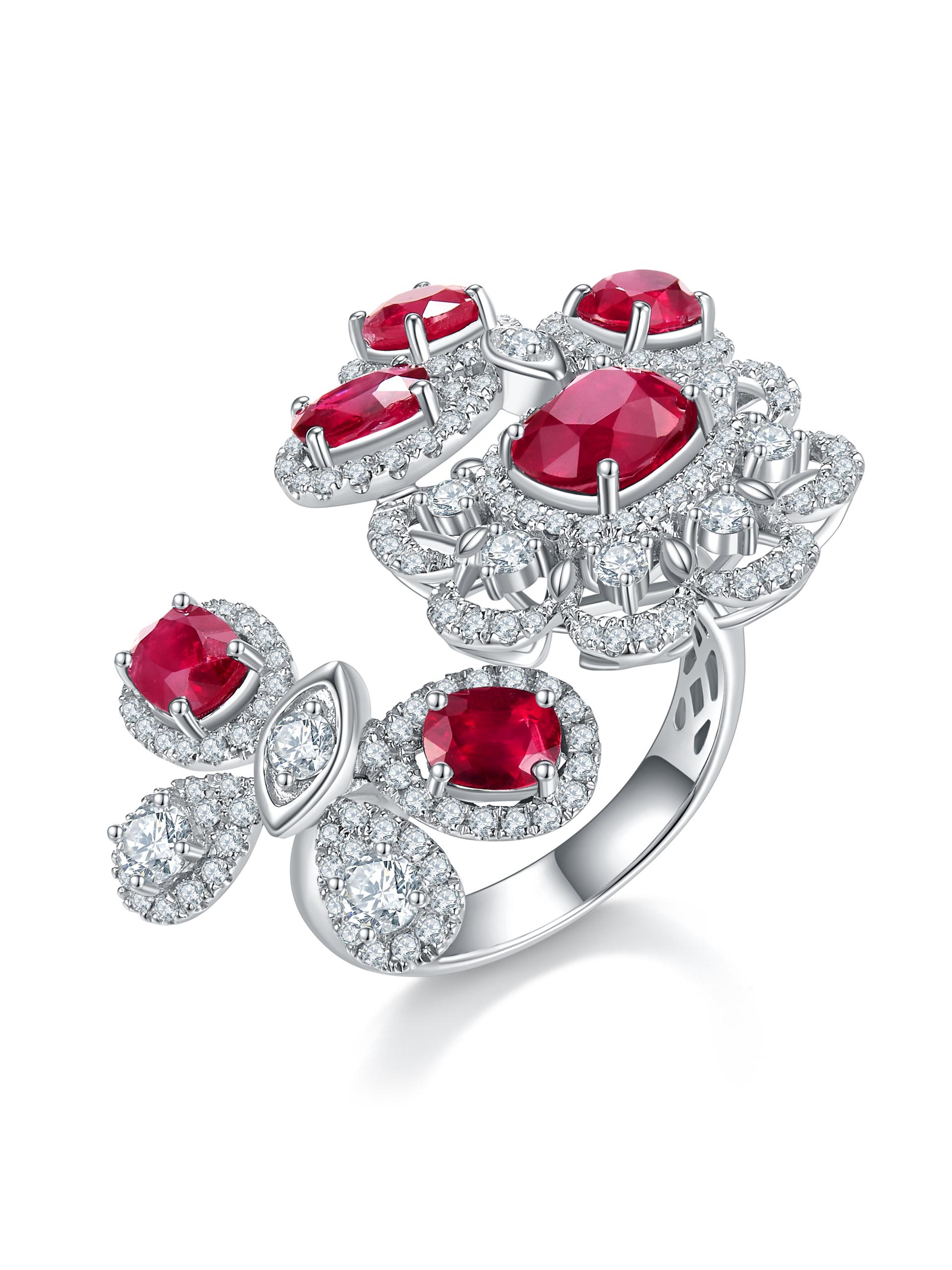 The ring setting takes its form from the fluttering butterfly and layered flower petals. Through delicate openwork craftsmanship and the interlacing of micro-set diamonds (D–E color grade, IF clarity), it constructs a layered spatial imagery where butterflies circle the flower and petals mirror its fluttering form. Along the band, diamonds shimmer like morning dew, their cool brilliance forming a striking contrast to the crimson of the unheated Burmese ruby. With the flow of light, it brings to life the vitality of butterflies gliding through flowers. Breaking free from conventional symmetry, the ring band imitates the natural arcs of butterfly wings and flower petals. Its gradient curve ensures a comfortable fit on both hands, achieving a balance between artistic tension and ergonomic ease. The openwork edges are smoothly finished and carefully crafted to prevent snagging, embodying the modern jewelry philosophy: “Form follows function”.