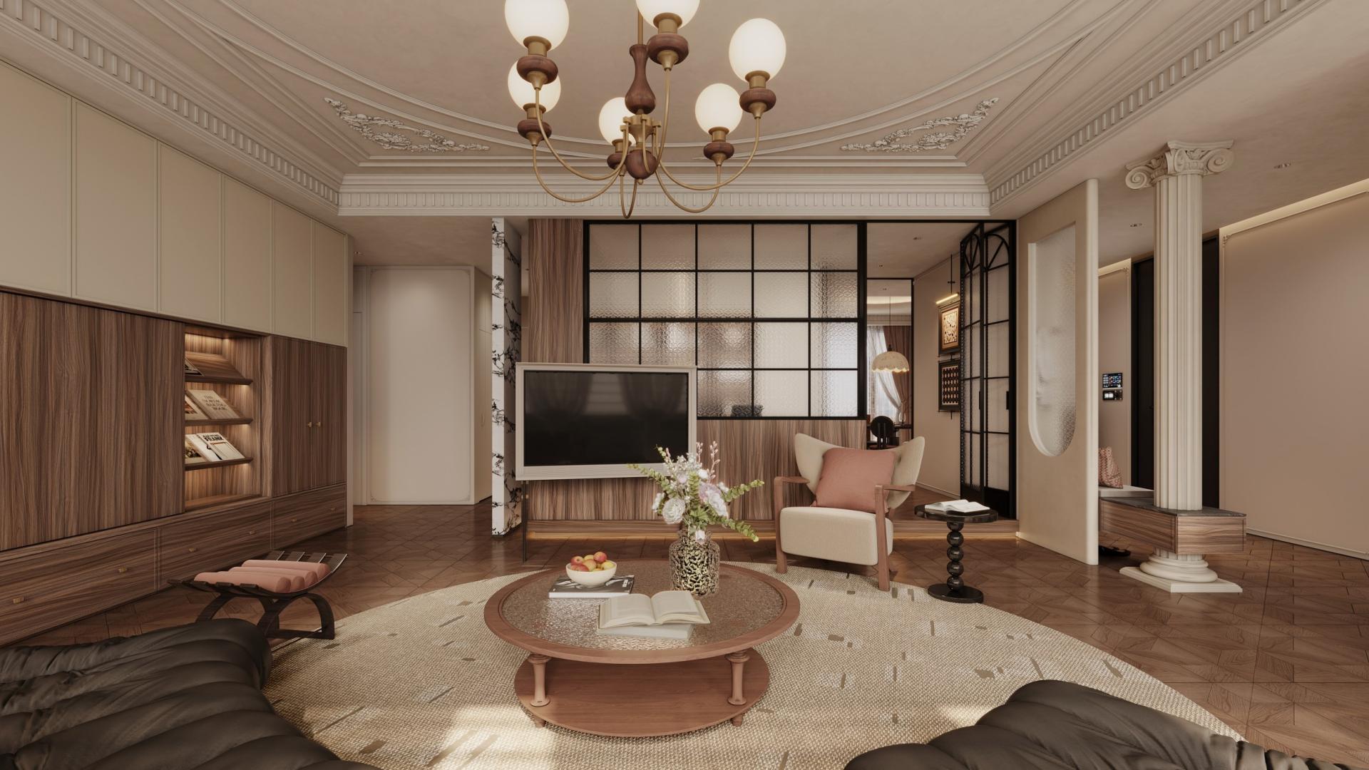 The overall color tone of the space is in earth colors. The beige walls are matched with brown walnut, and local areas are decorated with metallic luster and misty pink, presenting a stable and elegant atmosphere like a classical oil painting. With an open layout as the core concept, the flowing lines in the living room make the entire area more vivid. The multi-functional living room integrates the functions of a study, a tea-tasting area, and a reading area, while the master bedroom emphasizes privacy.