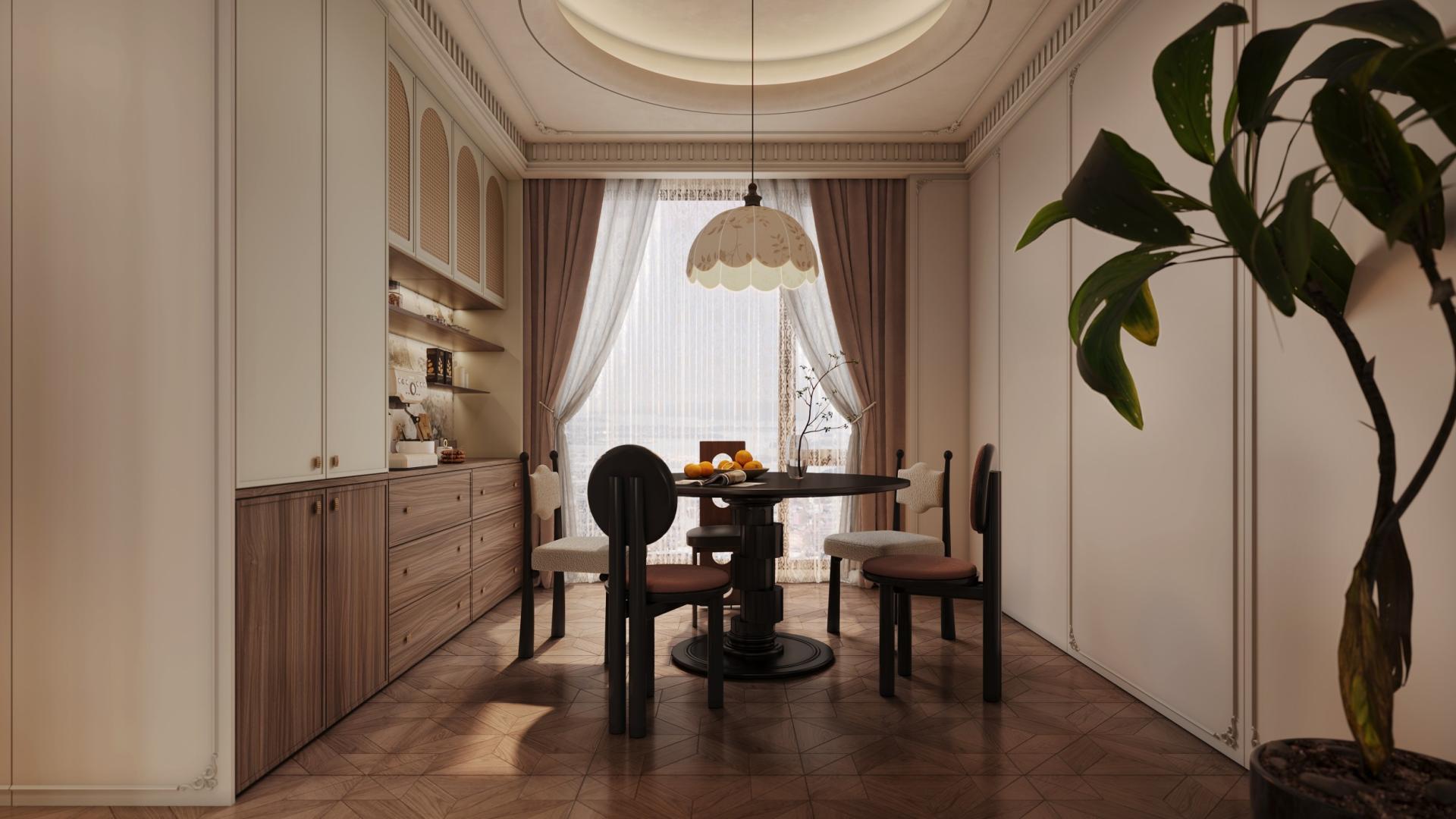 The design inspiration of this project is derived from the dreamy European castles. By combining the sense of array lines and carved elements of French architecture, an aesthetic with rich layers is injected into the space. The interlacing and intertwining of lines create a visual effect full of dynamics and tension. The design of carved elements breaks the traditional vertical and horizontal straight lines, endowing the space with extraordinary dynamism and a unique form. Paired with the soft curves of the curved sofa, the irregular single chair, and the round dining table, the space exudes elegance.