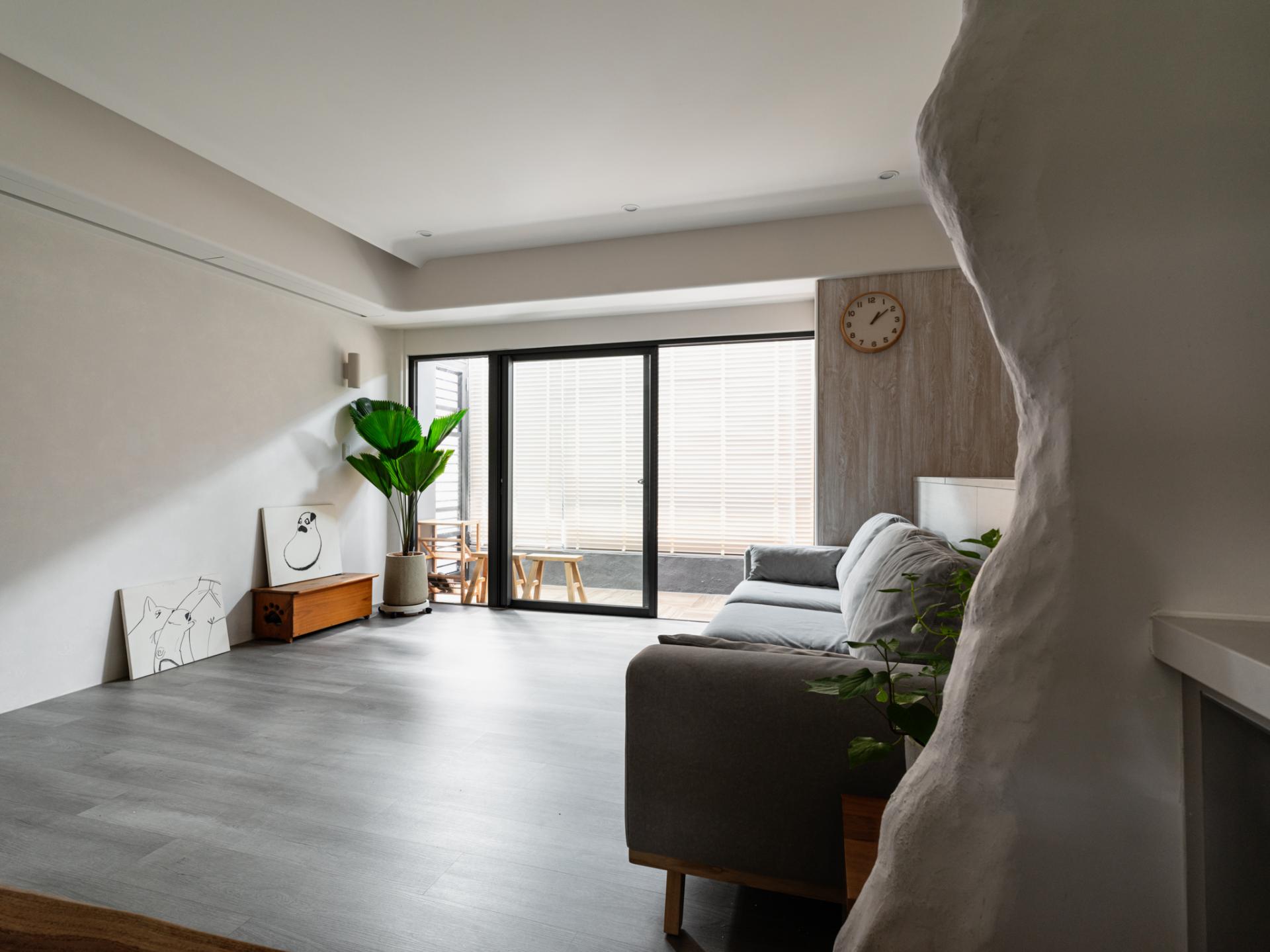 The existing structure posed significant challenges: a low ceiling height of just 2.8 meters, outdated electrical and plumbing systems, and a fragmented floor plan. The design team addressed these by selectively removing partitions, and introducing rounded corners throughout to eliminate sharp transitions. The spatial language is soft yet grounded, merging wabi-sabi restraint with pragmatic living.