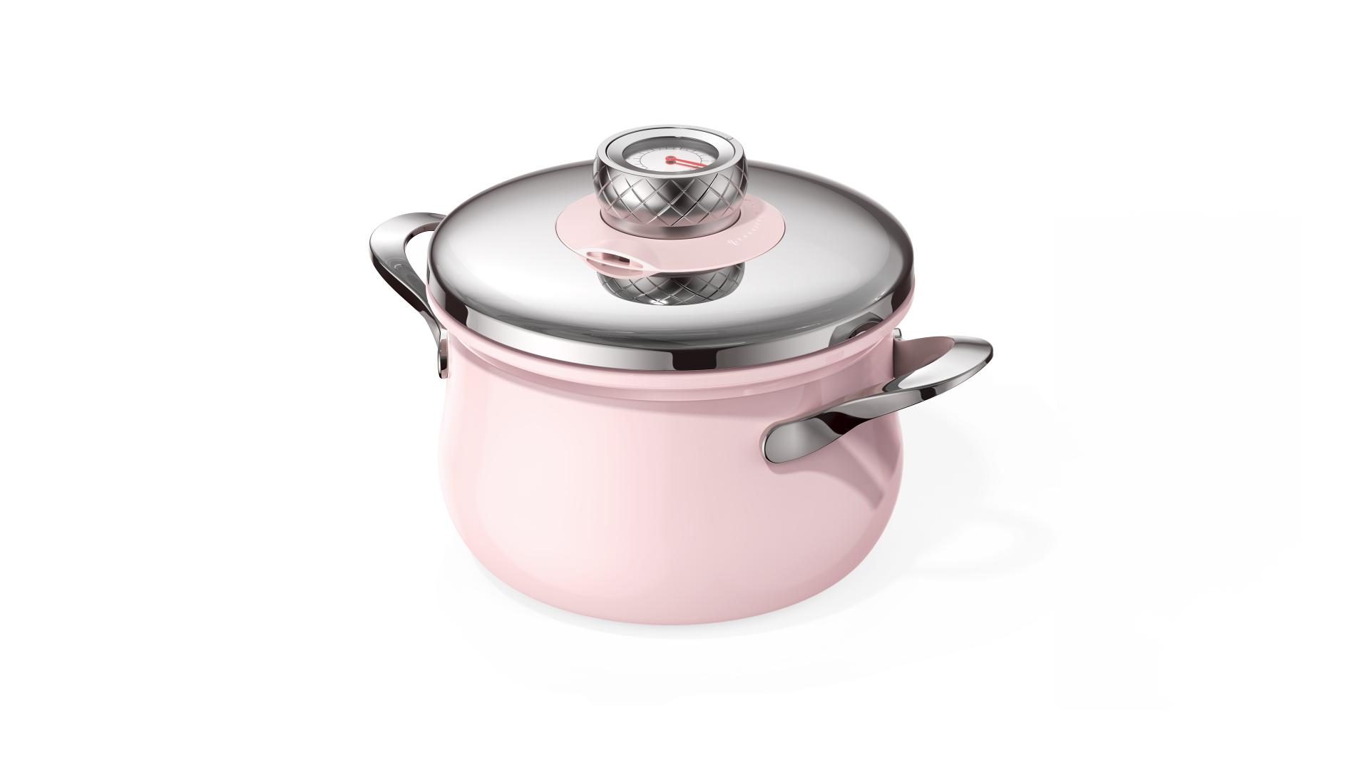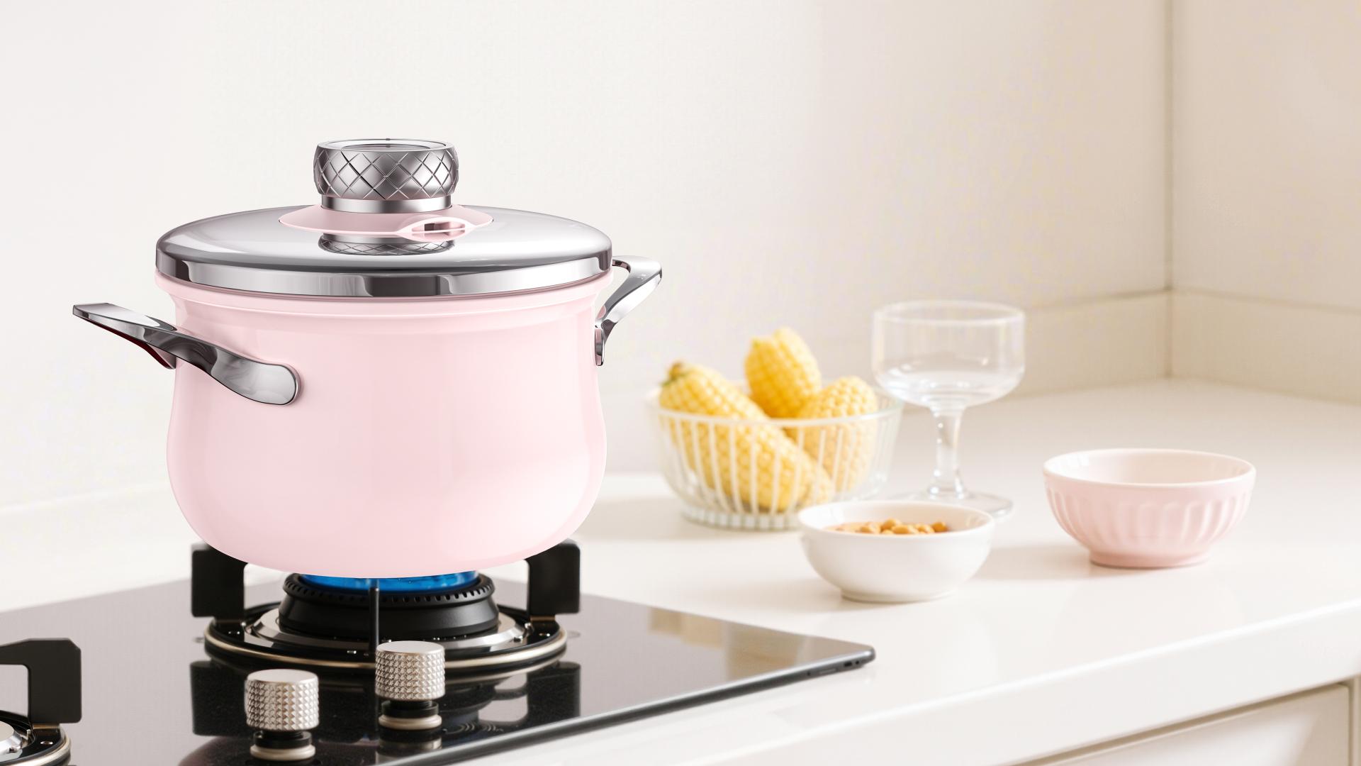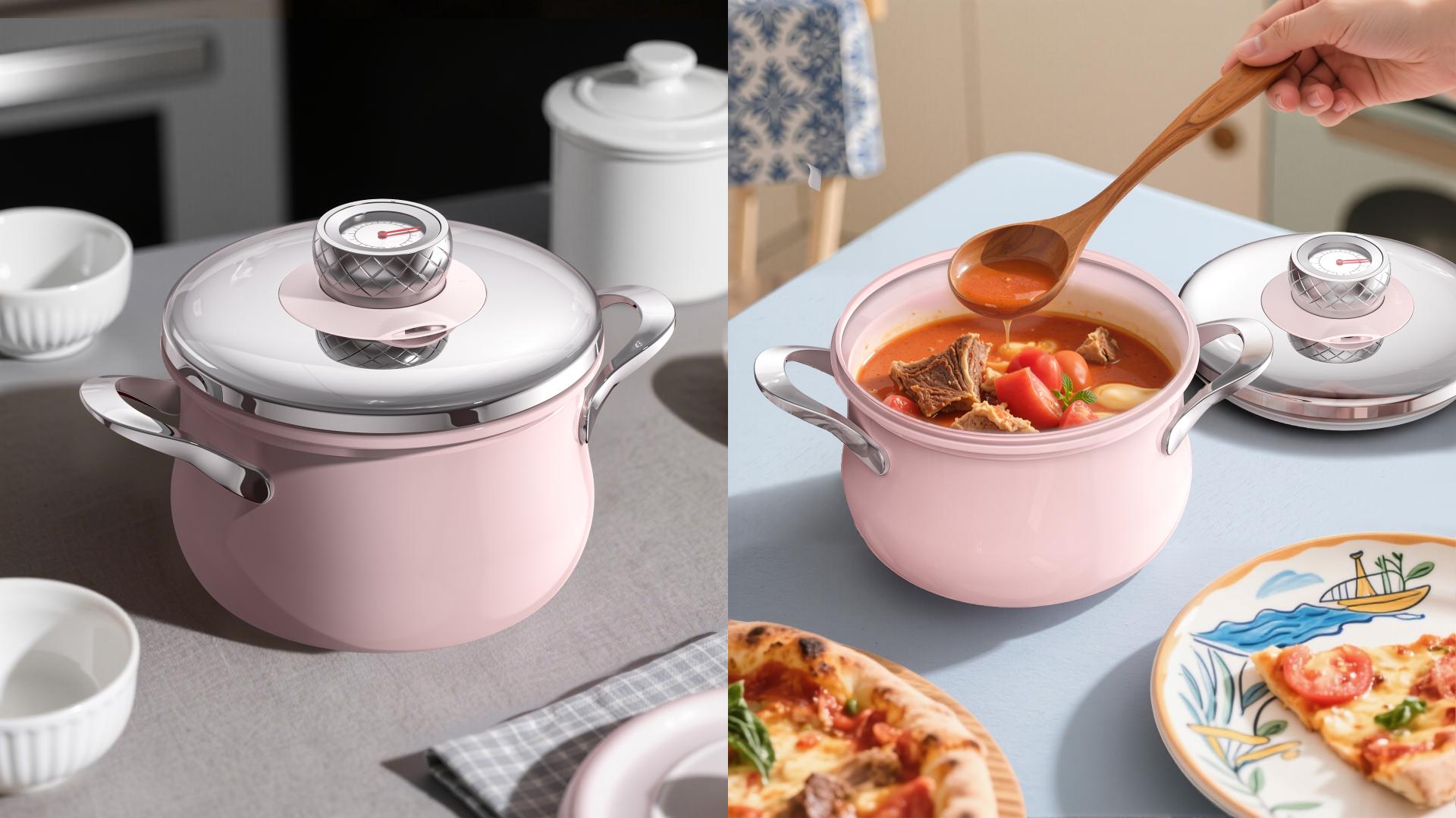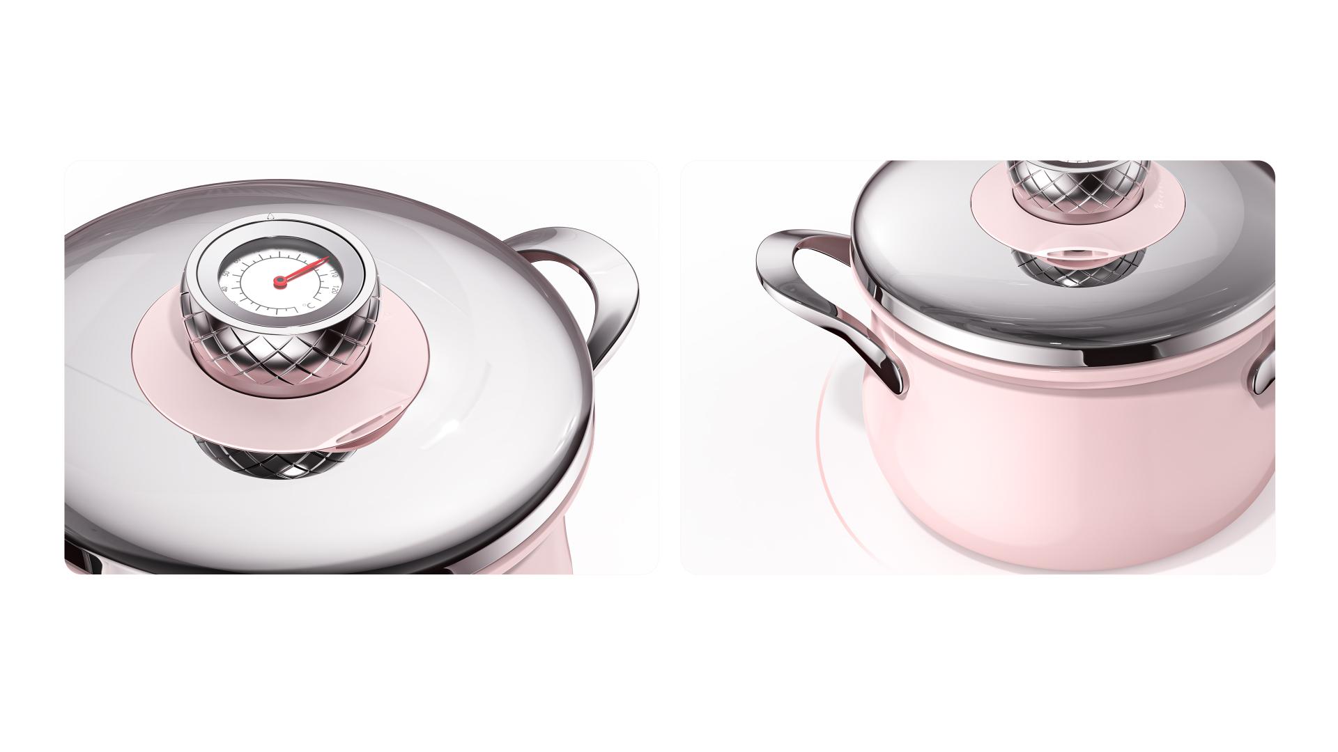 The fully enclosed lid eliminates exposed clasps and mechanisms, creating a clean, minimal top-view geometry. Its mirror-polished stainless steel and fine spray-coated finishes harmonize soft pink tones with metallic textures for a refined visual language. The rounded, gentle form is crafted for contemporary households valuing both function and style, adding warmth and elegance to kitchen spaces.