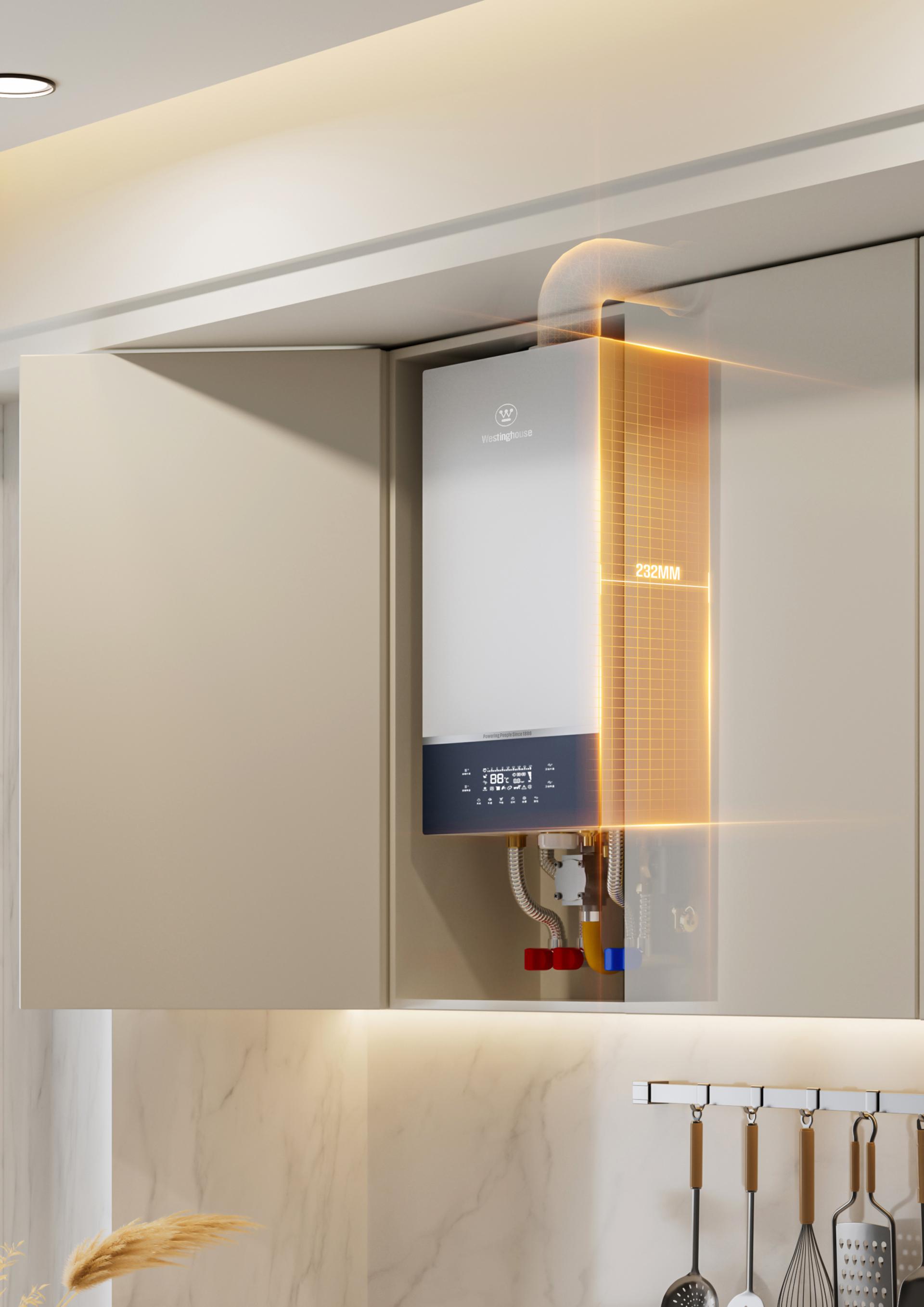 Breaking away from designs common in conventional household appliances, WT1 Mini employs graceful curves from mountains and oceans instead of industrial boxy silhouettes, complemented by a color scheme based on the golden ratio (8:2) and ripple-glowing surface technology, elevating the heating device to an aesthetic centerpiece for modern living spaces. Through the optimization of precision structures, it reduces the size by 46%, perfectly adapting to small households and multi-functional spaces for maximized spatial efficiency. At its core, innovative premixed condensing combustion technology achieves an ultra-high thermal efficiency of 108%, significantly decreasing energy consumption and carbon emissions to accelerate the transition to high-efficiency, low-carbon household energy solutions. Moreover, the product boasts both heating and hot water functions, providing underfloor heating, radiator warming, and bathing modes. This ensures effortless climate control and hot water access to well satisfy whole-house daily needs while eliminating the hassle of installing multiple appliances.