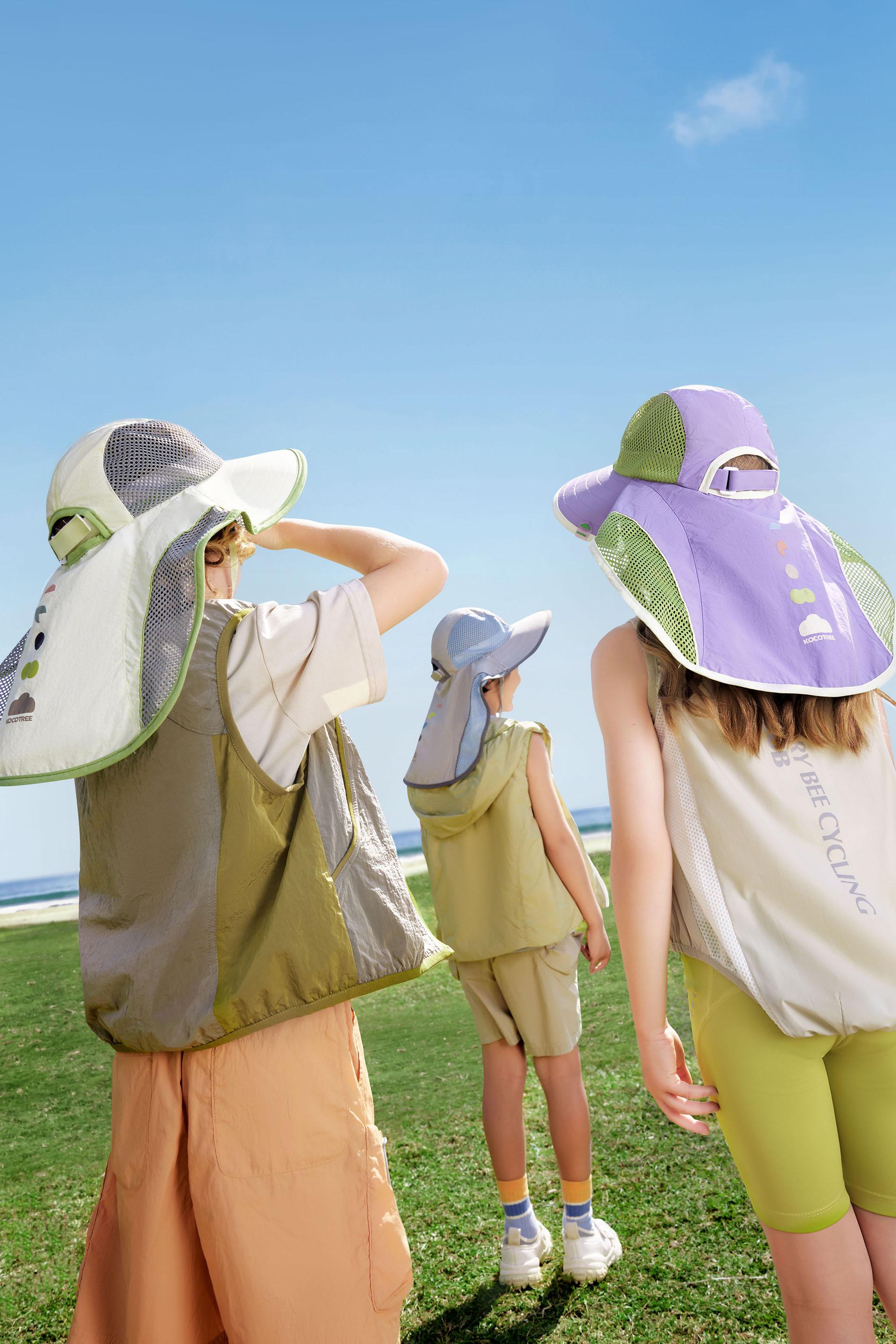 The bold color blocking and breathable mesh panels not only elevate the visual appeal but also promote optimal airflow to prevent overheating and sweat buildup. Kocotree Sunscreen Shawl Hat boosts children's engagement with protective gear through playful functionality. Its chemical-free, original yarn fabric ensures no heavy metals or fluorescent whitening agents, aligning with the core design philosophy of prioritizing children's health and safety.