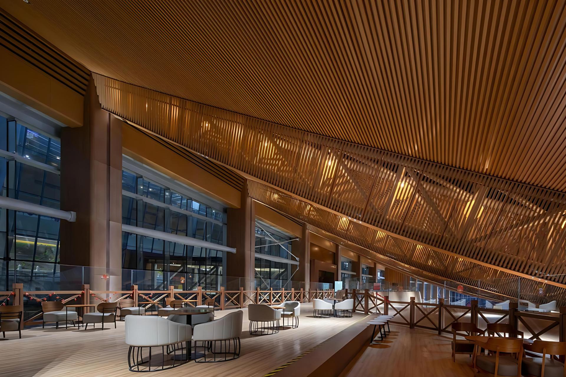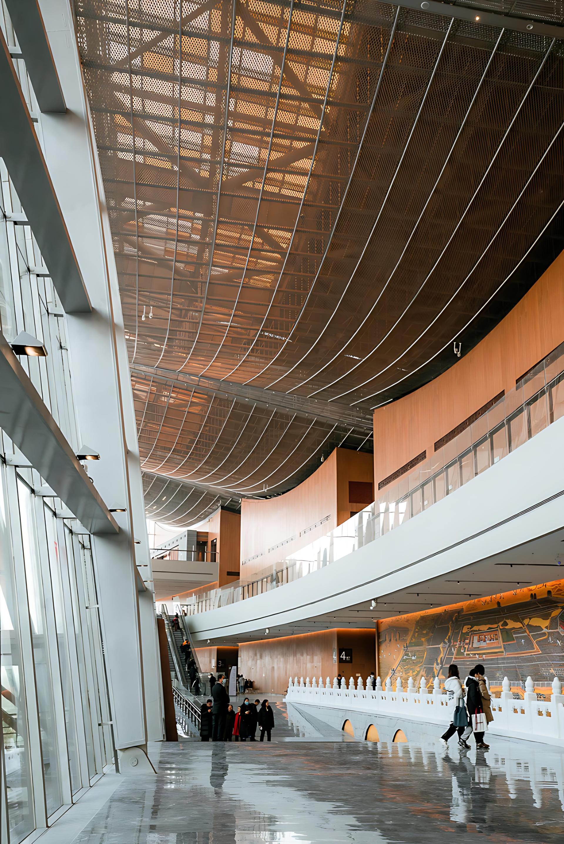 Inside, the design reflects deep cultural meaning. Warm elm wood textures harmonize with dark stone surfaces and copper-like accents, conveying the museum’s solemnity. In the Shared Hall lobby, triangular fish-belly trusses evoke small boats, with lighting mimicking flickering fishing lights—a tribute to “a thousand boats gathering.” The “City” concept is expressed through mottled dark gray stone walls paired with rippled marble floors, symbolizing “Beijing drifting on the canal.” Copper panels with cloud-and-thunder motifs enrich the decor and engage in temporal dialogue with the Capital Museum.