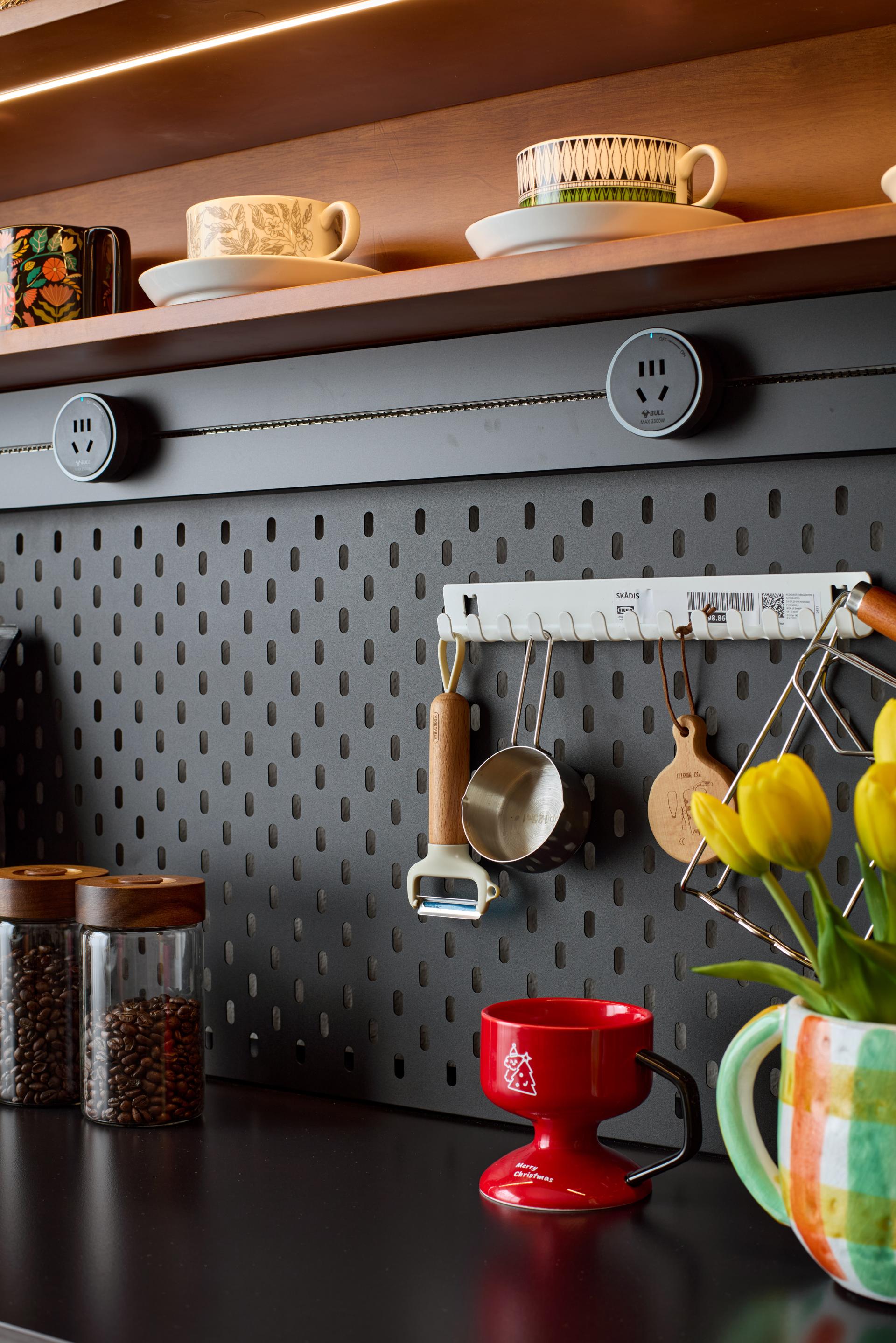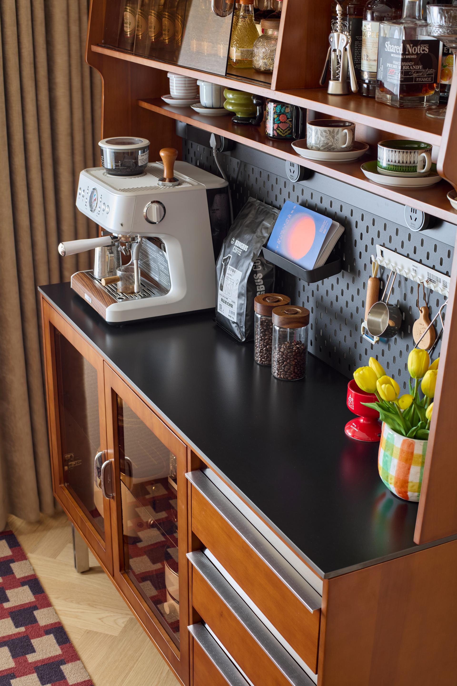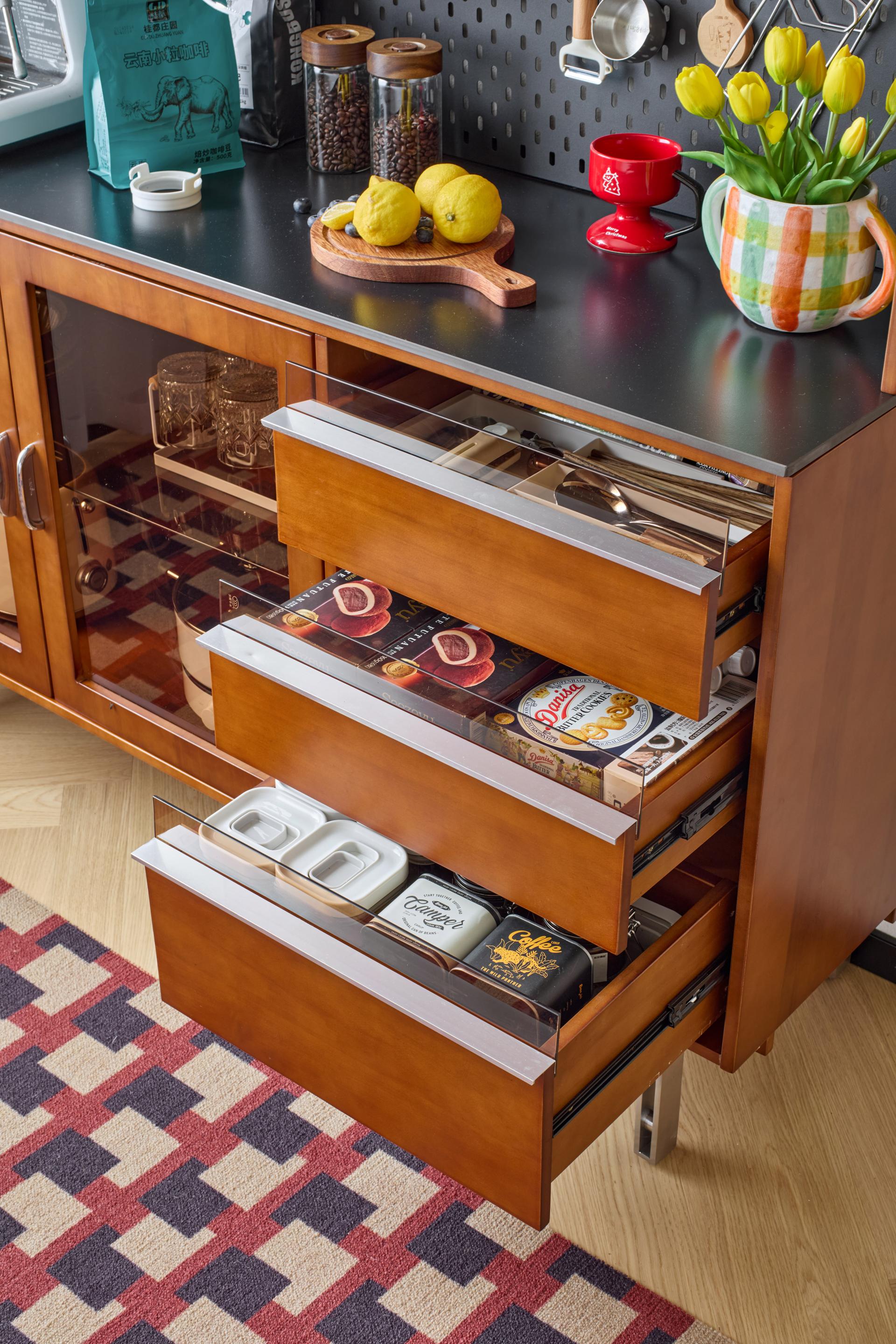 It breaks away from the traditional single storage mode of dining room cabinets, adopting a functional zoning design. The upper layer features an open design, suitable for displaying bottles, wine glasses, and other items; the middle layer can accommodate coffee machines, condiment jars, etc., and can also serve as an operation area for light catering without requiring additional planning. A pegboard can be used to hang tools or decorations. The lower layer consists of enclosed cabinets and drawers, providing storage space, creating an orderly composition of "display-operation-storage." This design meets contemporary people's needs to achieve storage, display, and light catering operations within limited space, aiming to create a "multifunctional and cozy living space" for family users, achieving the unity of "practicality" and "aesthetics."