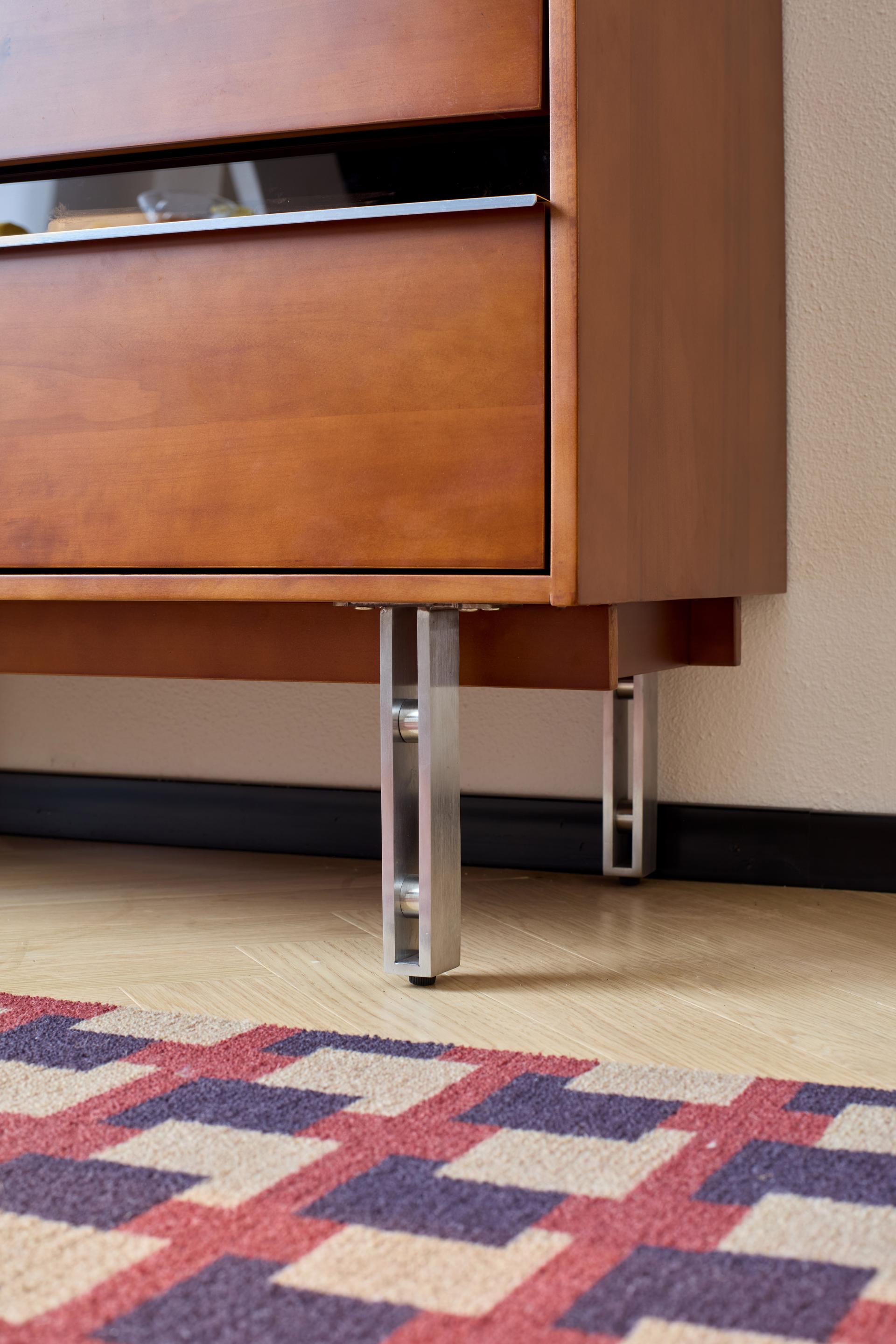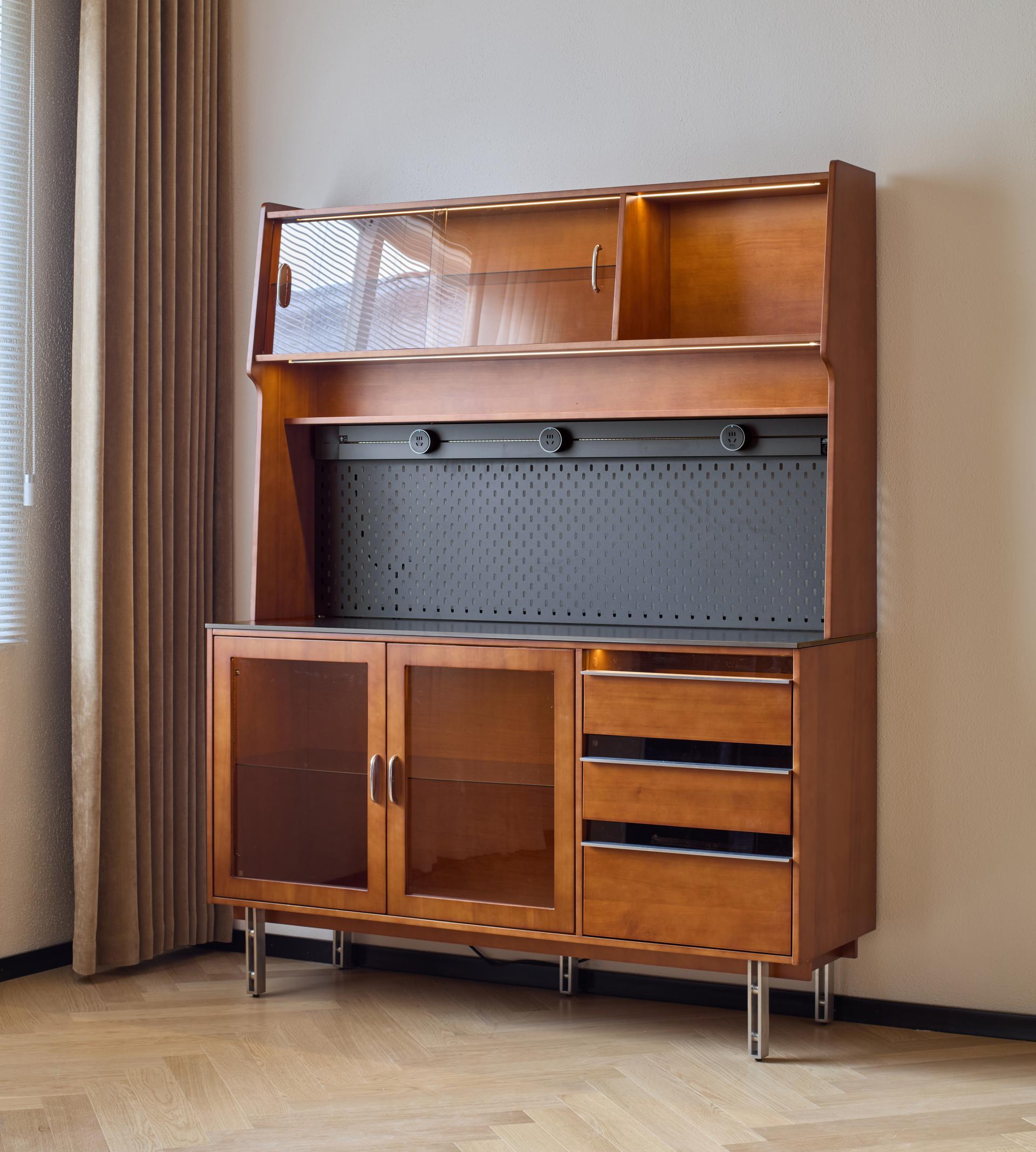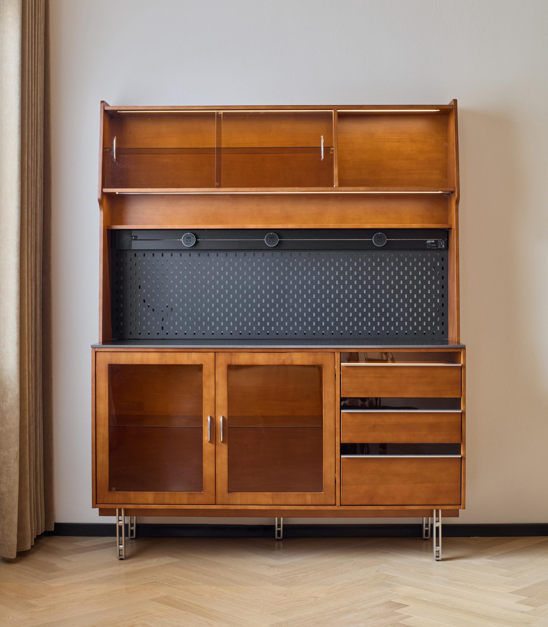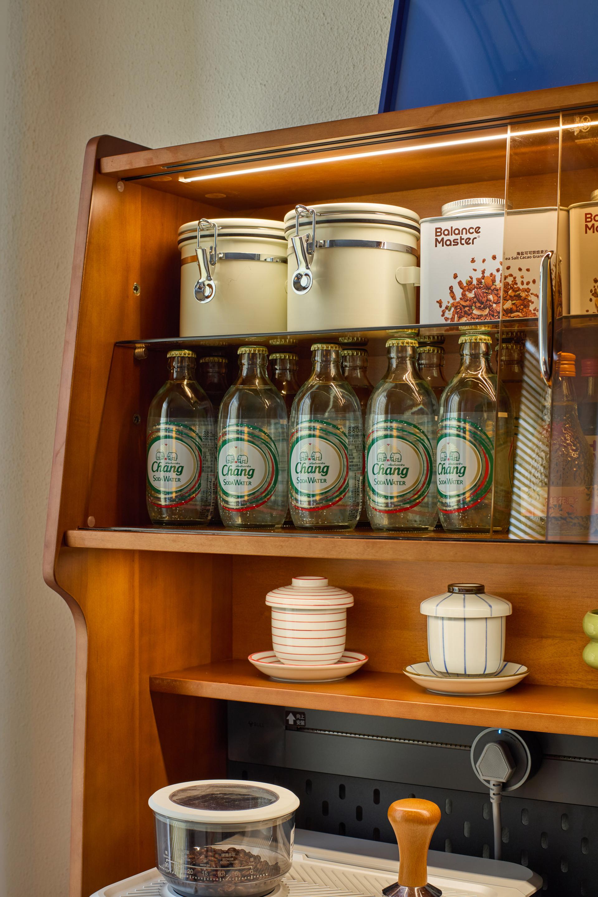 It breaks away from the traditional single storage mode of dining room cabinets, adopting a functional zoning design. The upper layer features an open design, suitable for displaying bottles, wine glasses, and other items; the middle layer can accommodate coffee machines, condiment jars, etc., and can also serve as an operation area for light catering without requiring additional planning. A pegboard can be used to hang tools or decorations. The lower layer consists of enclosed cabinets and drawers, providing storage space, creating an orderly composition of "display-operation-storage." This design meets contemporary people's needs to achieve storage, display, and light catering operations within limited space, aiming to create a "multifunctional and cozy living space" for family users, achieving the unity of "practicality" and "aesthetics."