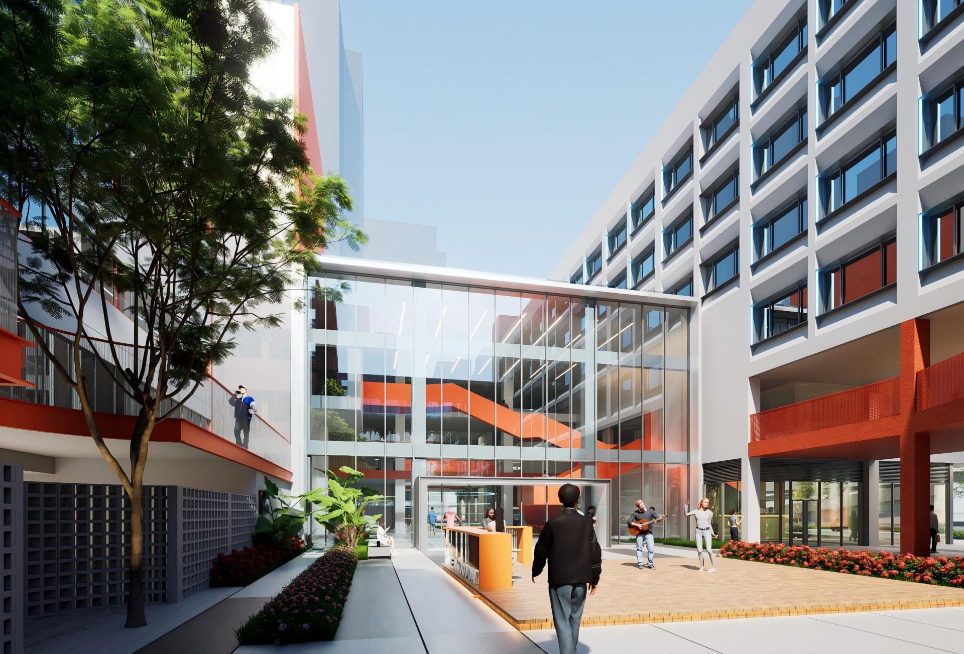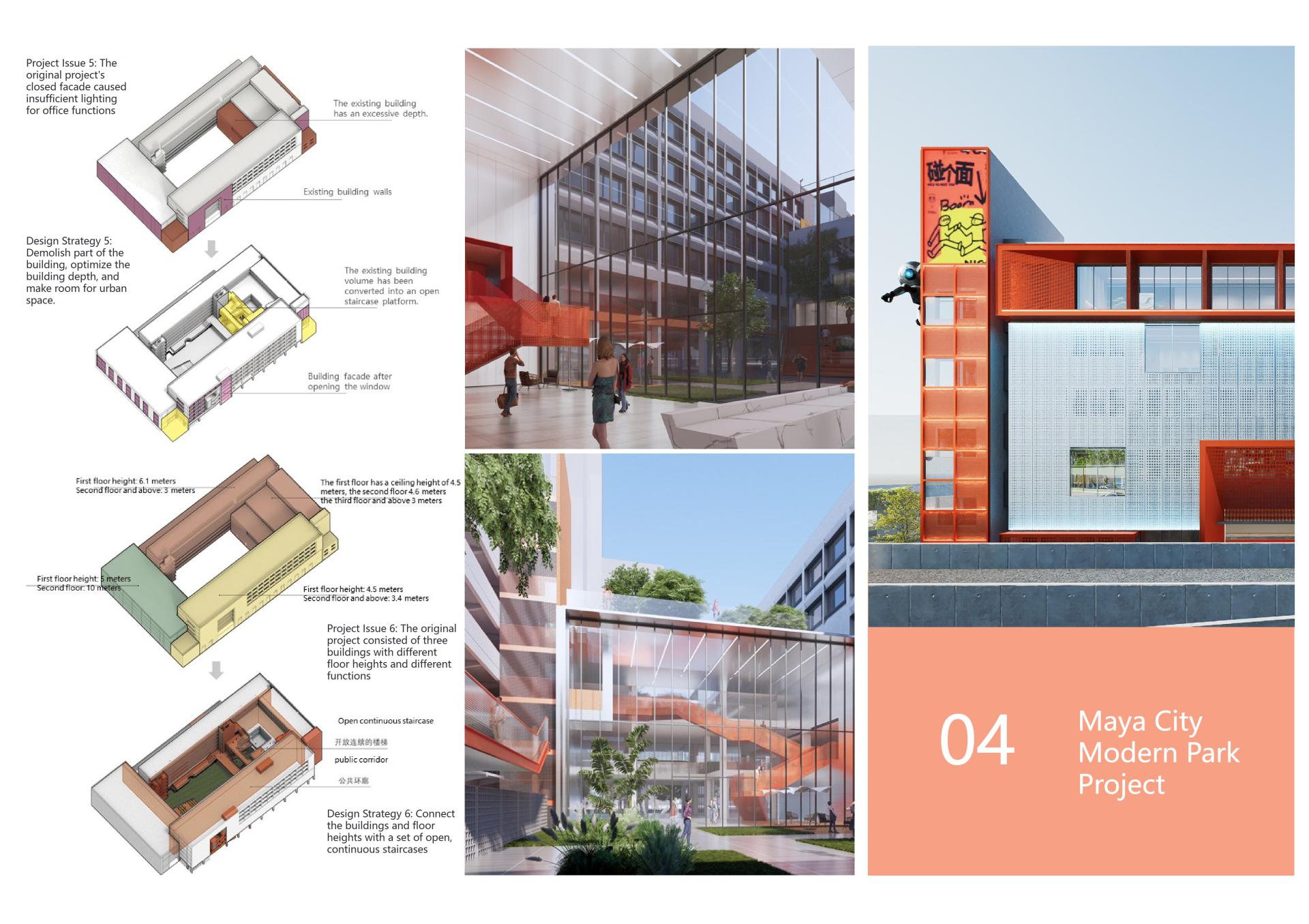 In terms of facade renovation, the principle is to emphasize the building entrance, key spatial nodes, and street corner imagery, while keeping other areas minimally modified. While retaining the original structural system, the facade design uses squares as the basic compositional elements. The goal is to create a facade image that seamlessly blends the warm, open expression of commercial spaces with the rational interface of office spaces.
