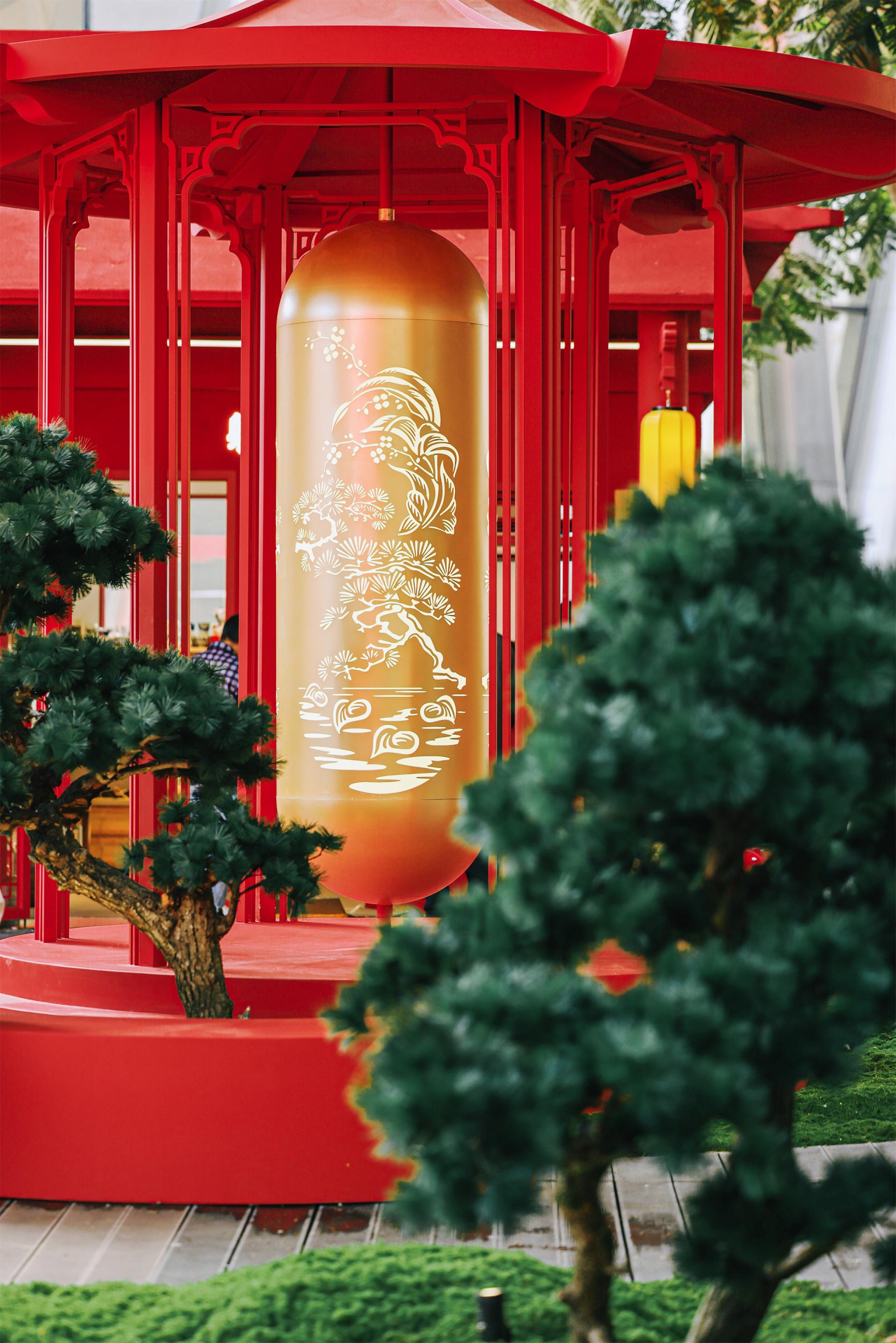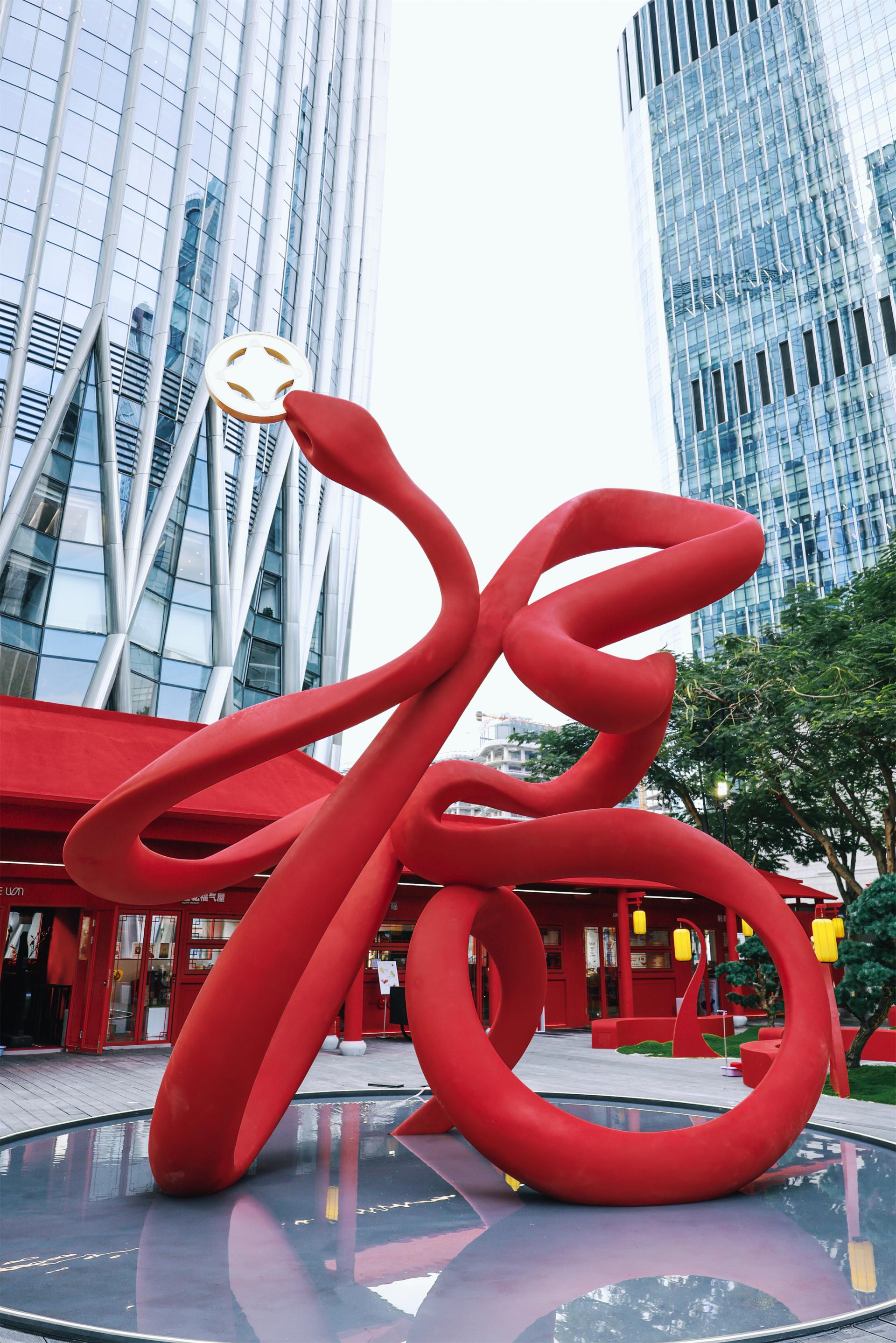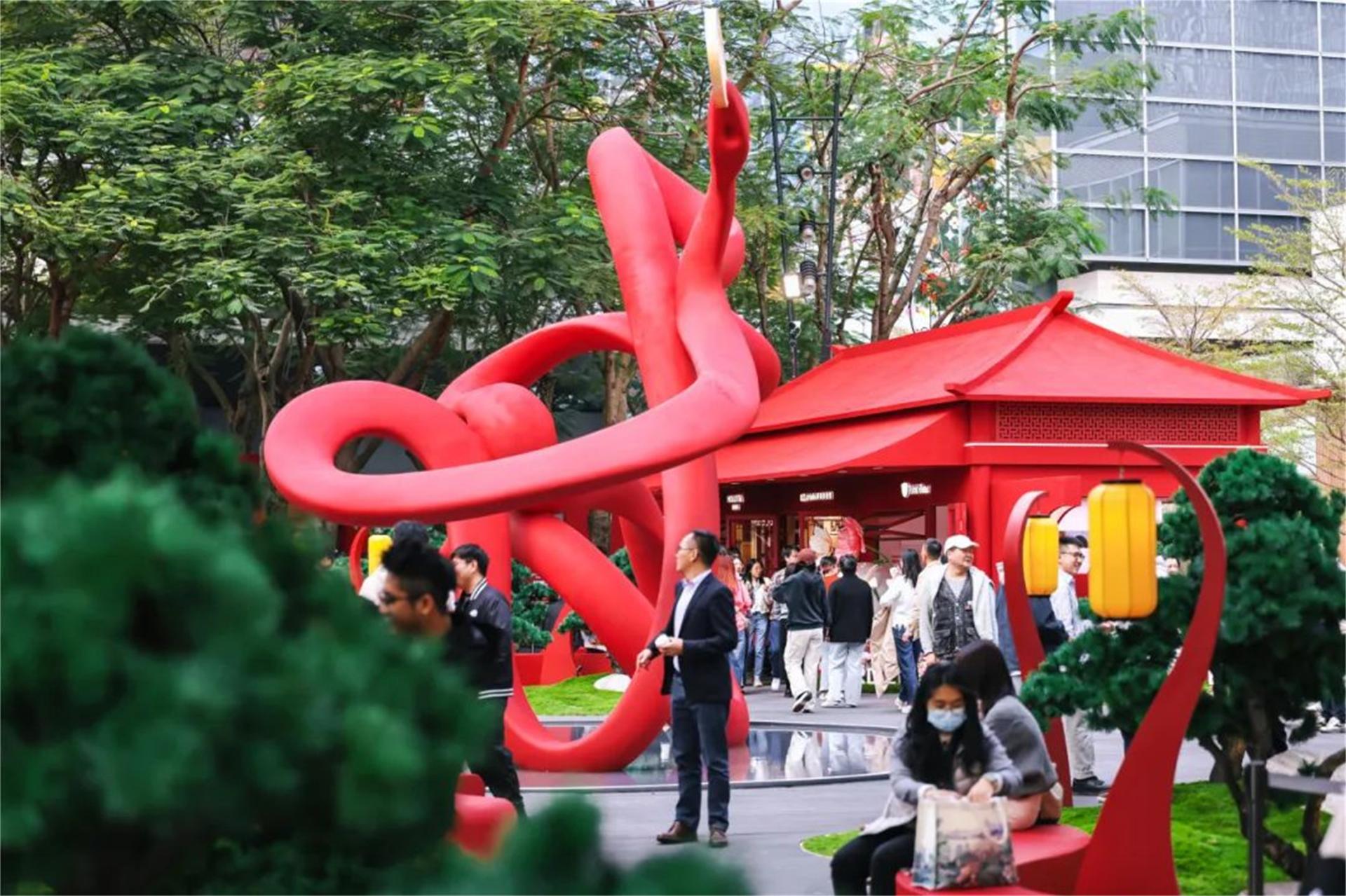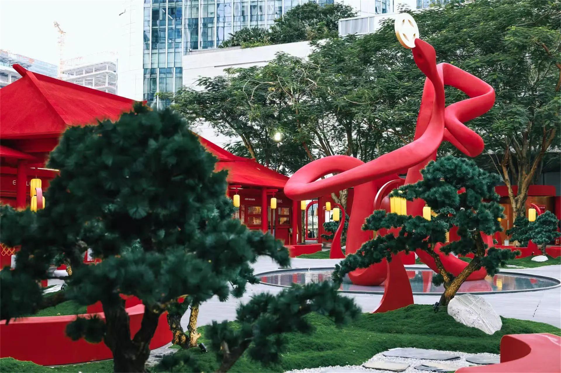 Inspired by the traditional Chinese zodiac sign "Snake" and combined with its image depicted in the Classic of Mountains and Seas (Shan Hai Jing), the courtyard incorporates a character 福(blessing)-shaped main art installation in the form of a snake swallowing coins, reinventing traditional cultural elements. Surrounding the courtyard are elegant traditional pavilions, terraces, and towers, while the central garden area recreates an Eastern ambiance through winding paths and layered landscapes. The overall courtyard features an interplay of red and gold, unfolding a painting of a festive Chinese New Year scene.