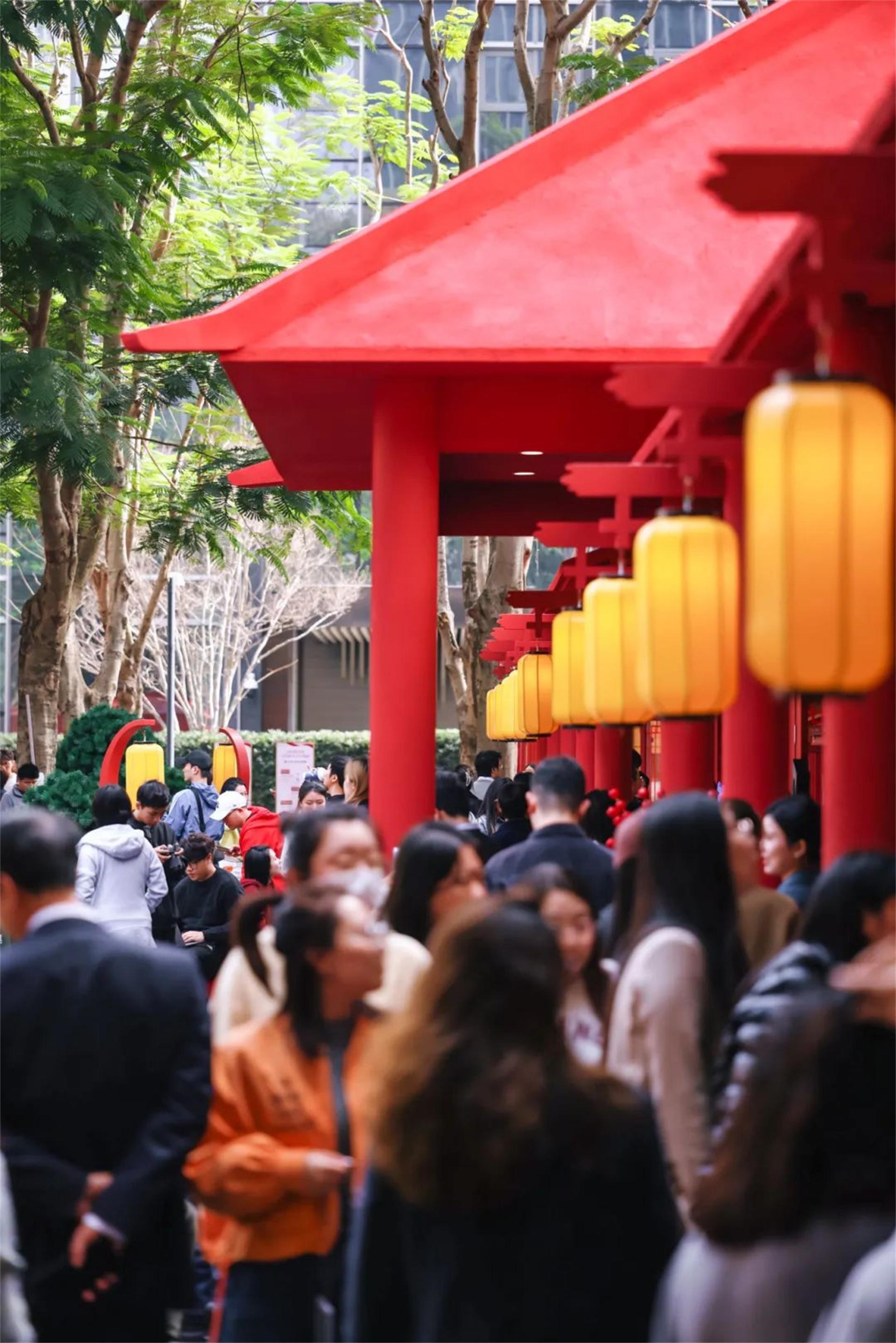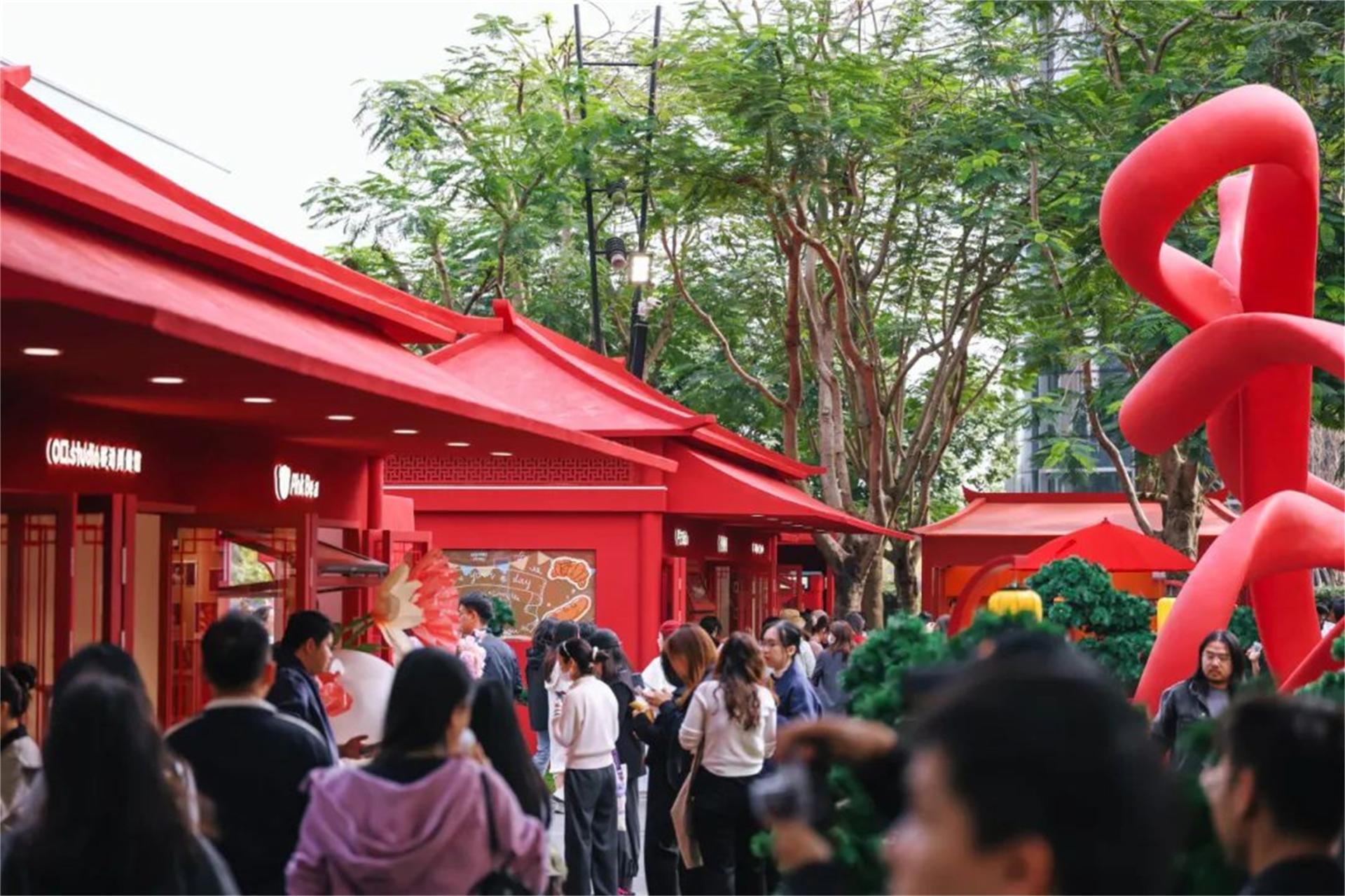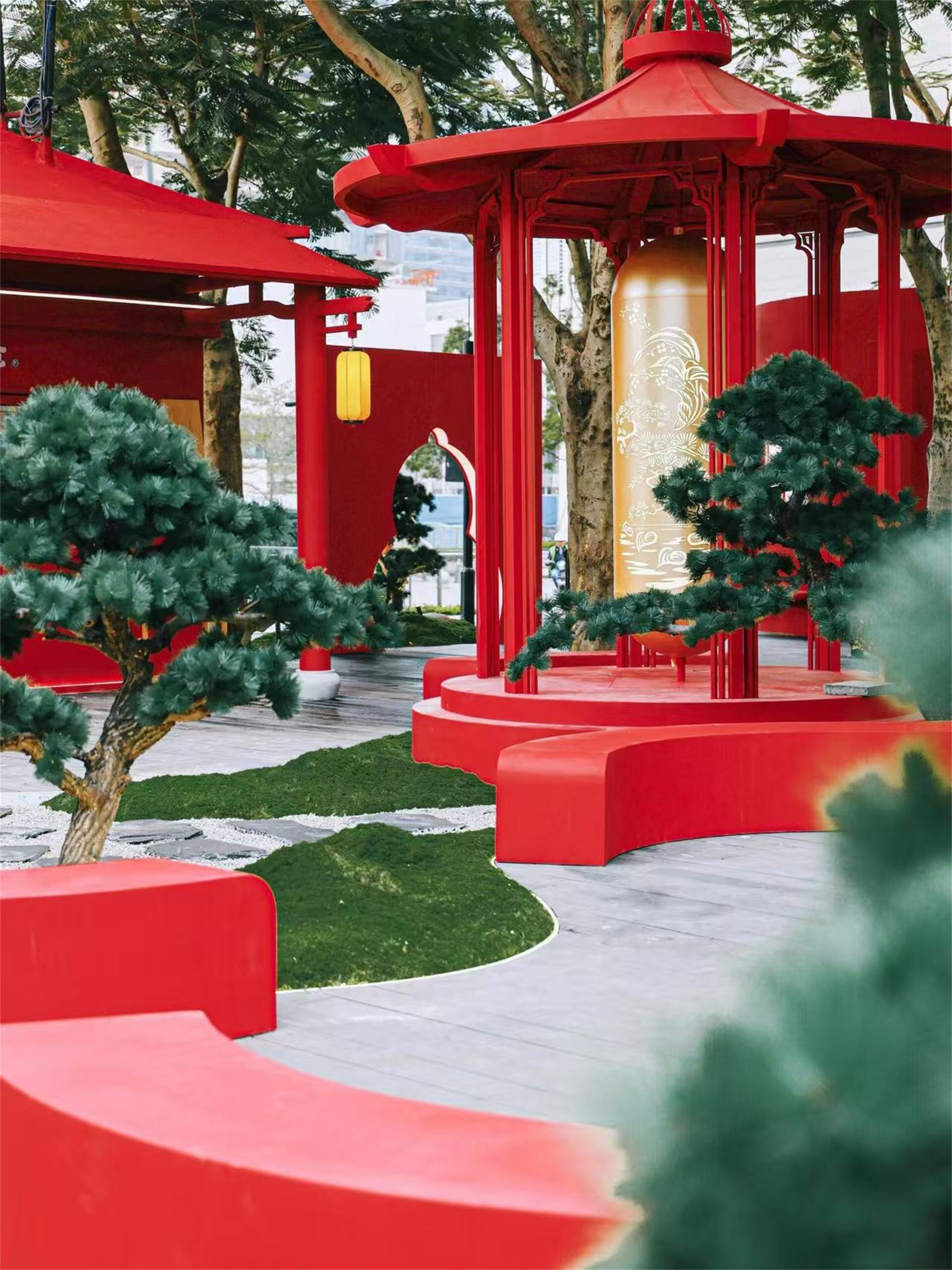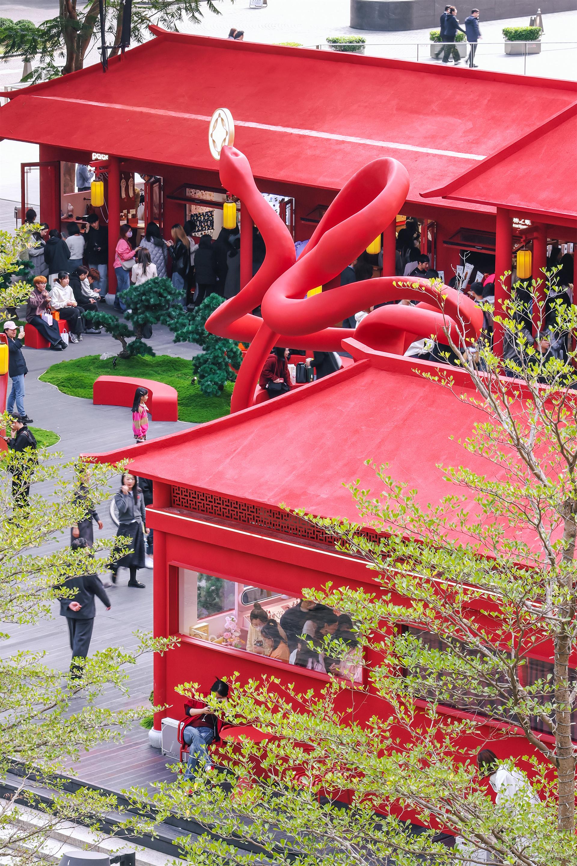 Inspired by the traditional Chinese zodiac sign "Snake" and combined with its image depicted in the Classic of Mountains and Seas (Shan Hai Jing), the courtyard incorporates a character 福(blessing)-shaped main art installation in the form of a snake swallowing coins, reinventing traditional cultural elements. Surrounding the courtyard are elegant traditional pavilions, terraces, and towers, while the central garden area recreates an Eastern ambiance through winding paths and layered landscapes. The overall courtyard features an interplay of red and gold, unfolding a painting of a festive Chinese New Year scene.
