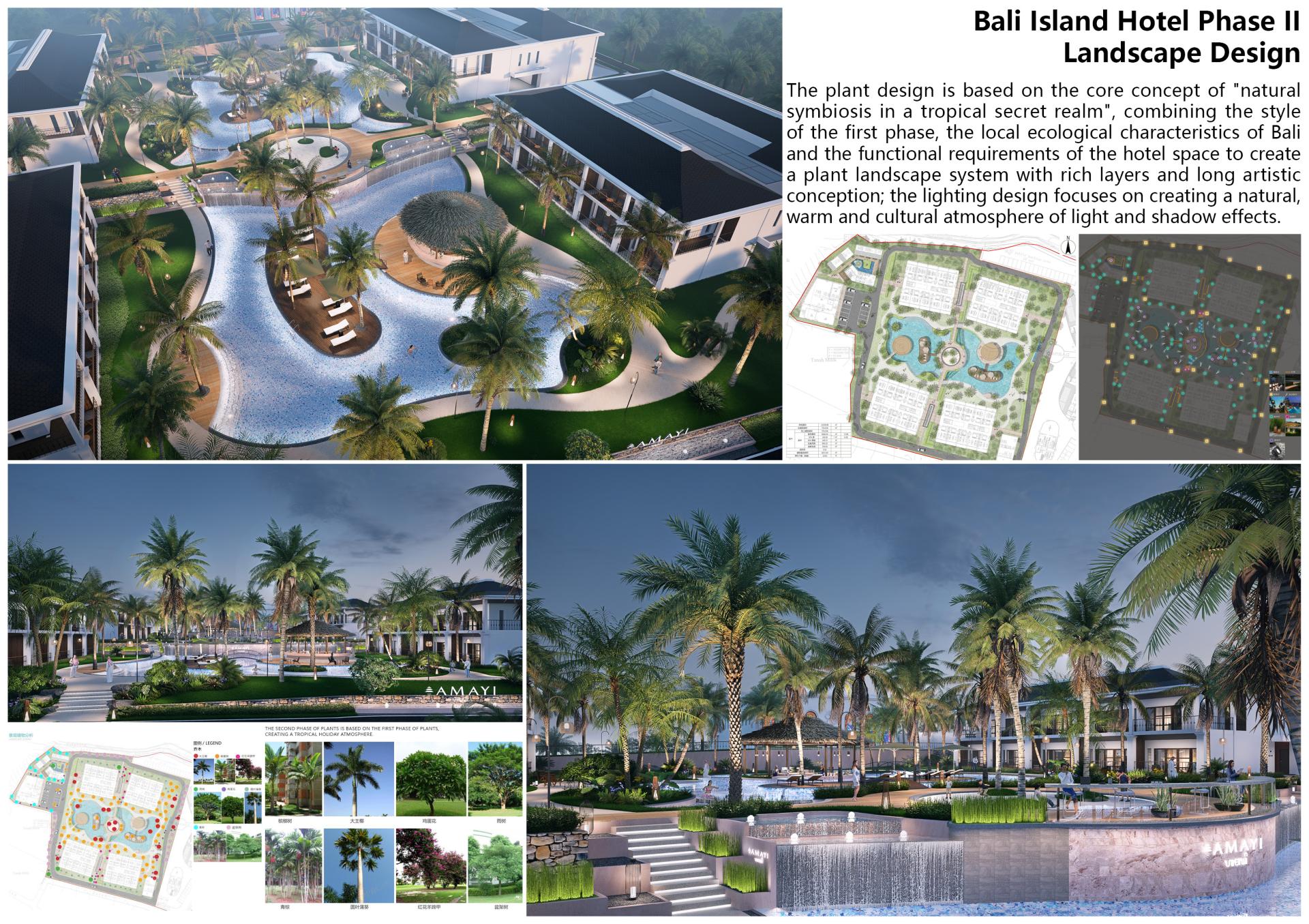 Located in Bali's Nusa Dua district, the second phase of the Bali Amany Hotel, covering a total area of 14,236.98 square meters, integrates hotel rooms, a public swimming pool, equipment rooms, and a spa. The planning layout is lively and engaging, with diverse elements and a distinctive landscape style. It shares space with the first phase and complements its functions. The landscape design fully utilizes the existing natural topography, dividing the site into three terraces. These three different elevations create a rich three-dimensional space, effectively enhancing the courtyard's spatial hierarchy and creating engaging recreational facilities, while also reducing earthwork volume and controlling costs.The plant design is based on the core concept of "natural symbiosis in a tropical secret realm", combining the style of the first phase, the local ecological characteristics of Bali and the functional requirements of the hotel space to create a plant landscape system with rich layers and long artistic conception; the lighting design focuses on creating a natural, warm and cultural atmosphere of light and shadow effects.