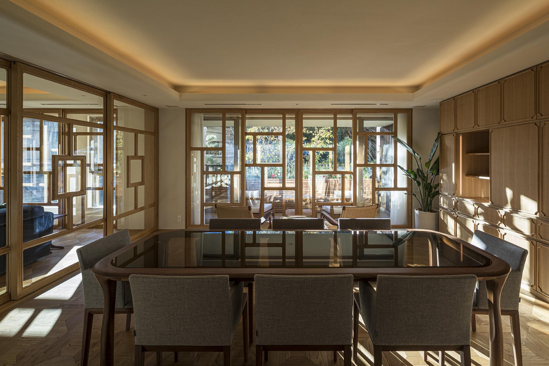 This project involved the renovation of an apartment facing Togo Shrine in Harajuku, Tokyo. Situated in the heart of the city yet blessed with a tranquil view of the shrine's greenery, the design maximizes this rare setting to create a space that feels in harmony with nature.