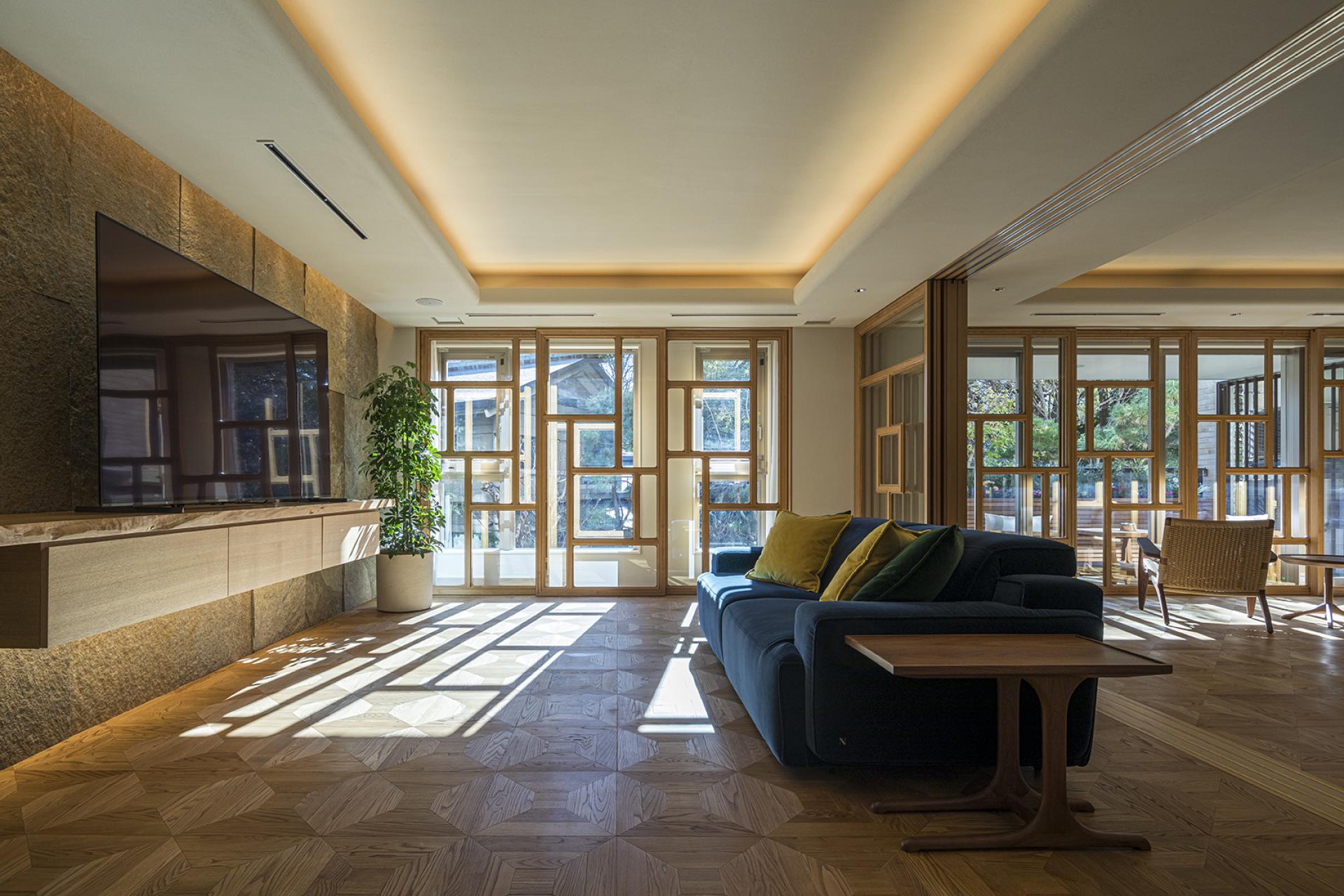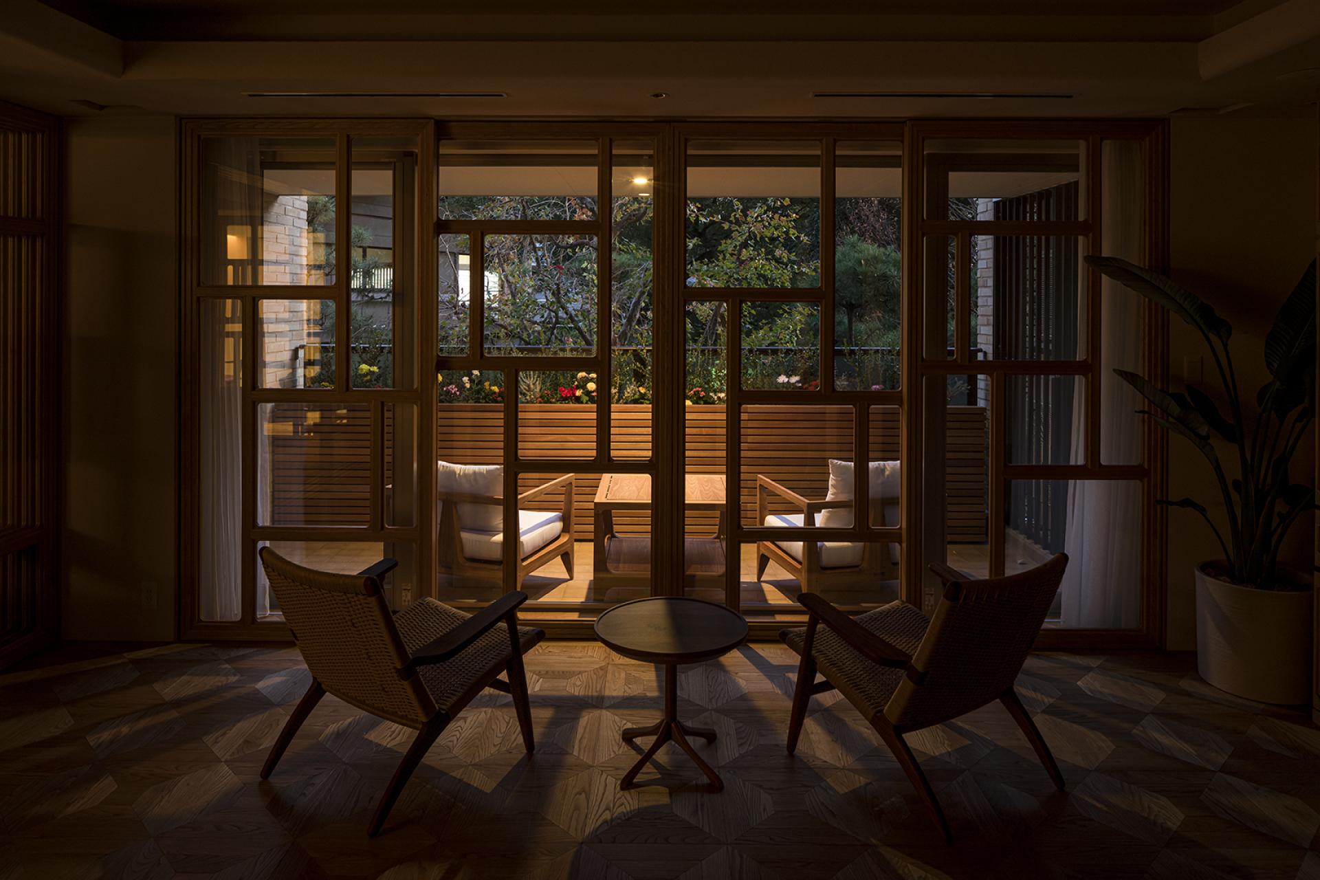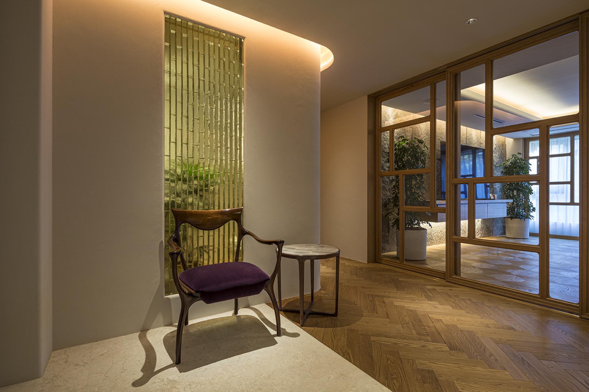 Natural materials such as domestically sourced solid wood, plaster, cast glass, and granite were used throughout the space. The forms, tones, and textures of these materials were preserved as much as possible to bring out their inherent simplicity. Meanwhile, the built-in furniture and fixtures made from these materials were designed with references to traditional Japanese latticework and patterns. Touchpoints within the space were detailed with gentle, decorative curves, and vivid colors were selectively used in furniture upholstery to express a contemporary East-meets-West approach.