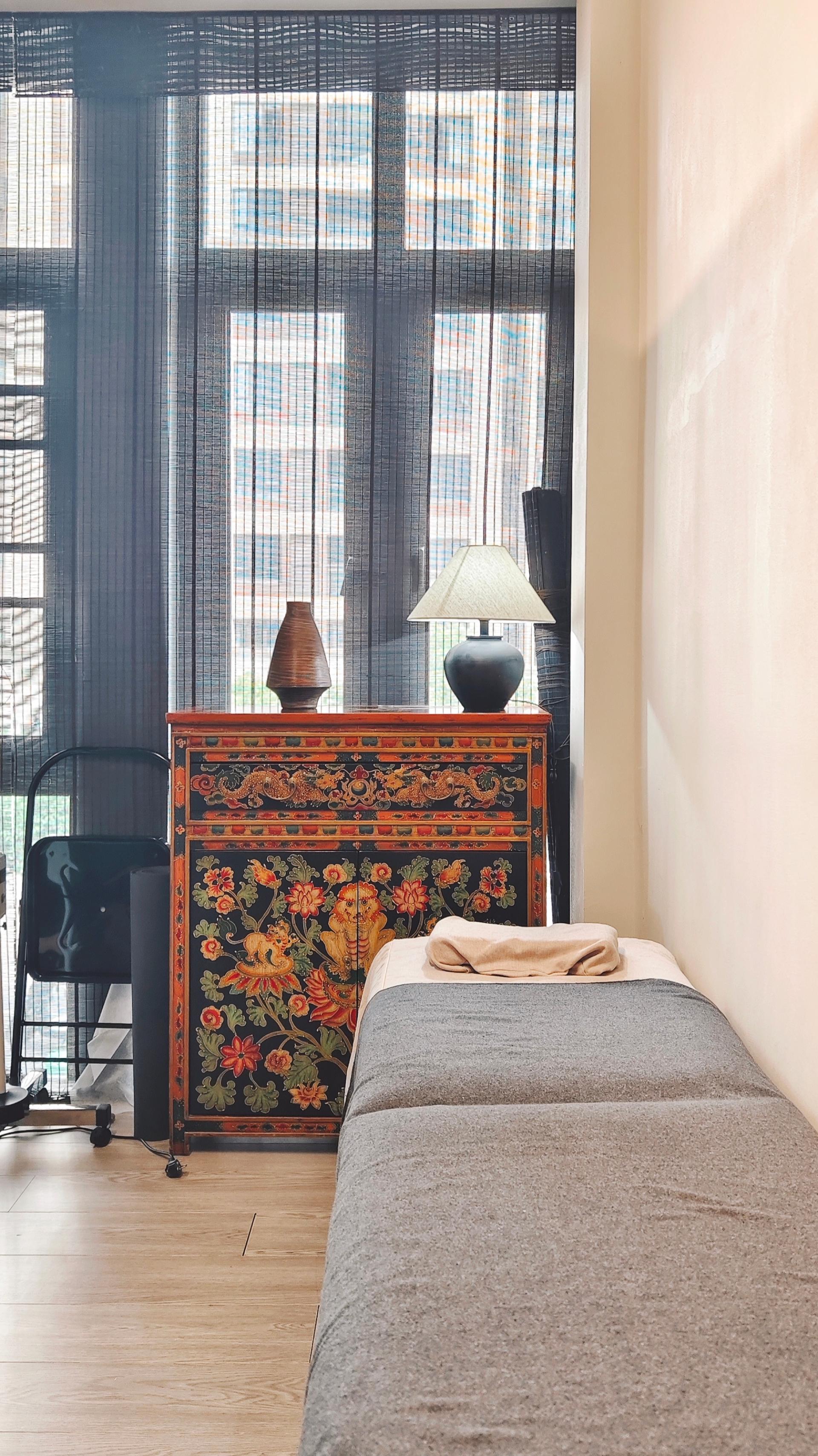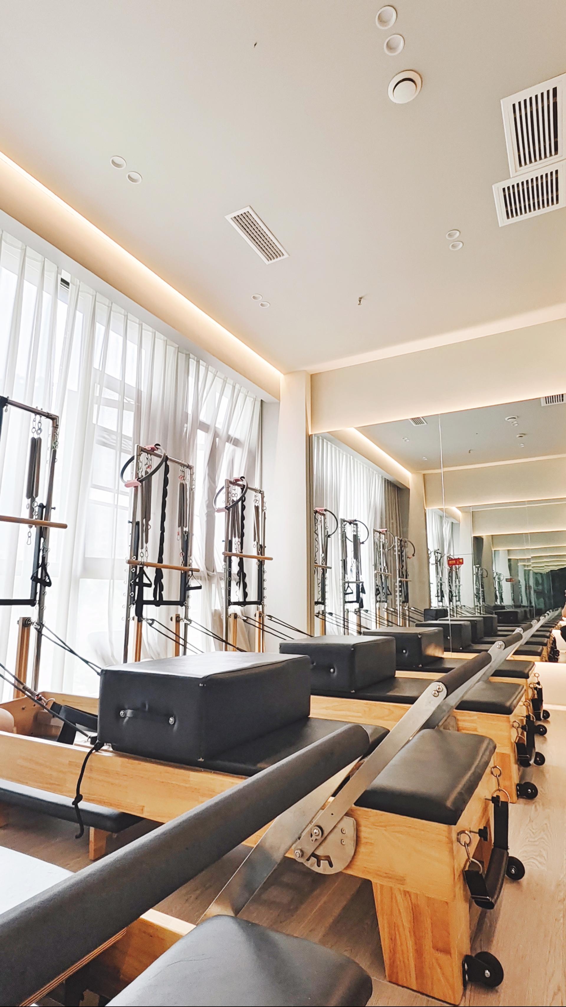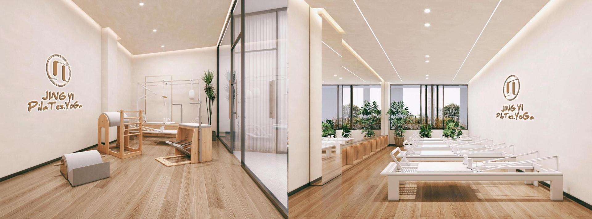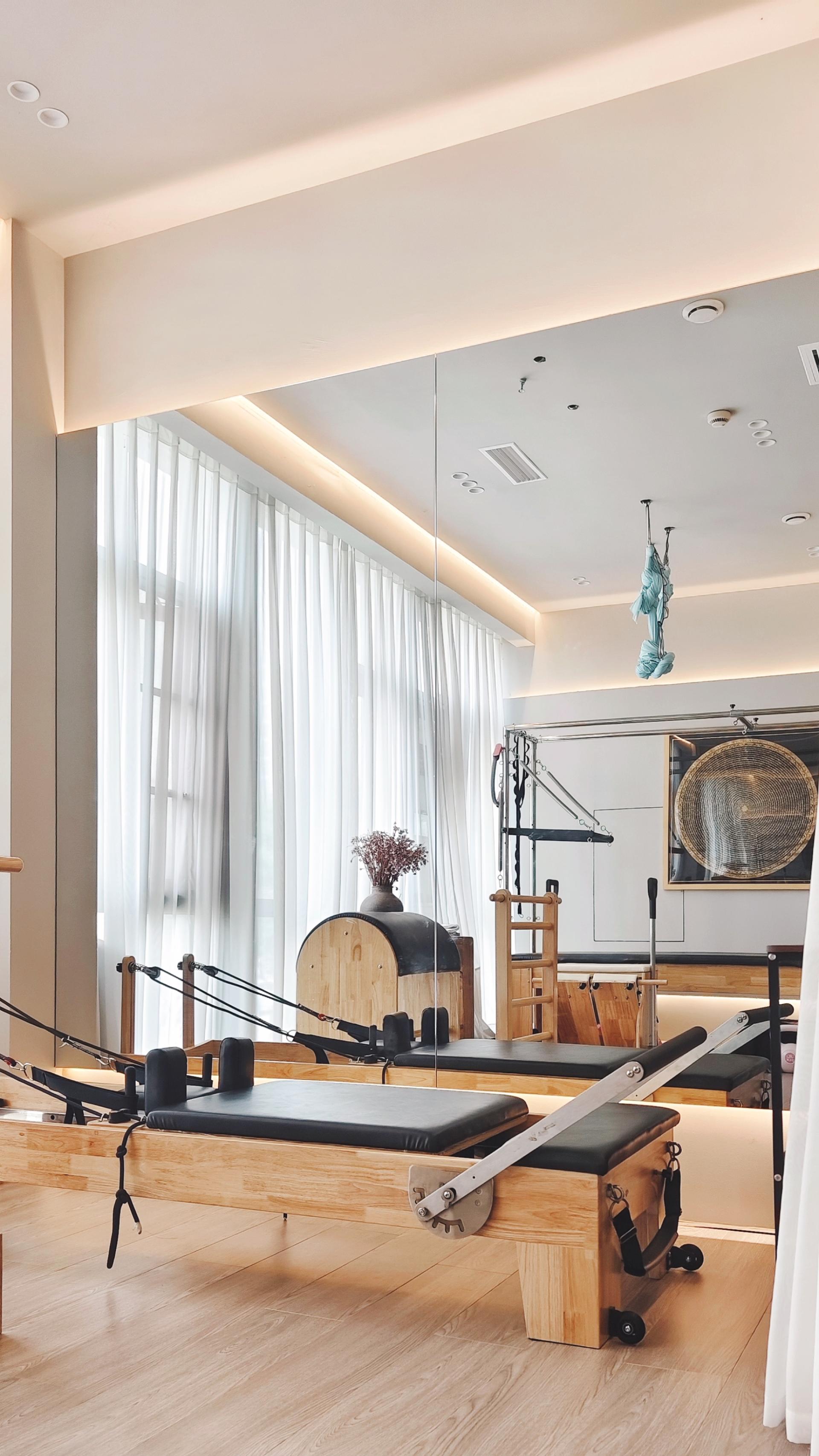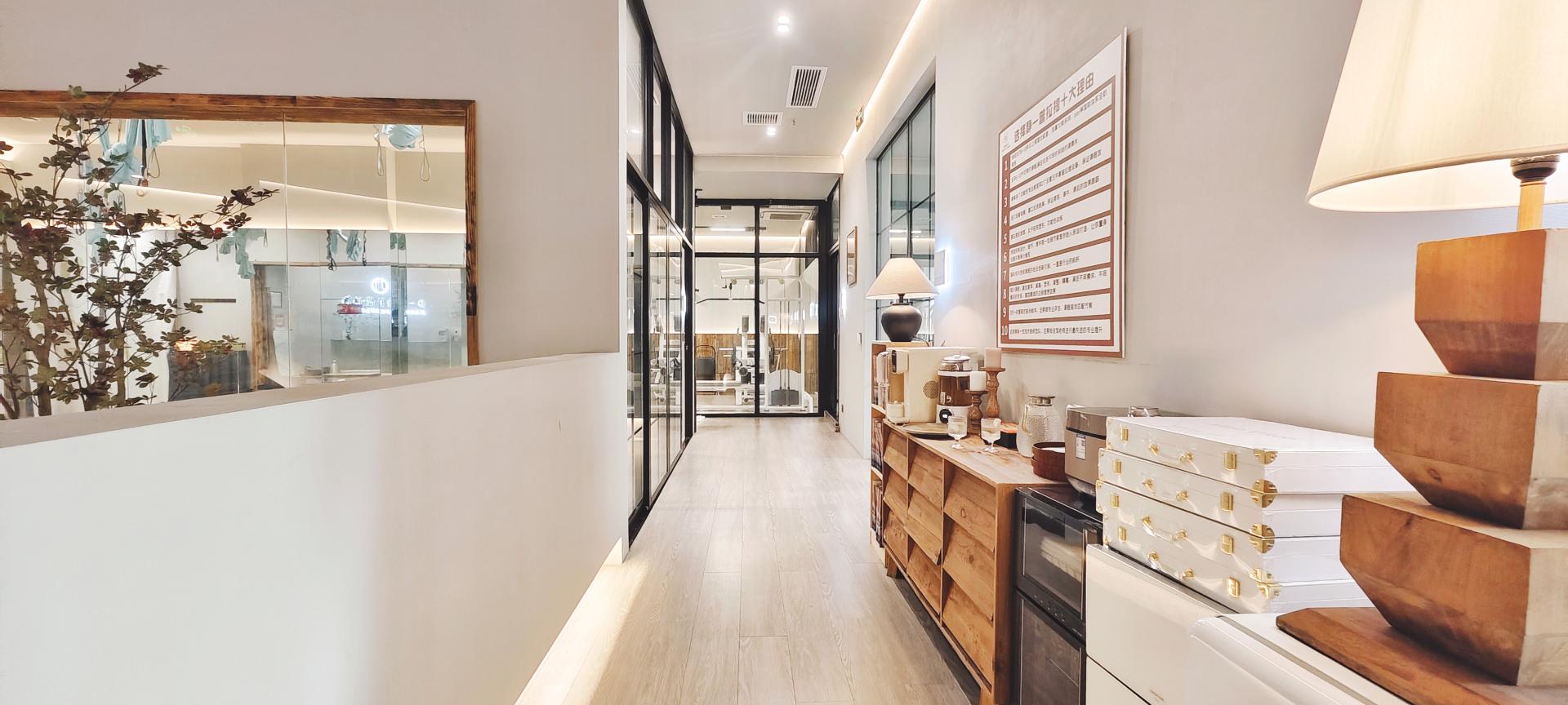 Wabi-Sabi weaves through every detail. Pilates bed frames are carved from century-old elm, with insect-bored holes filled in translucent resin that glimmers like stars under pressure. Tree trunks angled into walls host air plants in their natural cracks, serving as living backdrops for movement. Solid wood lockers retain the raw marks of axe cuts, their doors embedding pottery lamps that resemble tree hollows, releasing subtle wooden scents when opened.