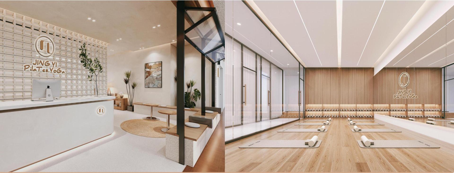 This space is a quiet dialogue between architecture and nature, where transparency and openness define the experience. A 3.3-meter frameless glass sliding door dissolves the boundary between inside and out, using light and shadow to shape the 12-meter vertical volume. Curved micro-cement surfaces—on walls, floors, and ceilings—soften architectural edges, allowing the equipment area and meditation zone to flow into one another. As members stretch, their gaze extends through the glass to the courtyard’s plane trees, reconnecting them with a sense of primal freedom.