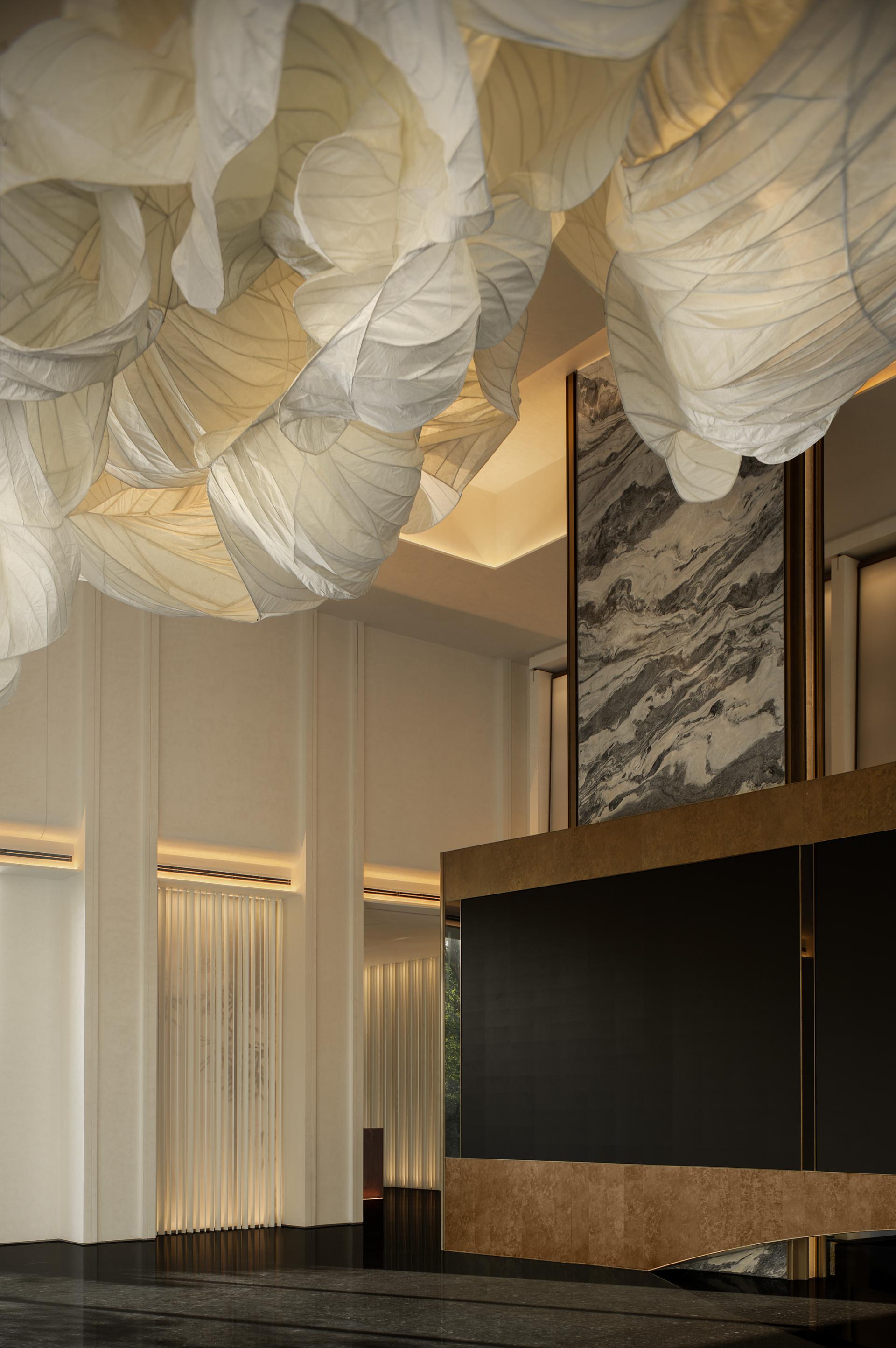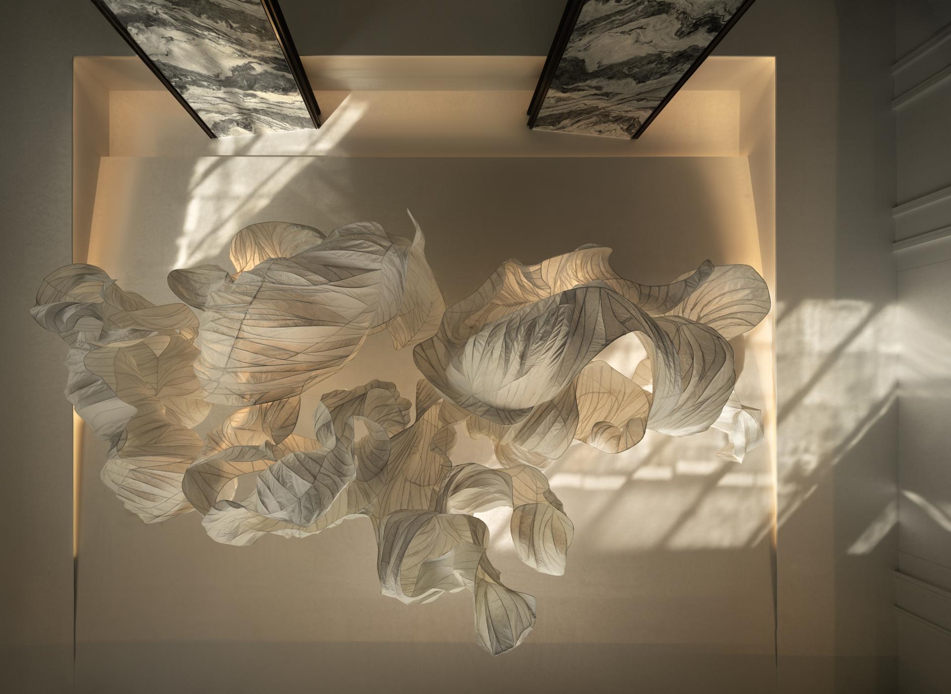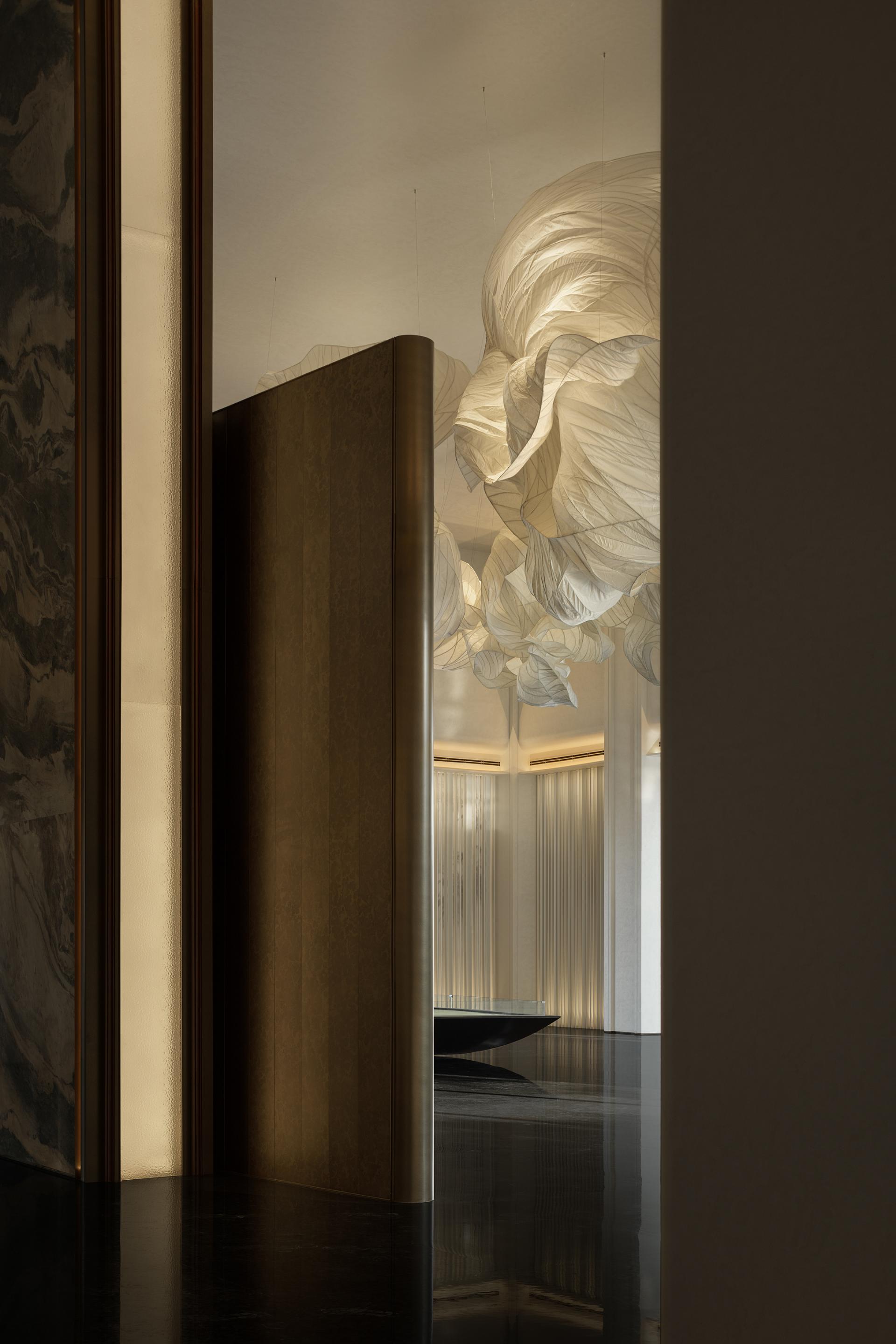 Crafting Ambience, Infusing Eastern Charm: From the entrance, where a curved, screen-like metallic installation slowly unfurls to welcome visitors, to the central atrium's suspended artful light sculpture—ethereal as clouds or delicate gauze—every element is imbued with the freehand spirit (xieyi) and intentional emptiness (liubai) characteristic of Eastern aesthetics. These are not merely functional elements but visual anchors and emotional touchstones, guiding visitors into a contemplative journey of beauty and life.