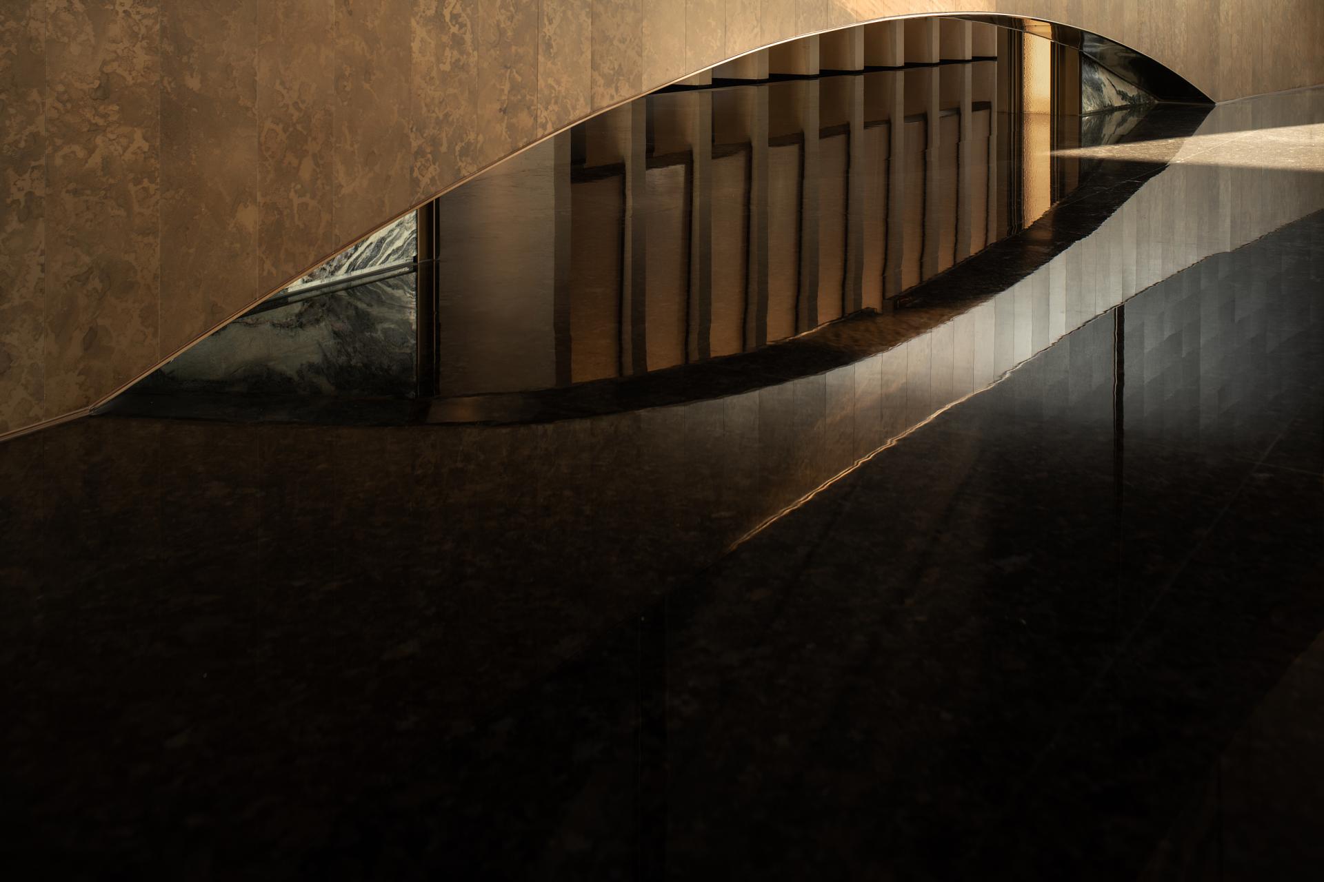 A Dialogue of Materials, A Warmth of Texture: The space predominantly features materials with natural textures, such as warm wood finishes, a grounded dark flooring, and marble reminiscent of ink wash paintings. These materials, under the interplay of light, reveal rich layers and a sense of warmth, cultivating an atmosphere of serene elegance and understated refinement. The soft contours of curved sofas and bespoke furniture further enhance the space's approachability and comfort.
