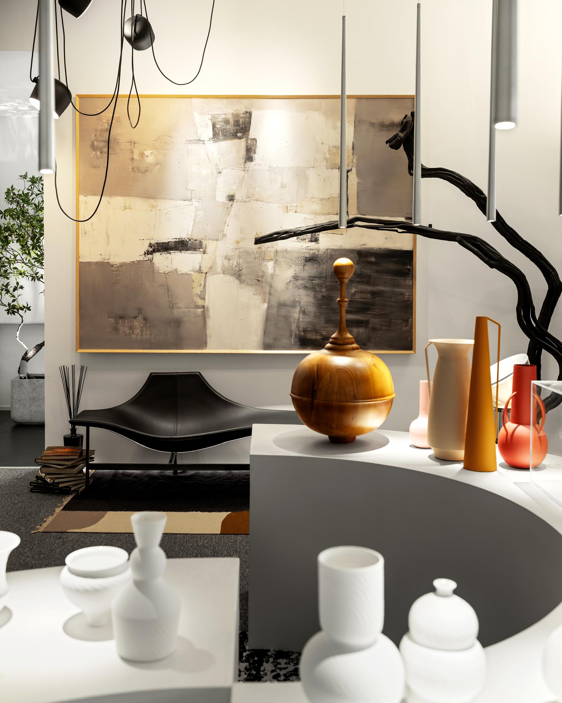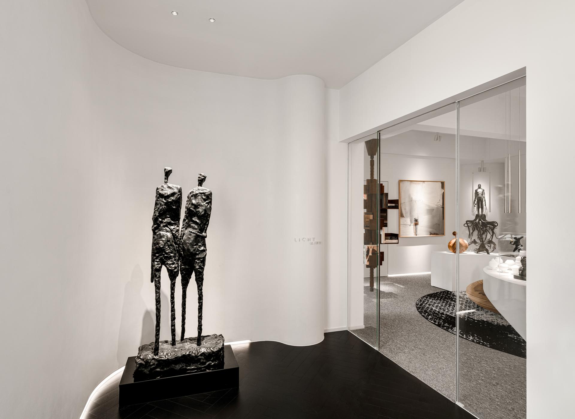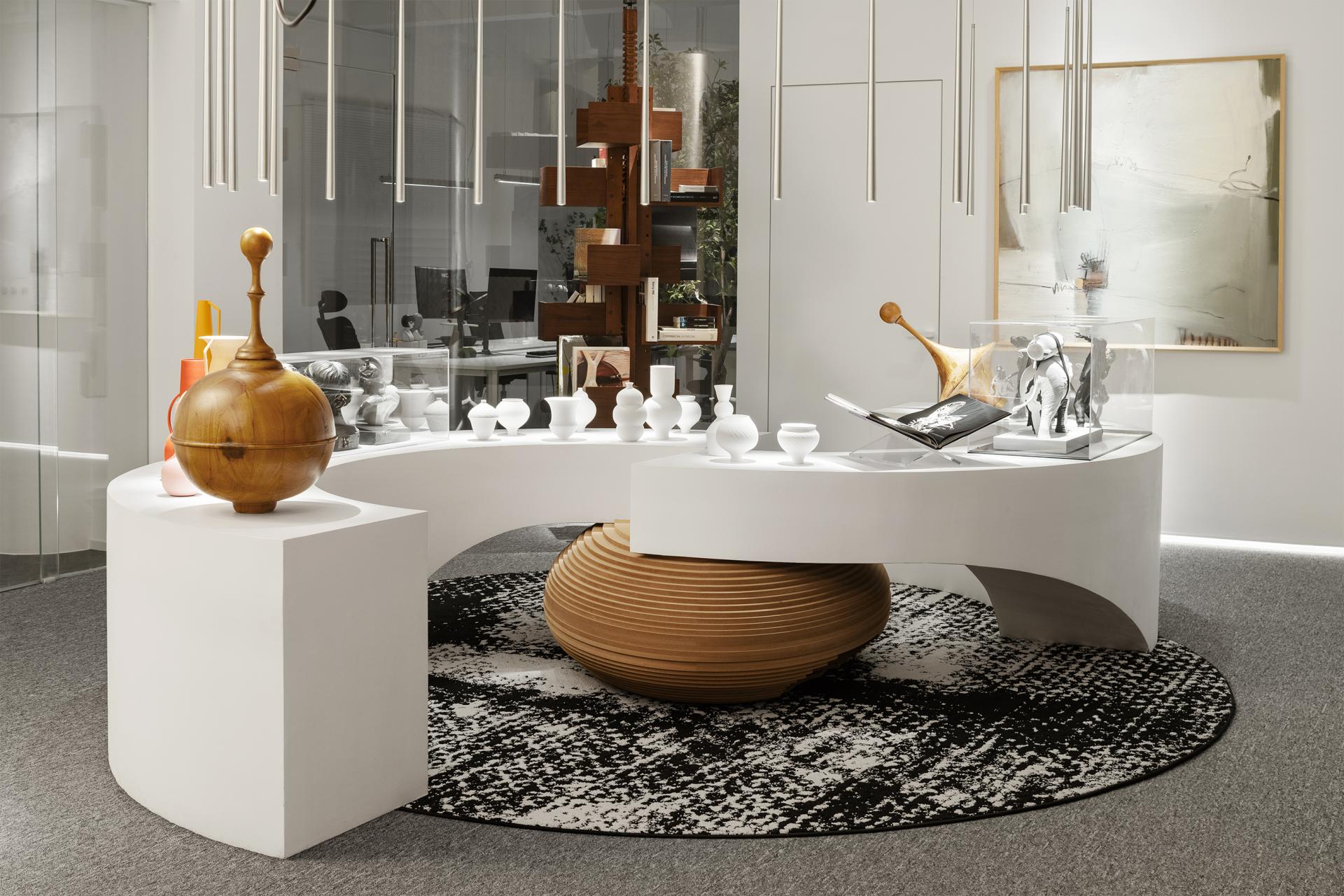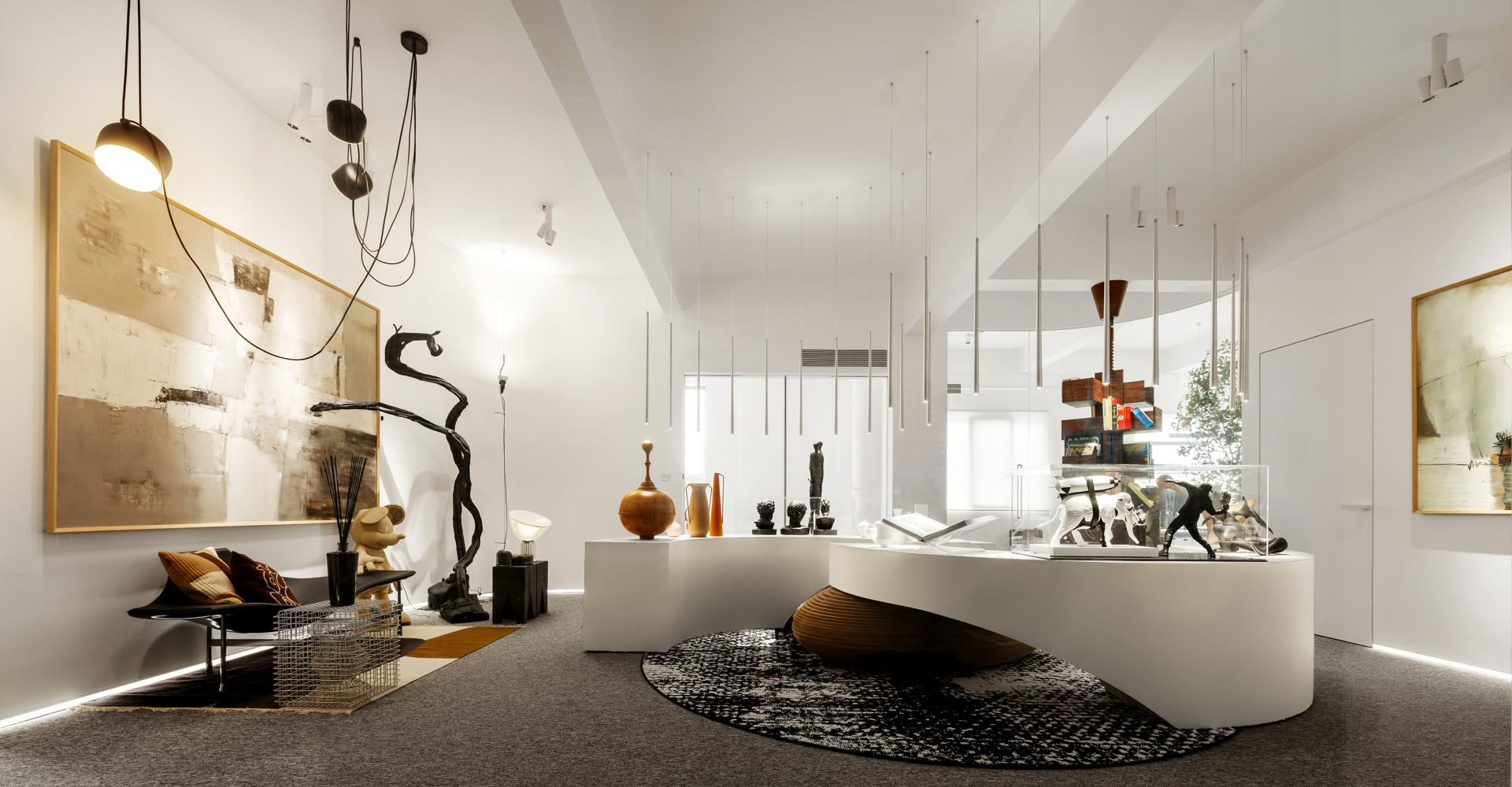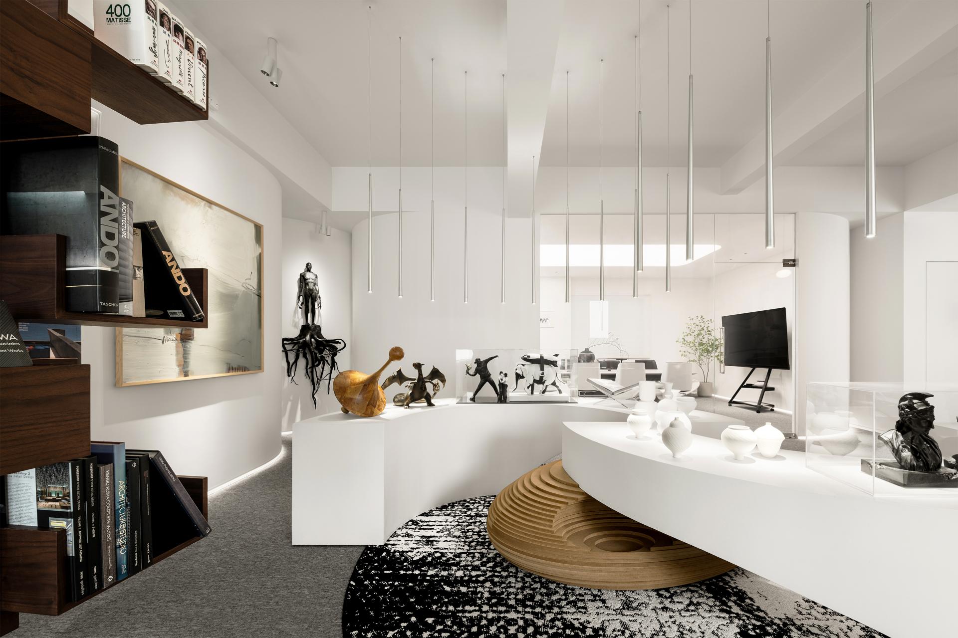 The design is characterized by clean lines and a minimalist palette dominated by white. Curvilinear elements, such as the gracefully curving wall and arched platforms, add a touch of fluidity and softness to the otherwise stark geometry. Suspended from the high ceiling are sleek, vertical lighting fixtures. They not only illuminate the area with precision but also contribute to the overall modern aesthetic, creating a sense of height and openness. These platforms not only provide a visually appealing way to showcase our art pieces but also guide the flow of movement through the space.
