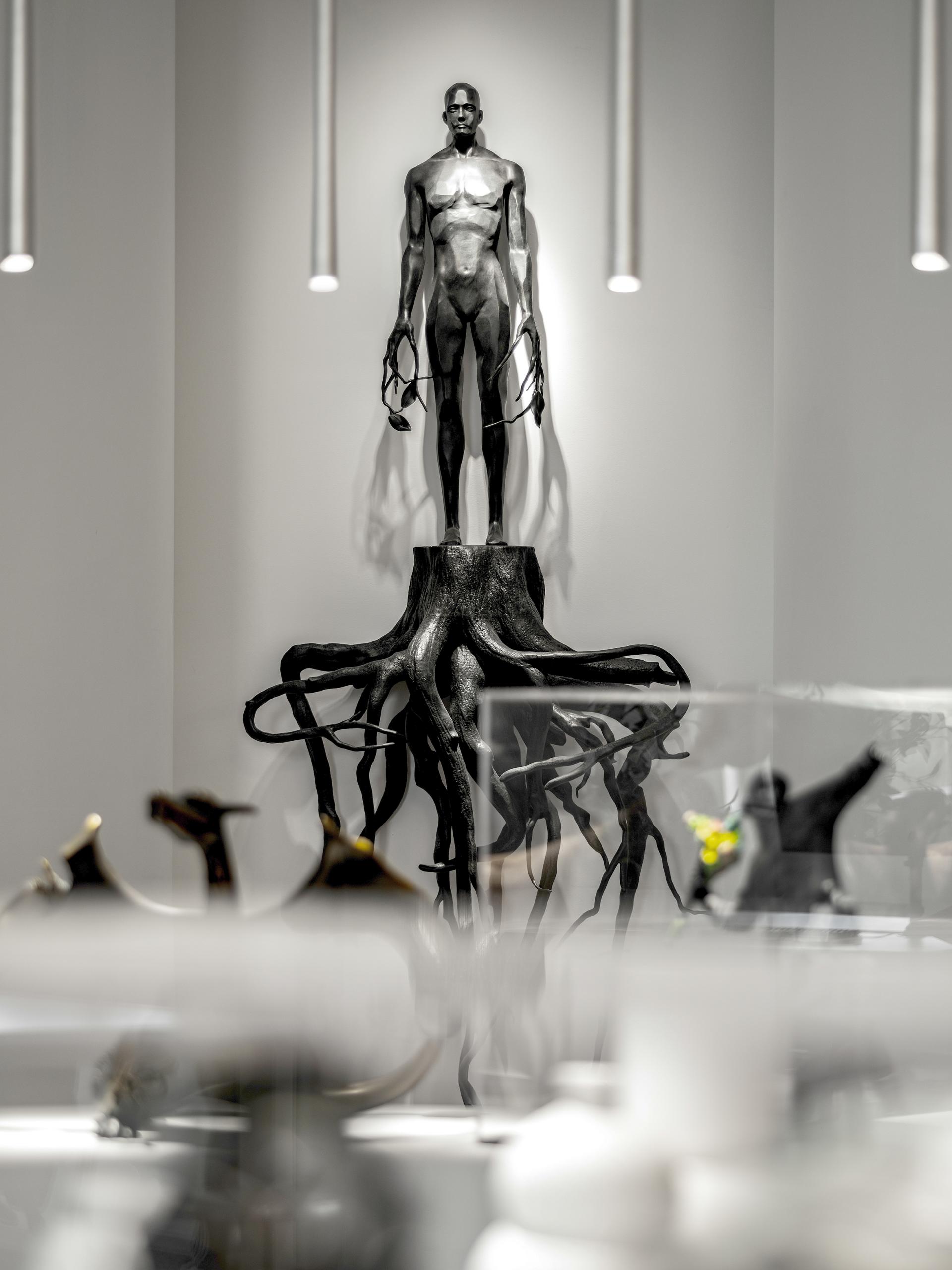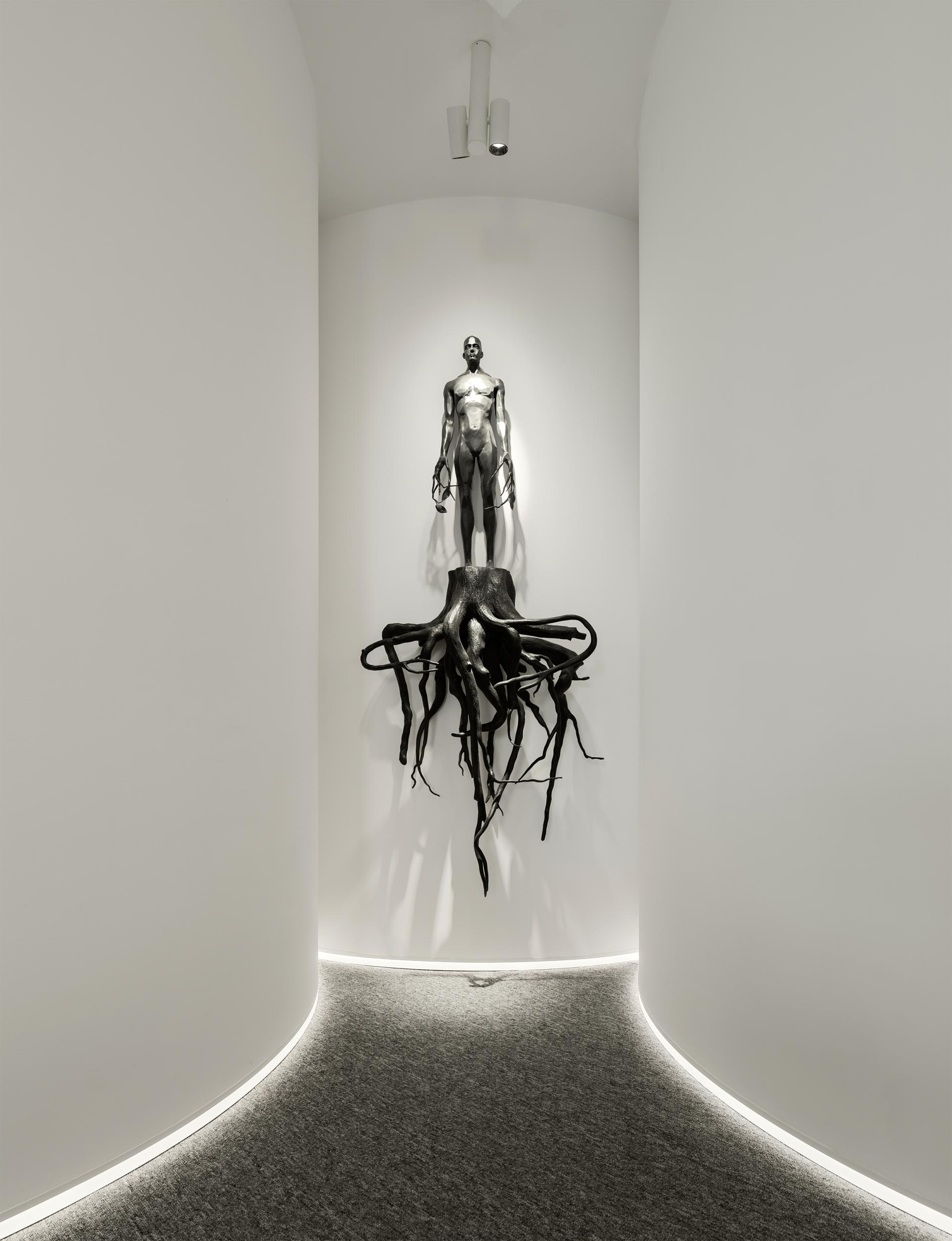 At the heart of this space stands a striking black sculpture, its textured forms and elongated silhouettes creating a powerful visual impact. The minimalist white surroundings serve to highlight the sculpture, making it the focal point of the space. Strategic lighting, both from the ceiling and the soft glow along the base, casts subtle shadows that enhance the sculpture's 3D quality and add depth to its intricate details.