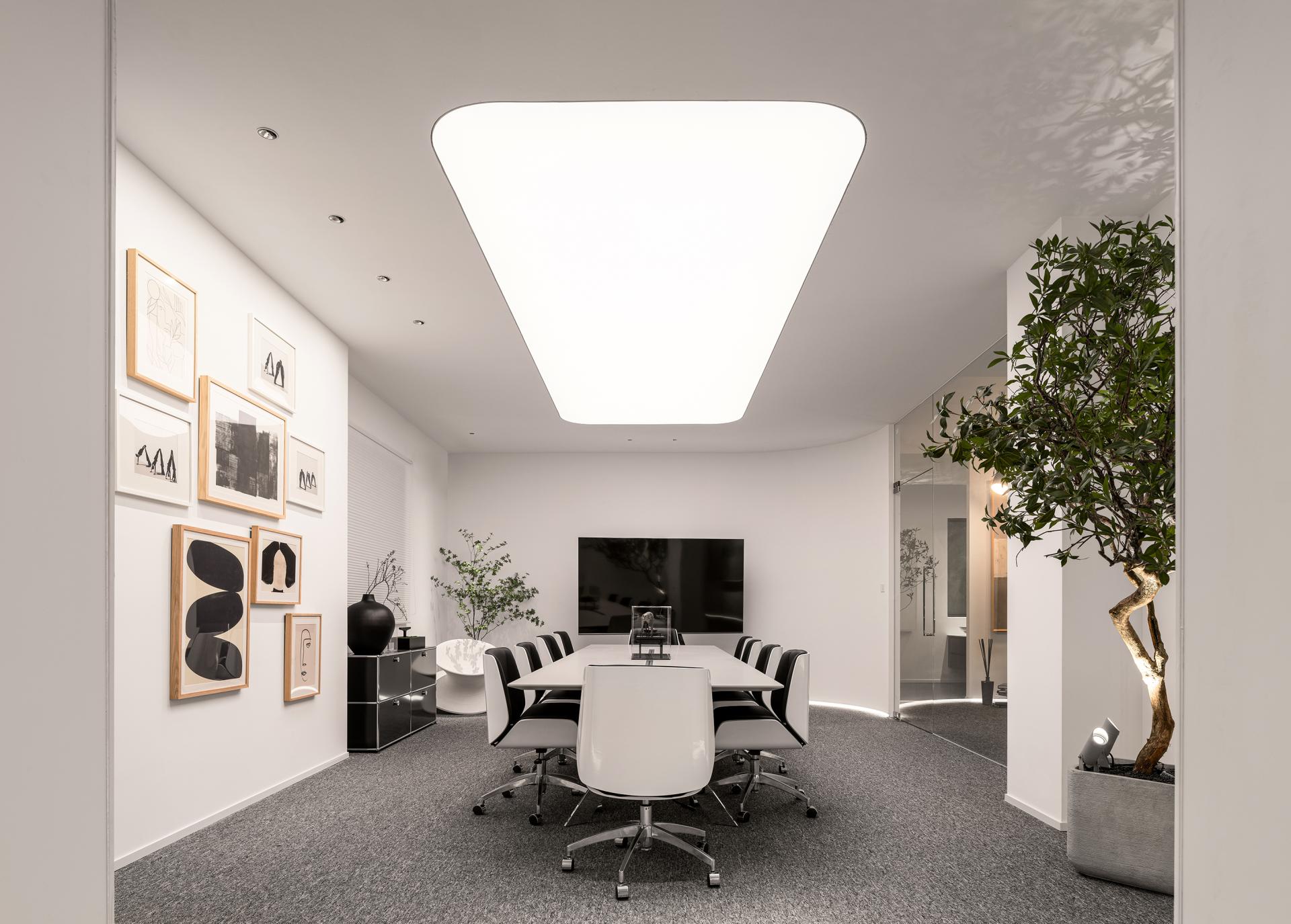 The meeting room is an example of how light can transform a functional space into an aesthetically pleasing environment. Dominating the ceiling is a large, uniquely shaped stretch ceiling lightbox which can adjust color temperature to simulate nature lighting. Its soft, diffused glow bathes the entire room evenly and creating a comfortable atmosphere for discussions and collaborations. This central light source not only serves as a practical illuminator but also as a design statement, drawing the eye upwards and adding a sense of grandeur to the room.