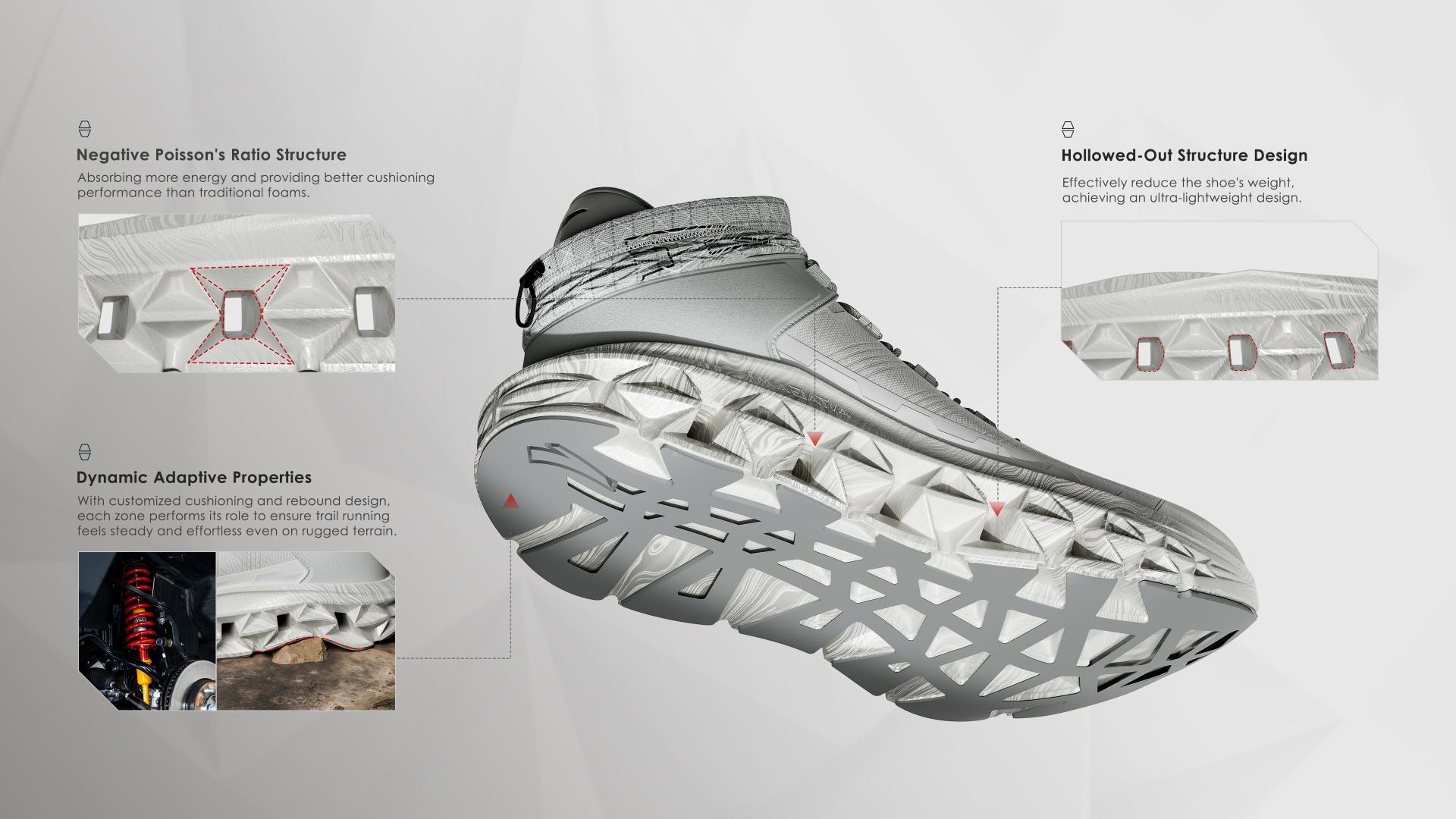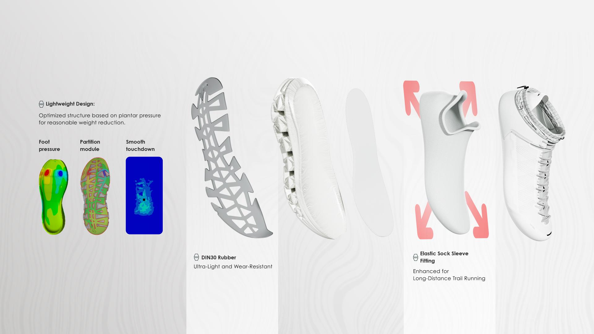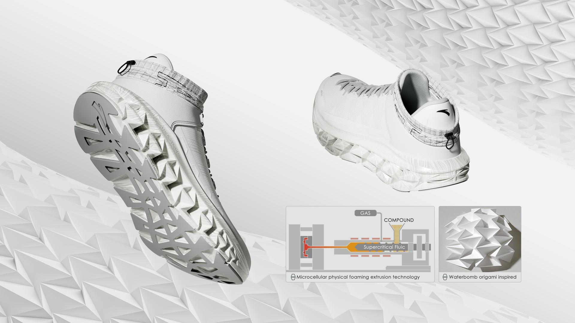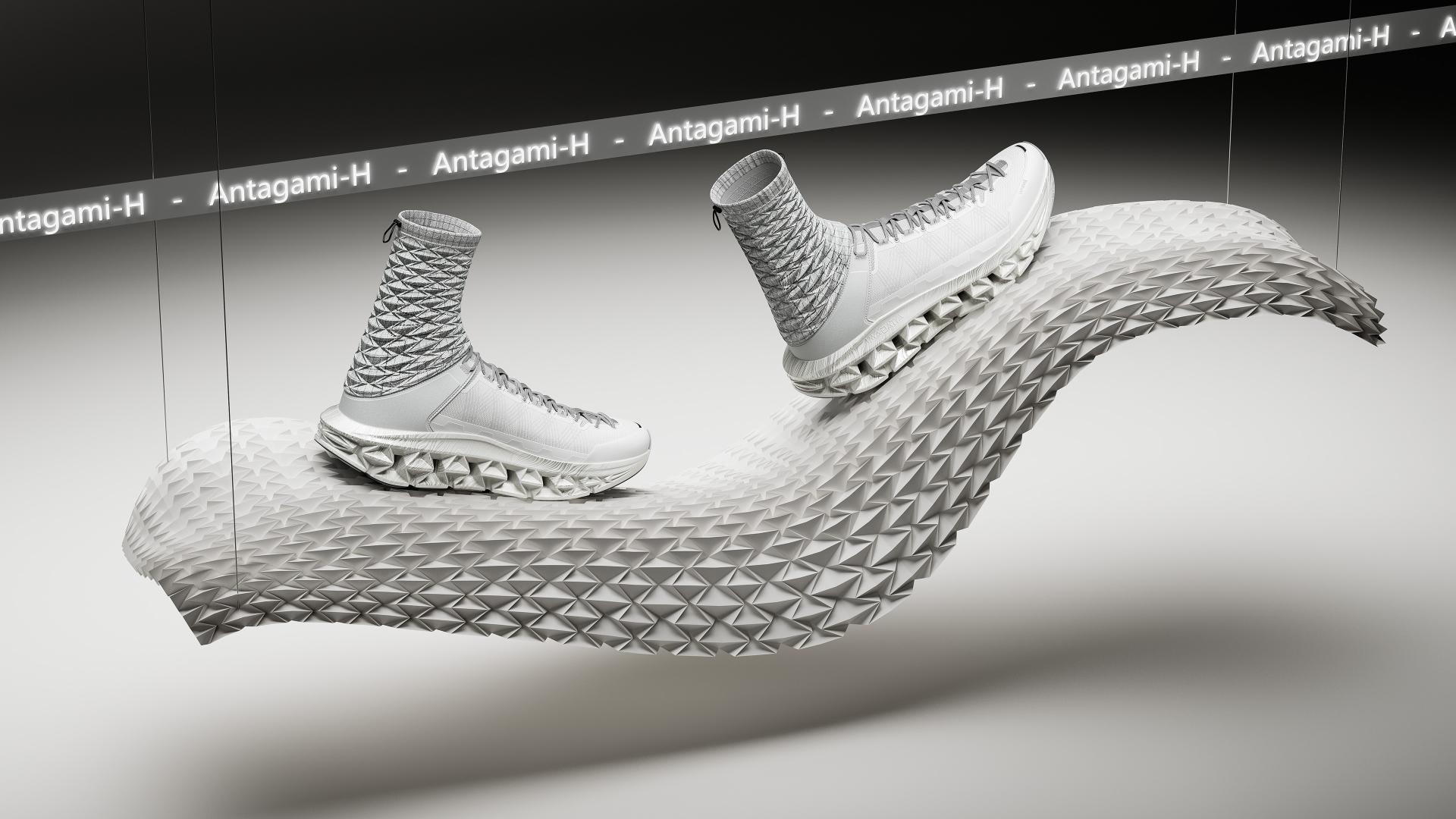 When a millennium of Eastern origami art meets modern engineering science, a creative spark ignites. We firmly believe that genuine innovation is not conjured from thin air, but deeply rooted in profound culture. Antagami-H takes this as its core by boldly fusing the intricate structures of origami with the performance demands of athletic footwear. In a landscape of homogenized competition, it carves out a new path that blends cultural heritage with technological aesthetics. The beauty of Antagami-H origami structure is naturally enshrined in the midsole design. By parametrically adjusting the origami unit, we can achieve customized cushioning and rebound performance in different areas of the sole, meeting complex athletic demands. Its dynamic adaptive properties allow the sole to maintain stability and balance through localized compression and deformation on uneven terrain, significantly enhancing athletic performance. Simultaneously, the hollowed-out structures resulting from origami effectively reduce the shoe's weight, achieving an ultra-lightweight design. Antagami-H utilizes the innovative Mucell® microcellular physical foaming extrusion process. This cutting-edge process not only endows the midsole with excellent moldability—making the sole‘s folding function more effective and the structural edges more defined—but also naturally forms natural, delicate flow patterns on its surface. These flow patterns resemble the unique fiber textures formed during the pressing of natural paper pulp, perfectly aligning with the paper-like texture inherent in the origami concept. Both the upper and sole uniformly adopt TPU material, achieving a "one shoe, one material" concept. This not only significantly enhances the entire shoe's recyclability but also simplifies end-of-life processing. Specifically, the upper primarily uses bio-based TPU (with some raw materials derived from renewable plant resources like corn and castor beans). While maintaining the excellent properties of traditional TPU (such as high elasticity and abrasion resistance), it significantly reduces carbon emissions during production. Furthermore, the upper fabric innovatively incorporates eco-friendly seaweed yarn in certain areas. Its lightweight and breathable properties endow the upper with excellent wearing comfort. The appearance of the shoe is a masterful convergence of Eastern aesthetics and modern design.