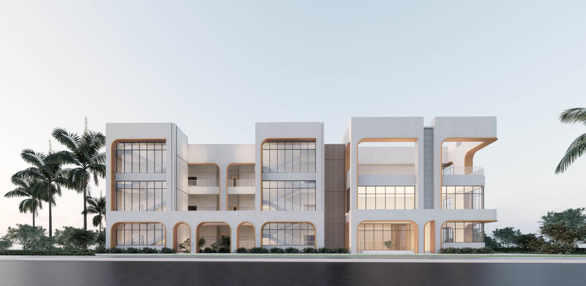 Considering the regional climate, the project adopts a customized, institutional-style facade design. Through clean and bold framing elements, a dynamic interplay of solid and void volumes, and elegant curved motifs, it crafts a distinctive, artistic, and public-building-inspired facade image.