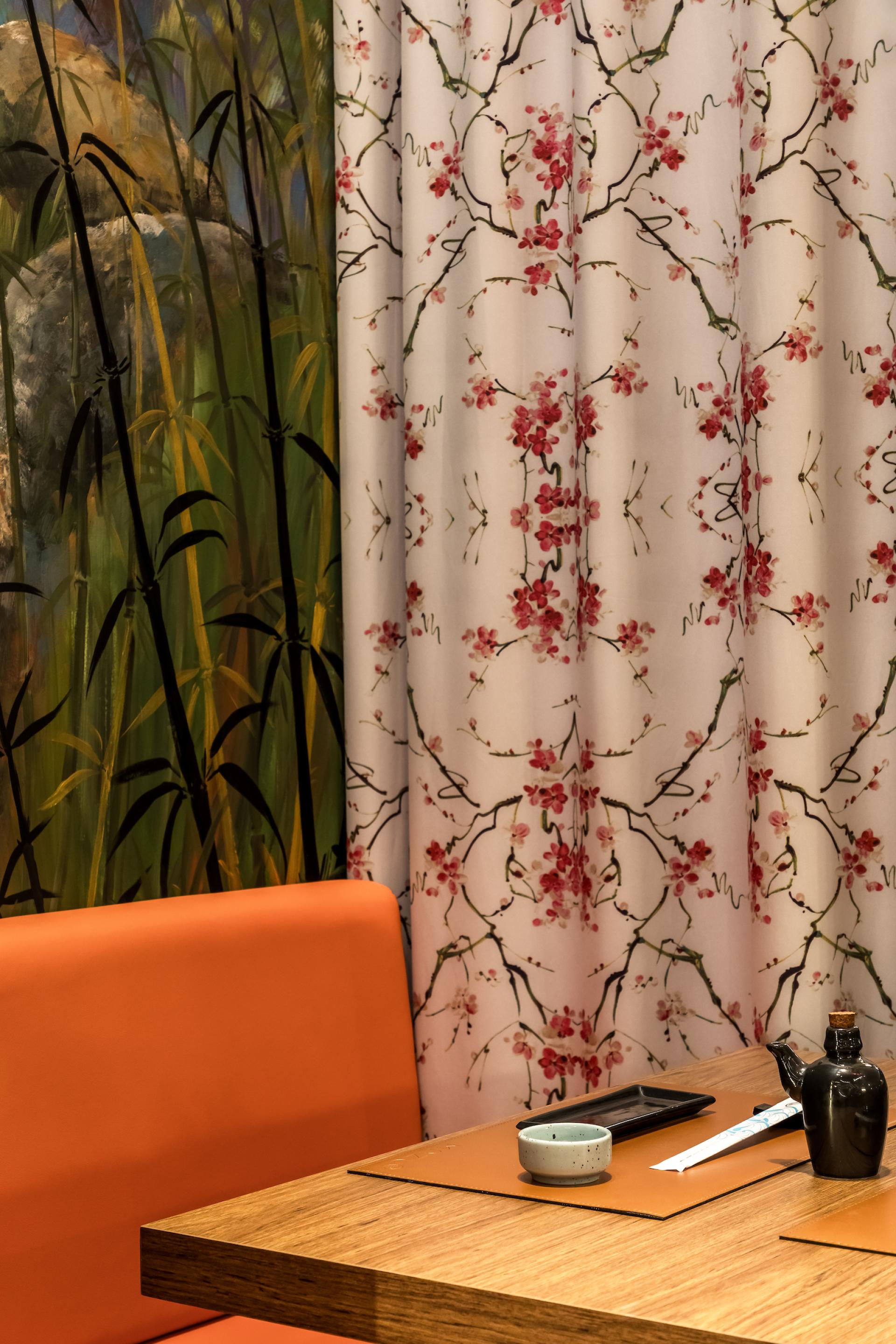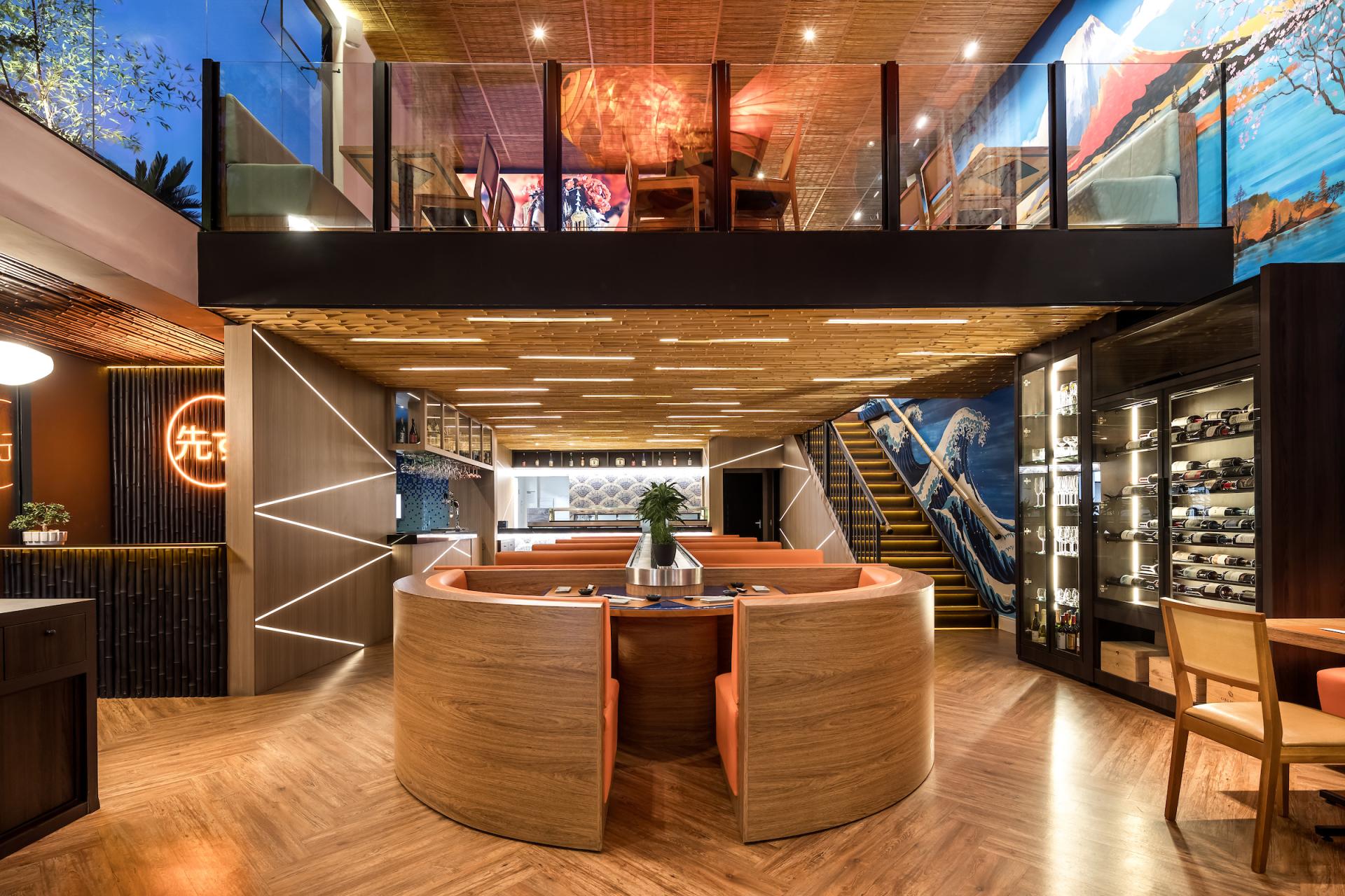 Mazu in Japanese means “first, before anything else”. The restaurant is an immersion in Japanese culture with traditional elements contemporarily applied to it. On Mazu’s ground floor there is an entrance hall, a front room, and a main room with a central conveyor belt (kaiten) that rotates and transports dishes allowing customers to pick them up at will. On the upper floor there is a mezzanine for events and private parties. Natural elements such as bamboo are one of the project protagonists. On the facade, bamboo is employed in circular shapes in different sizes creating a slight undulation. At the restaurant entrance, bamboo appears on the ceiling, wall and reception counter in linear black half-circle shapes. On the ceiling of the main room it emerges in linear inverted half-circle shapes, called “bamboo soul”, in a honey tone with built-in lighting. Furthermore, large bamboos have been used on the handrail of the staircase that leads to the mezzanine. The landscaping of the internal flower box has also been made of bamboo, in its natural form, with lighting coming from the ground. Welcoming our customers, the giant translucent four-meter-long orange fish is one of the restaurant highlights.”Floating” and lit from within it creates, alongside with a local artist hand-painted wall, an impression of waves originating in the Japanese seas. Luminaires reminiscent of Japanese lanterns were designed for the room. A custom fan-shaped coating has been installed at the sushi bar. The cocktail bar also features gradients with glass tiles in shades of blue. The furniture exclusively designed for the restaurant is made of solid wood, fabrics and blue glass. Curtains textured with pink cherry trees fall from the double-height ceiling. Additionally, a Japanese paper pendant illuminates the arrival of customers in the entrance hall. Another mezzanine highlight is a large backlit fabric panel with an image of a geisha. On the upper floor we can, through a glass skin, contemplate the external landscaping which brings Japanese natural elements such as the cherry tree, an illuminated bamboo among other plants.