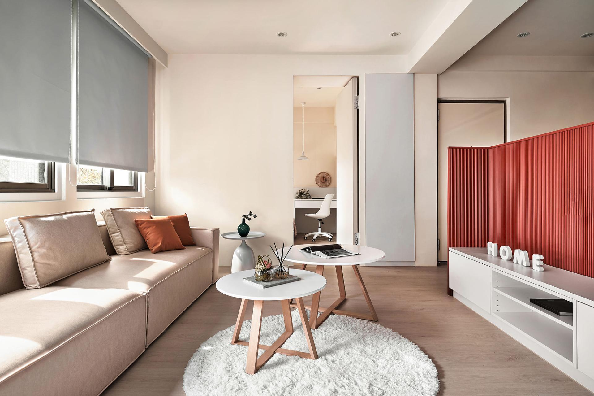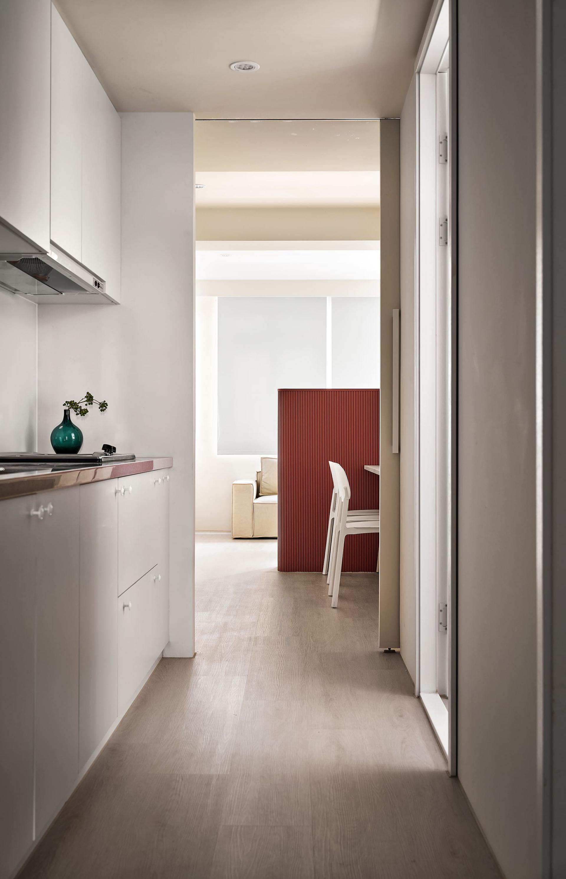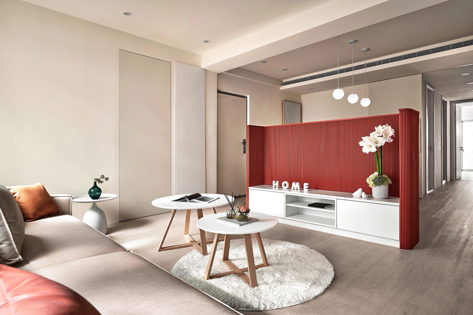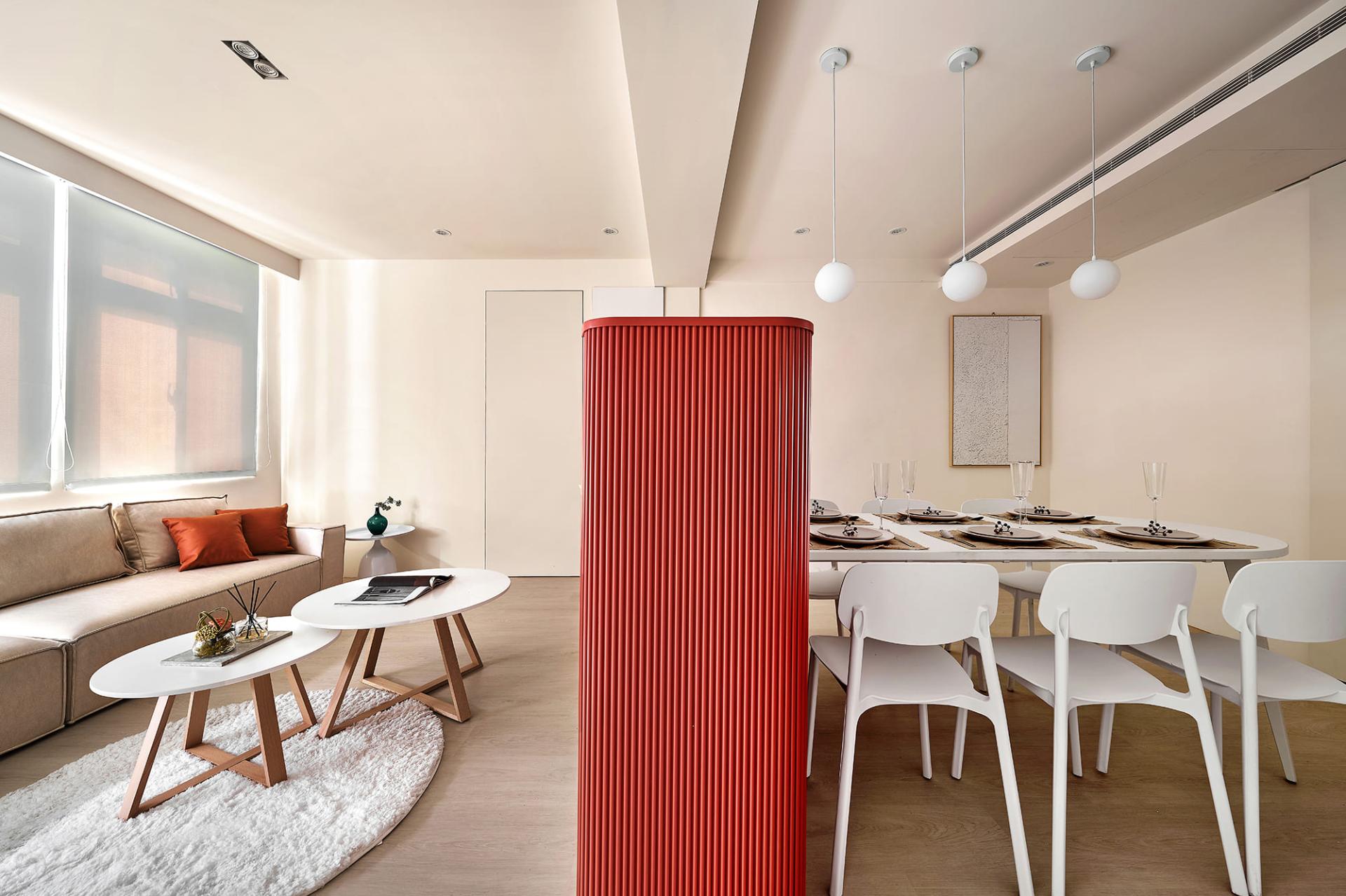 To create a more expansive feel in the public space, the design team strategically rotated the living room by 90 degrees. This thoughtful orientation not only allows for large sofas and coffee tables to be comfortably positioned by the windows but also creates generous passageways flanking the impressive 3.2-meter-wide TV wall. The TV wall itself is a striking feature, adorned with a rich brick-red, lattice-patterned surface crafted from bendable panels. Each groove is meticulously fashioned through precise sewing techniques, showcasing a commitment to intricate craftsmanship. In addition to these visual elements, half-height walls and softly rounded curves enhance the openness of the living area, promoting a seamless flow throughout the space. Moreover, the kitchen is thoughtfully situated on one side of the corridor, effectively expanding the dining area and enriching the overall functionality of the home.