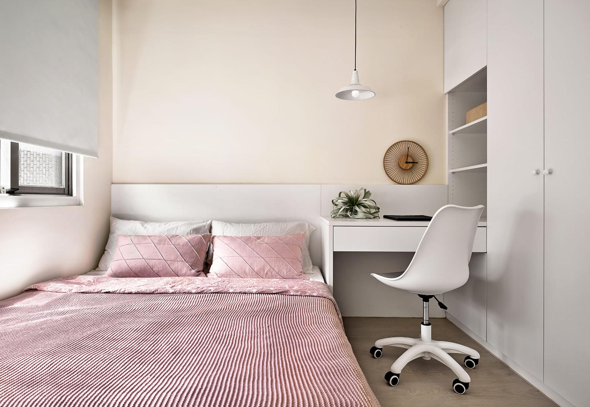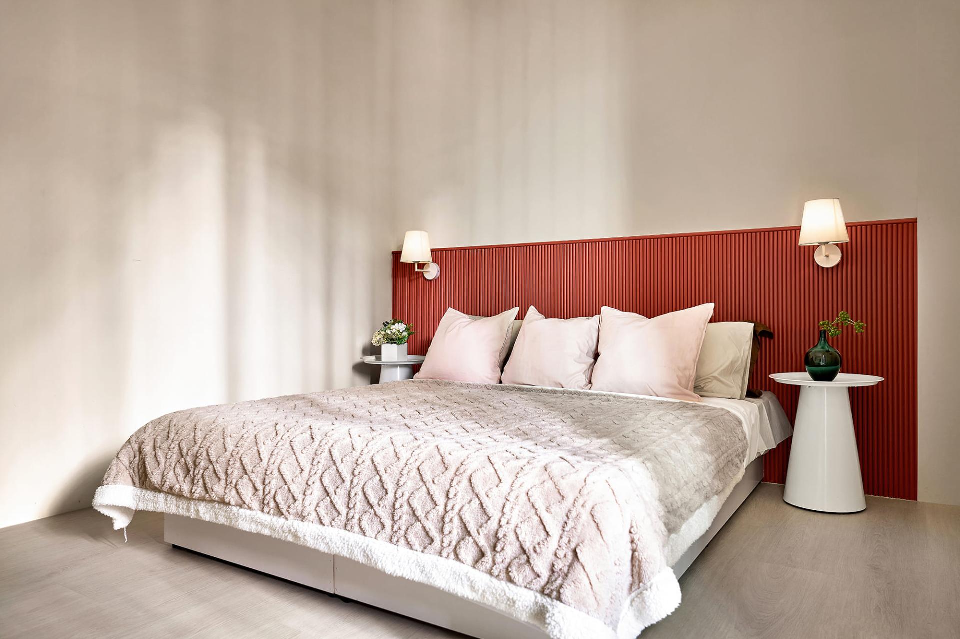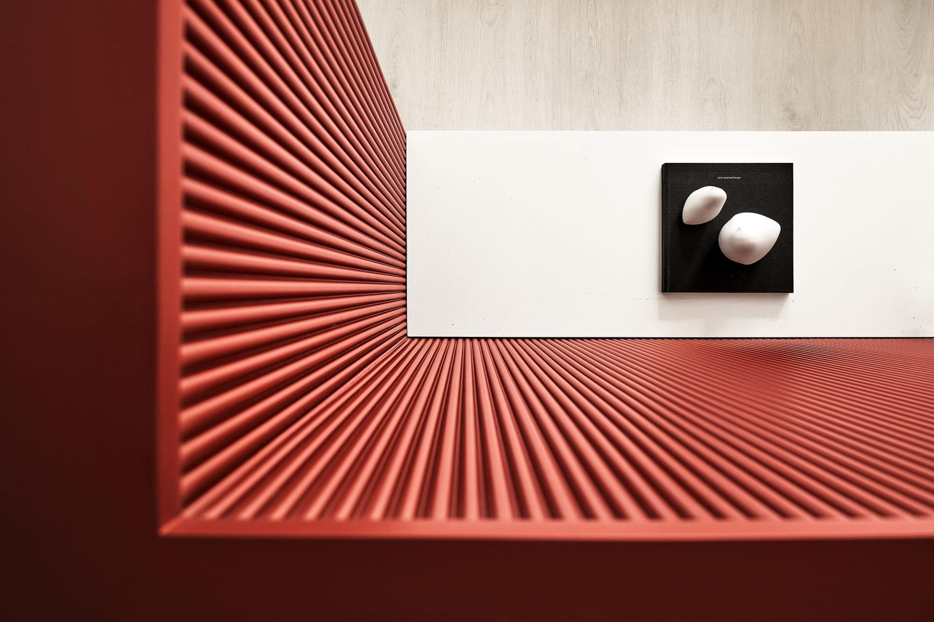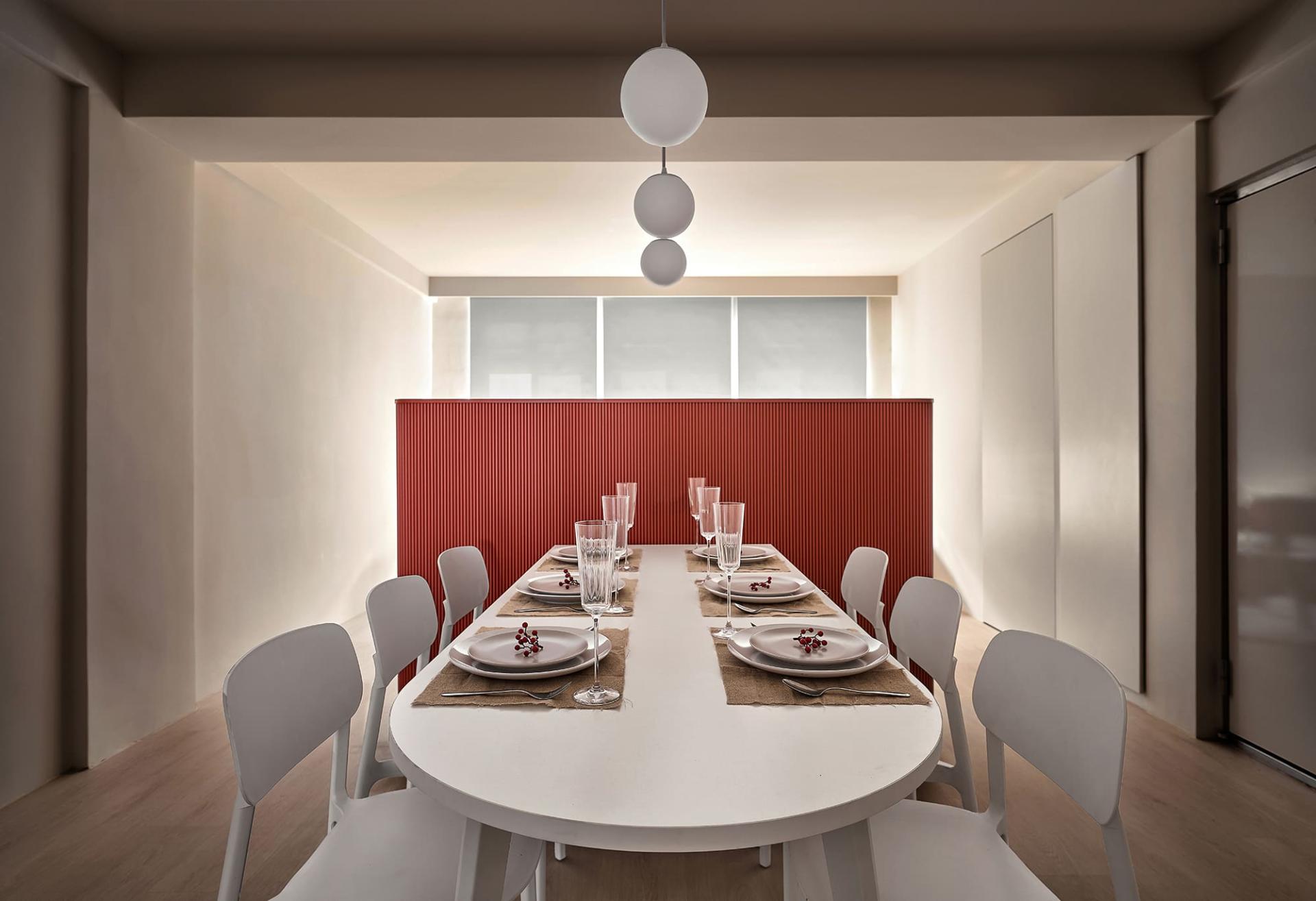 To create a more expansive feel in the public space, the design team strategically rotated the living room by 90 degrees. This thoughtful orientation not only allows for large sofas and coffee tables to be comfortably positioned by the windows but also creates generous passageways flanking the impressive 3.2-meter-wide TV wall. The TV wall itself is a striking feature, adorned with a rich brick-red, lattice-patterned surface crafted from bendable panels. Each groove is meticulously fashioned through precise sewing techniques, showcasing a commitment to intricate craftsmanship. In addition to these visual elements, half-height walls and softly rounded curves enhance the openness of the living area, promoting a seamless flow throughout the space. Moreover, the kitchen is thoughtfully situated on one side of the corridor, effectively expanding the dining area and enriching the overall functionality of the home.
